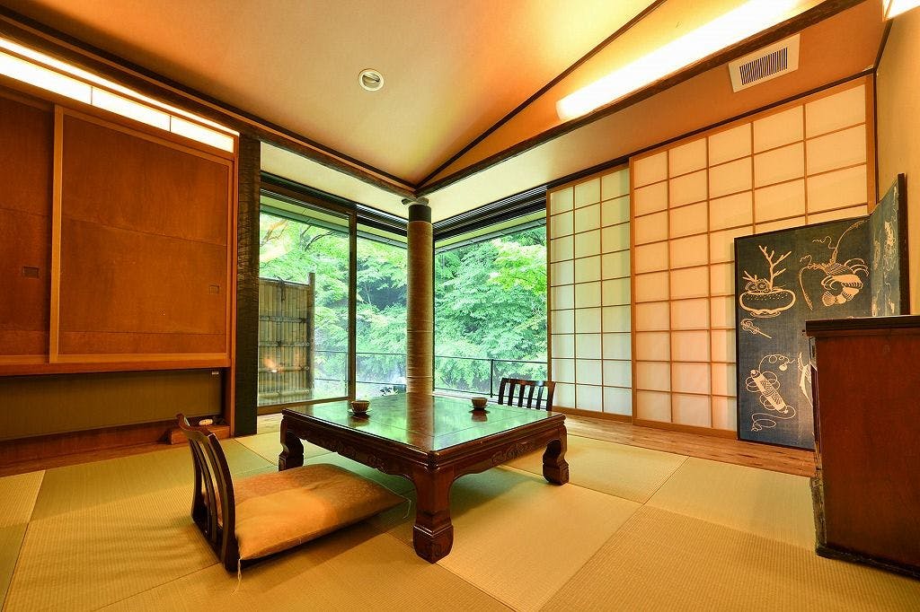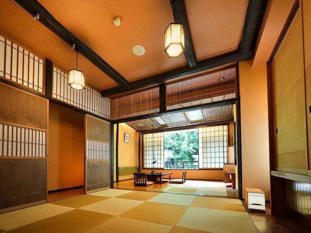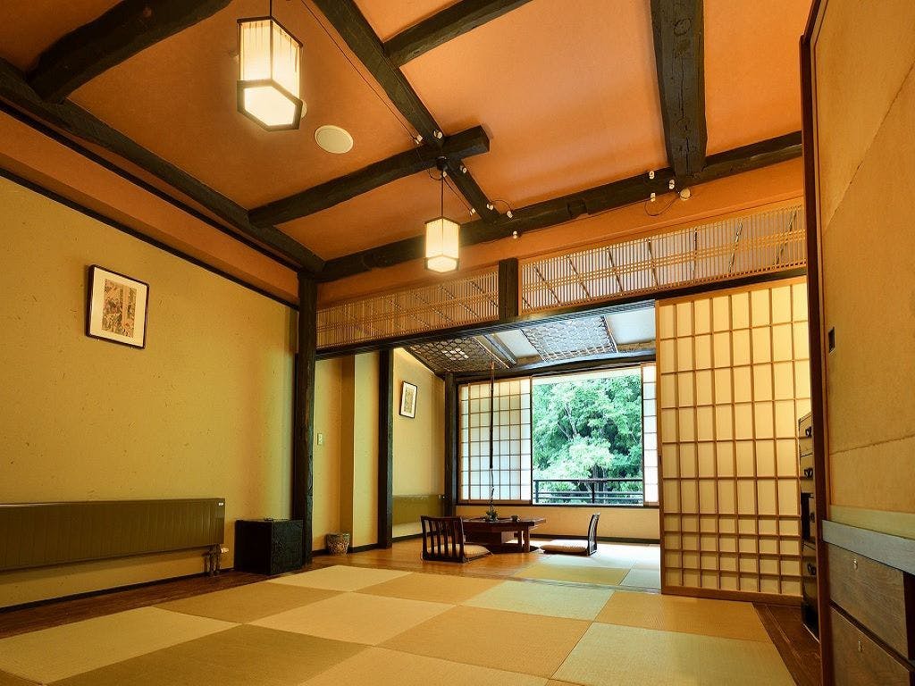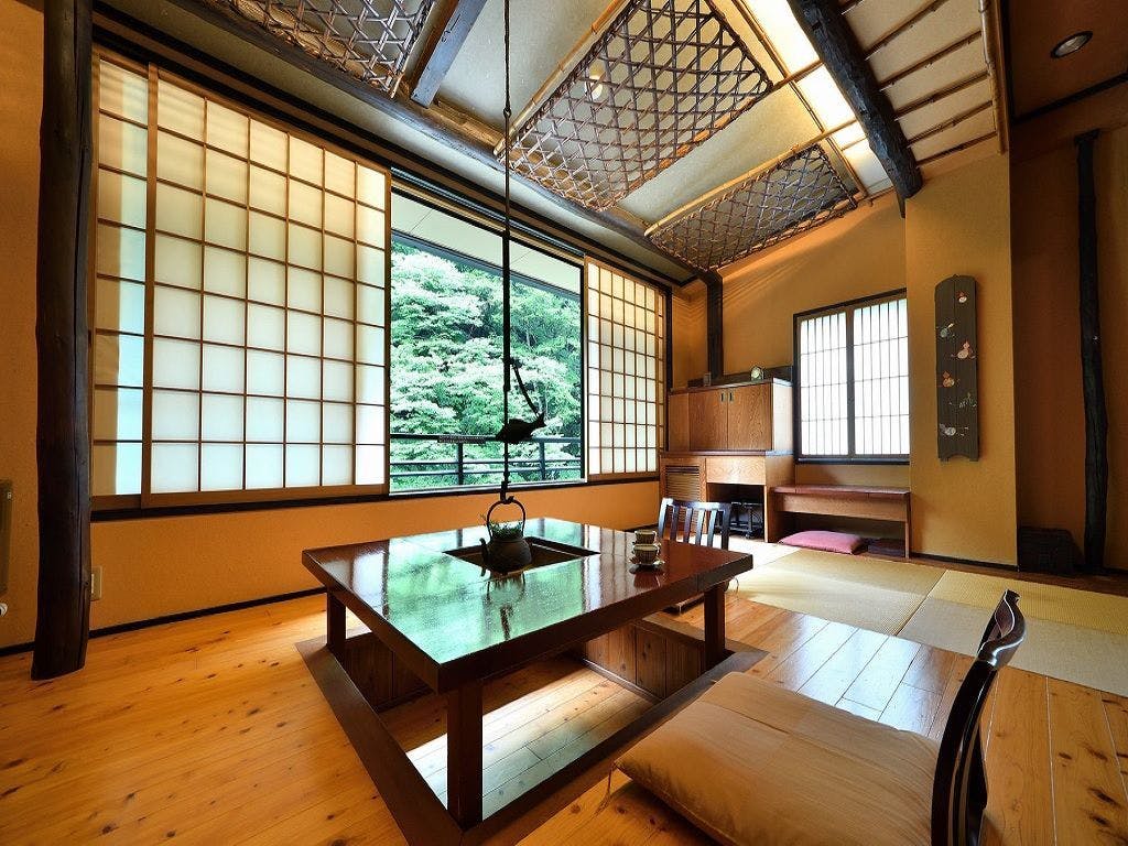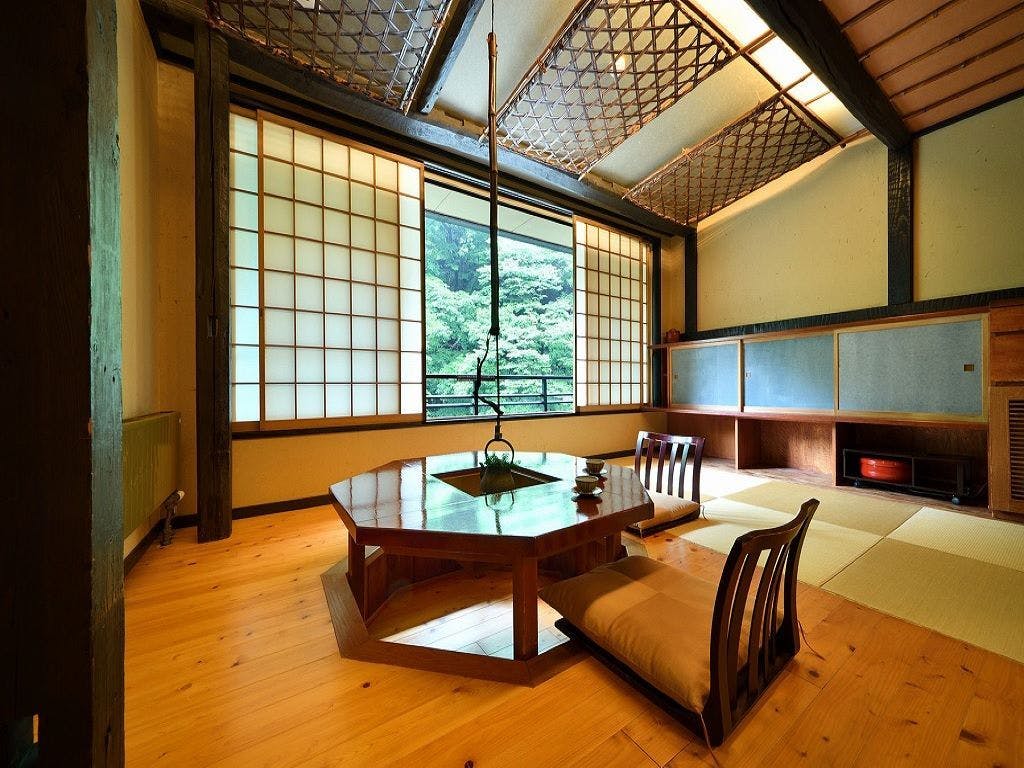 せせらぎ館東側角部屋で、絶景のお部屋。囲炉裏の間から玄関まで廊下が設備され、ゆとりある客室タイプです。※全ての客室を禁煙とさせていただいております。(電子たばこも含む)お煙草を吸われるお客様は、館内指定の場所にて喫煙をしていただきますよう、ご理解ご協力の程お願い申し上げます。