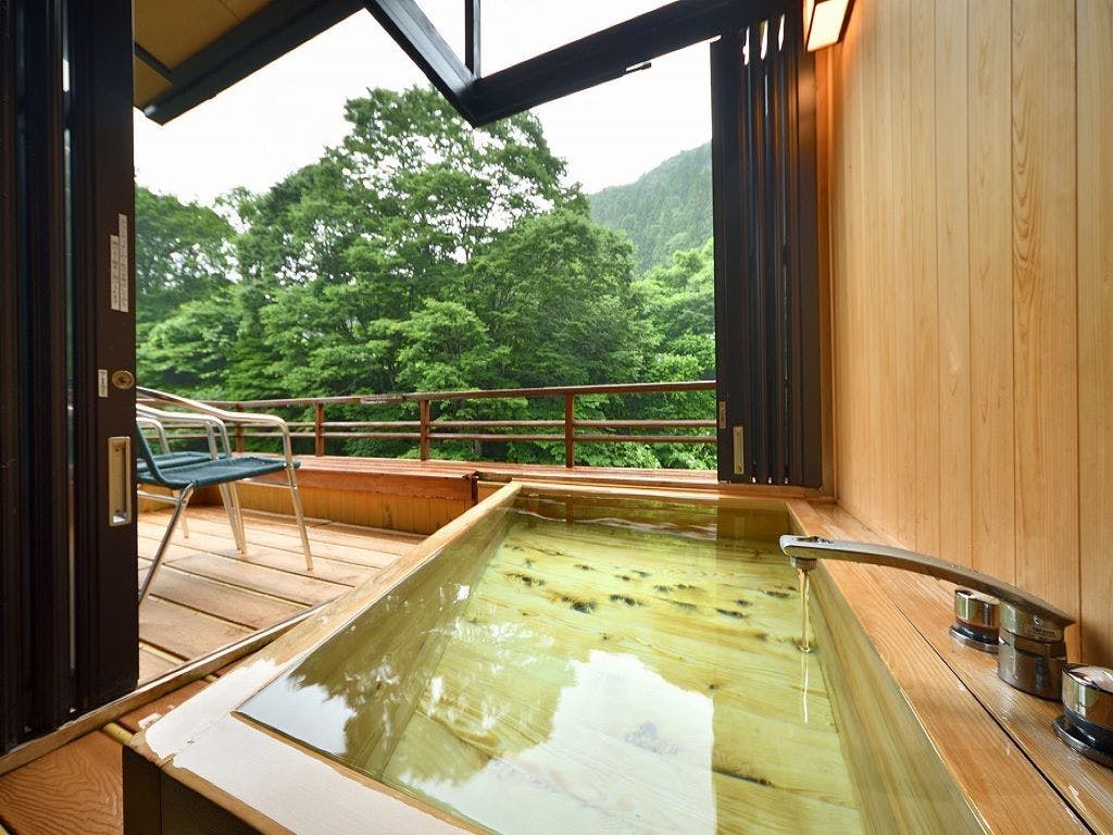 檜の半露天風呂が魅力のお部屋です。客室内に展示された由緒ある古民具が古き良き日本を彷彿とさせます。※客室のお風呂は温泉ではありません。※全ての客室を禁煙とさせていただいております。(電子たばこも含む)お煙草を吸われるお客様は、館内指定の場所にて喫煙をしていただきますよう、ご理解ご協力の程お願い申し上げます。