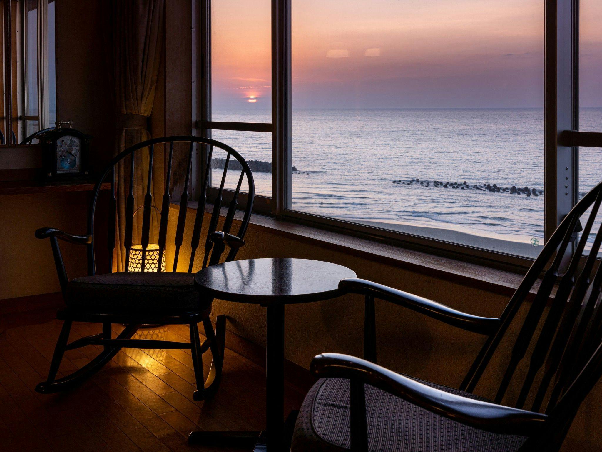 海岸が目の前に広がるお部屋で、紅い夕陽が蒼い海に沈む様子を