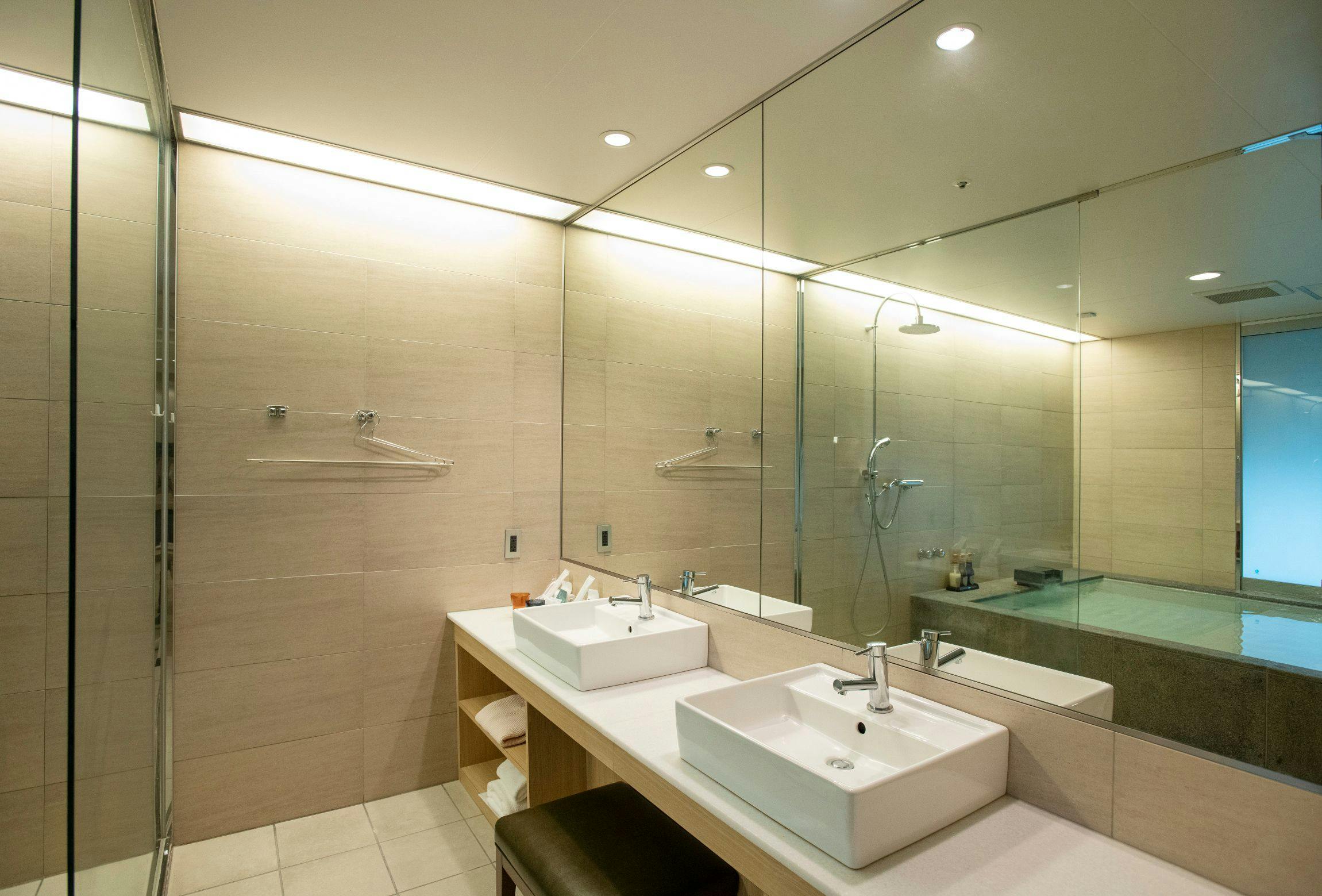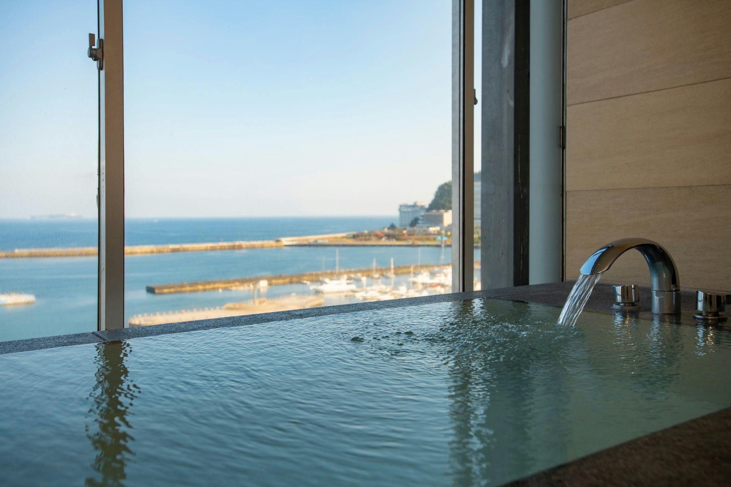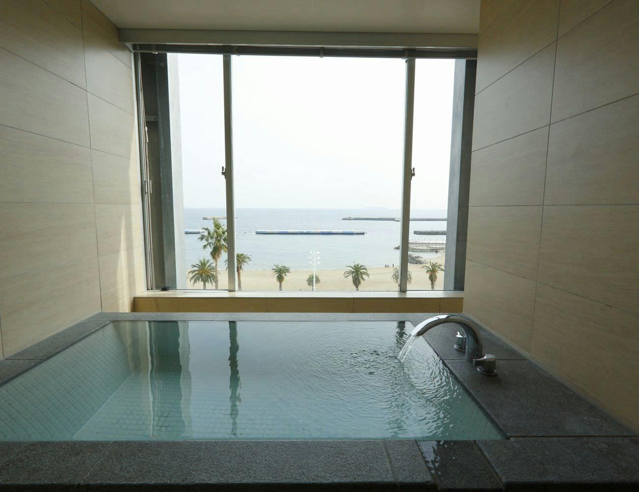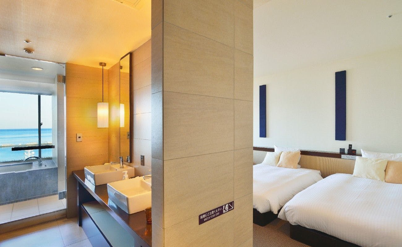 9階~12階の高層階フロア確約の客室<高層階から海を眺めるオーシャンビュールーム>■レインシャワー&海の見える“ビューバス”■シモンズ社製ベッド:200×120 2~3台 ■液晶フラットTV ■テーブル・椅子 ■DVD/CDプレイヤー■洗面台2台:ダブルベイシン ■セーフティボックス(金庫)※客室のお風呂は温泉ではありません、予めご了承ください。