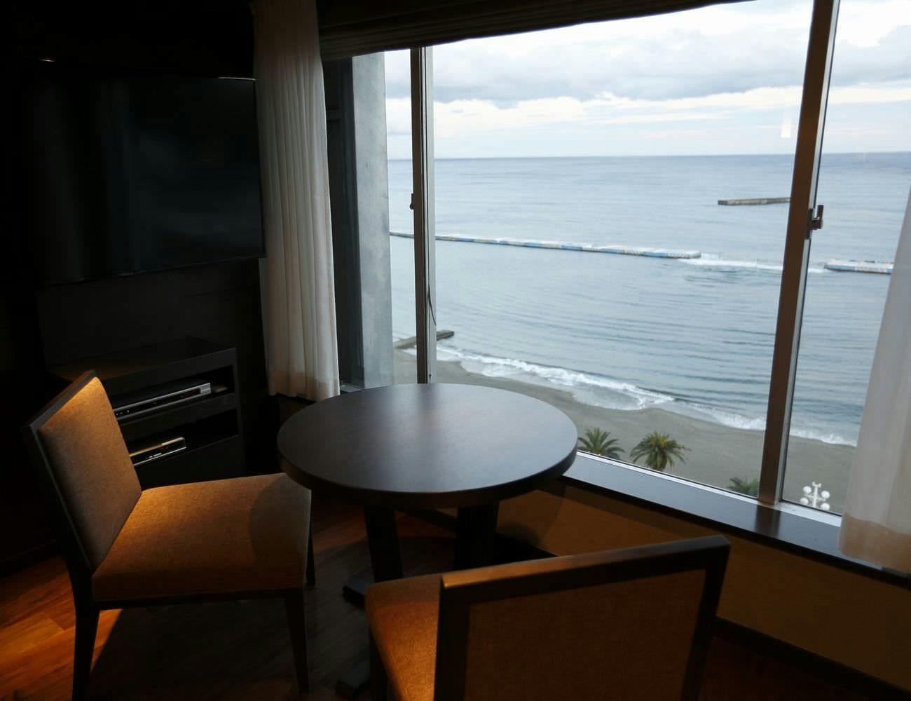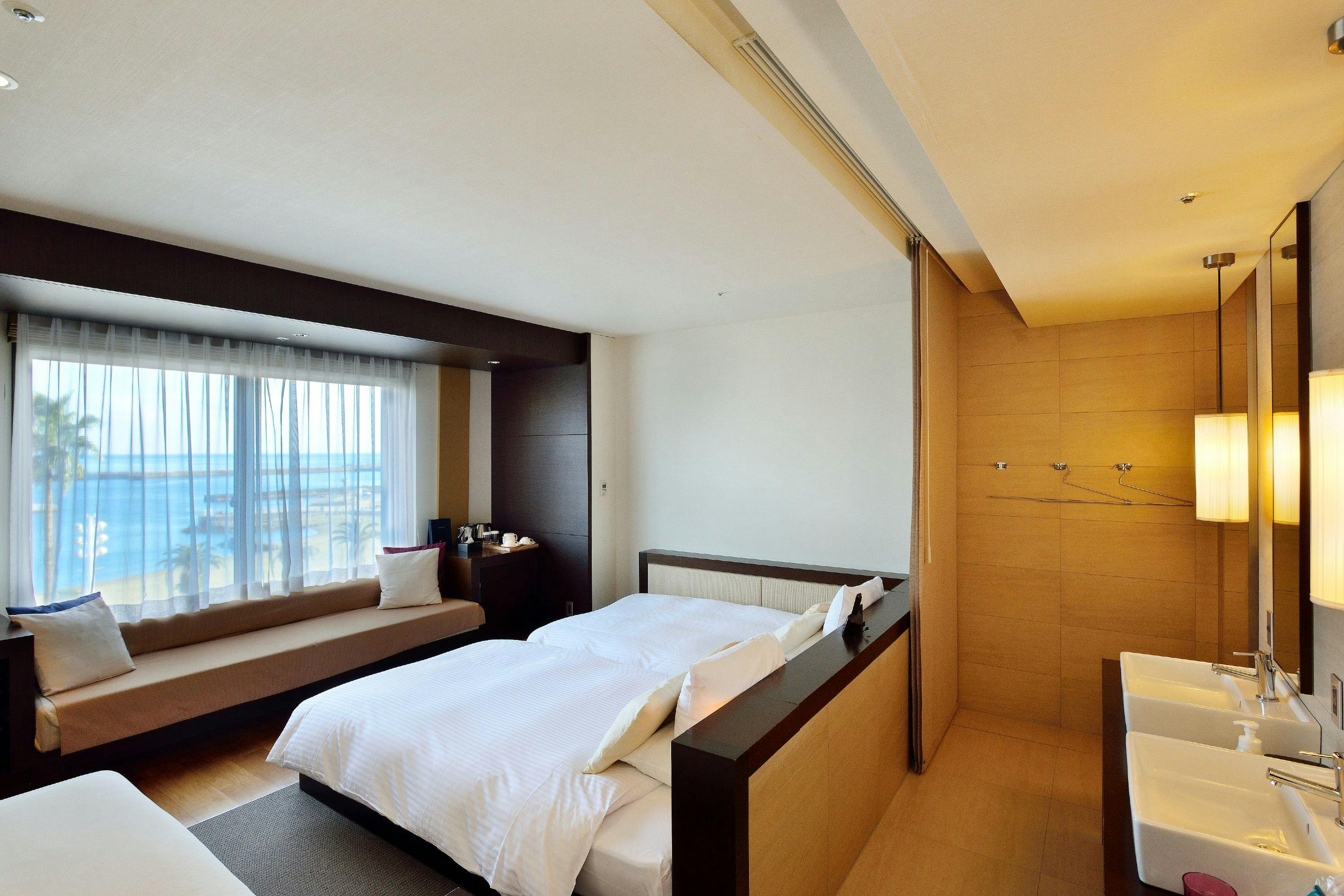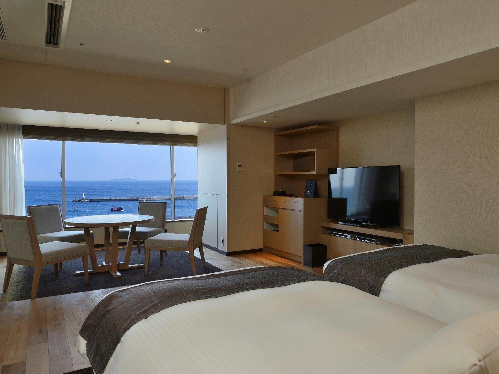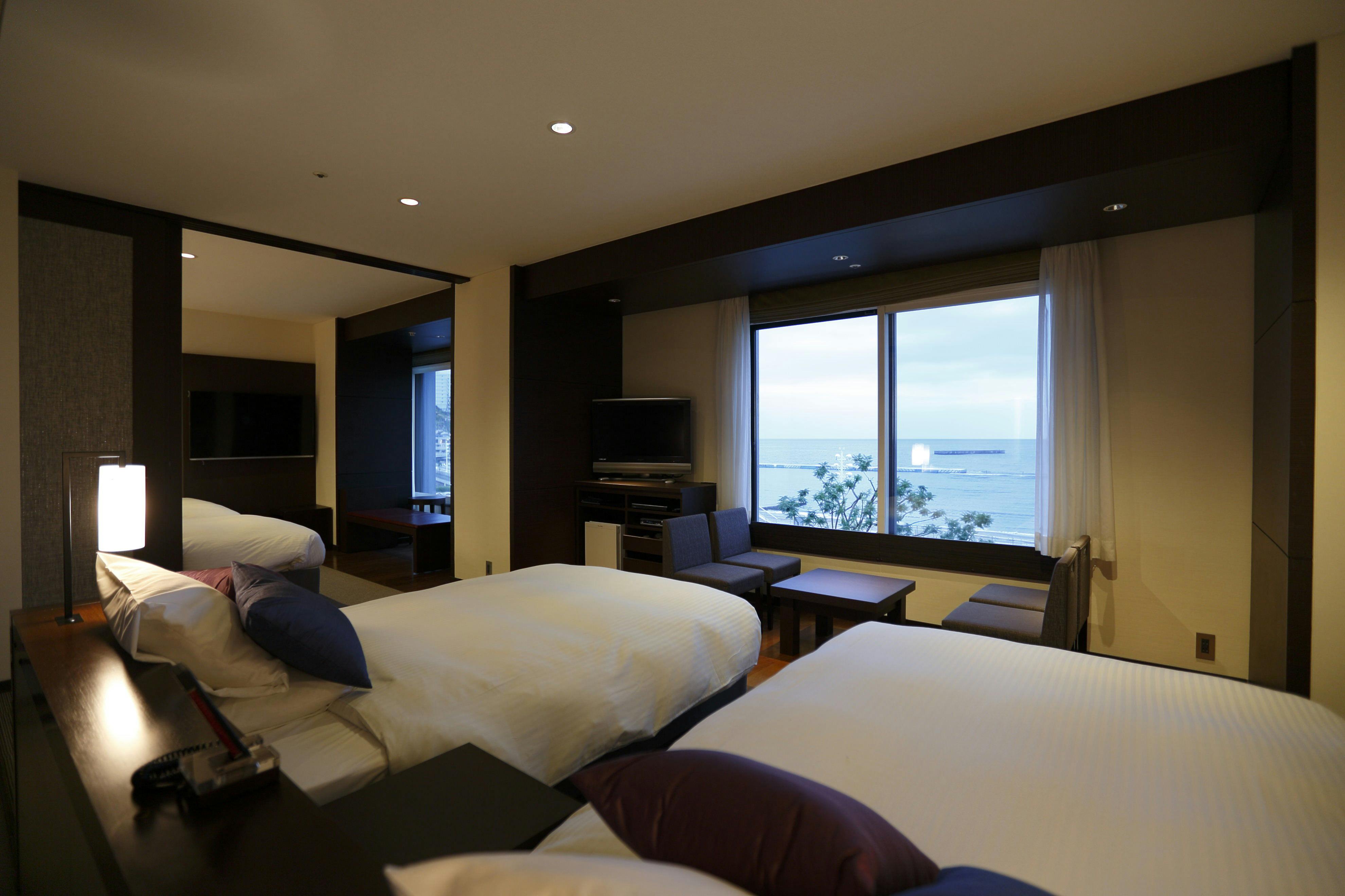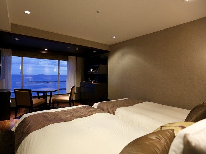9階~12階の高層階フロア確約の客室<高層階から海を眺めるオーシャンビュールーム>■レインシャワー&バス ■シモンズ社製ベッド:200×120(4台)■椅子・テーブル ■DVD/CDプレイヤー ■洗面台2台:ダブルベイシン ■セーフティボックス(金庫)※客室のお風呂は温泉ではありません、予めご了承ください。