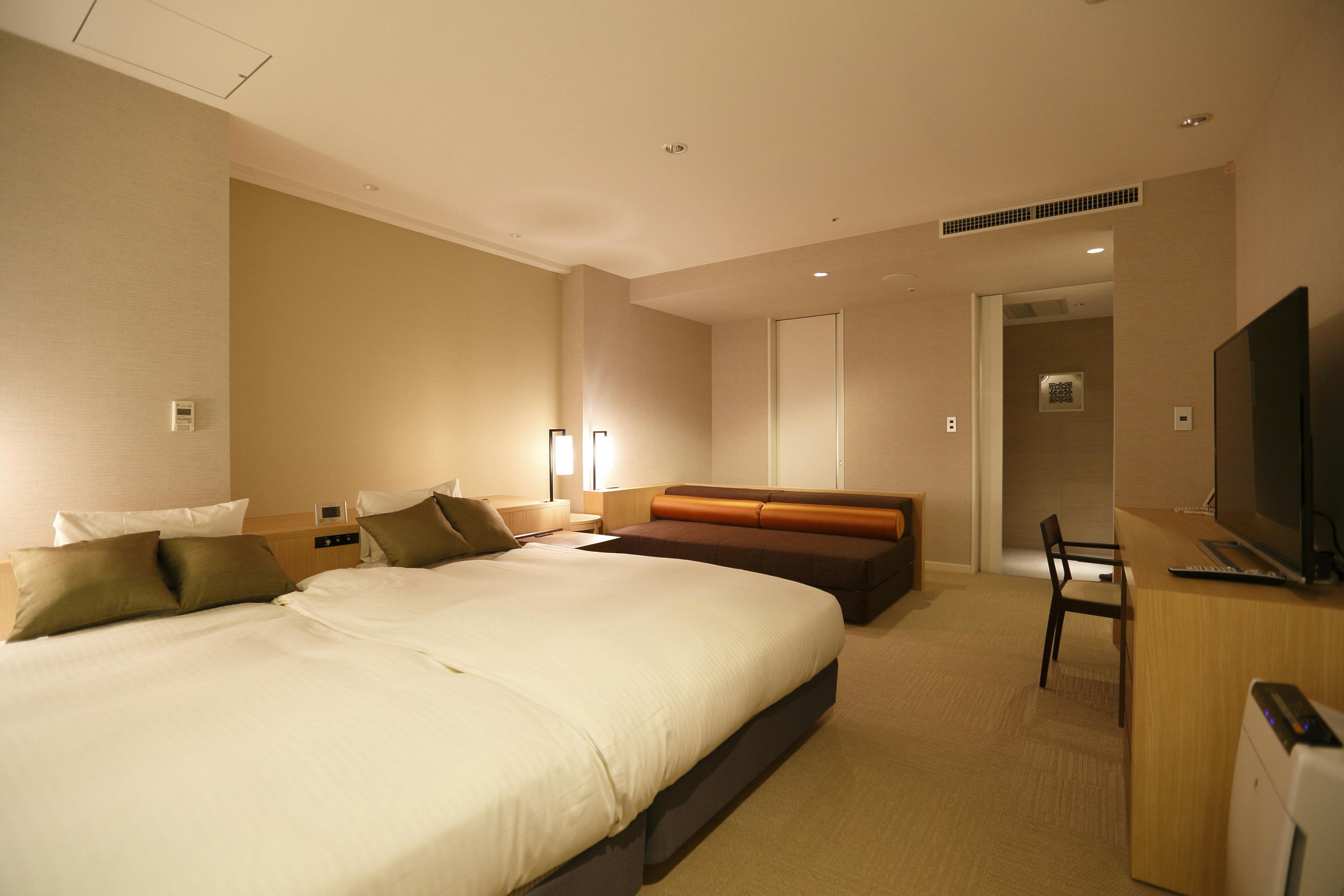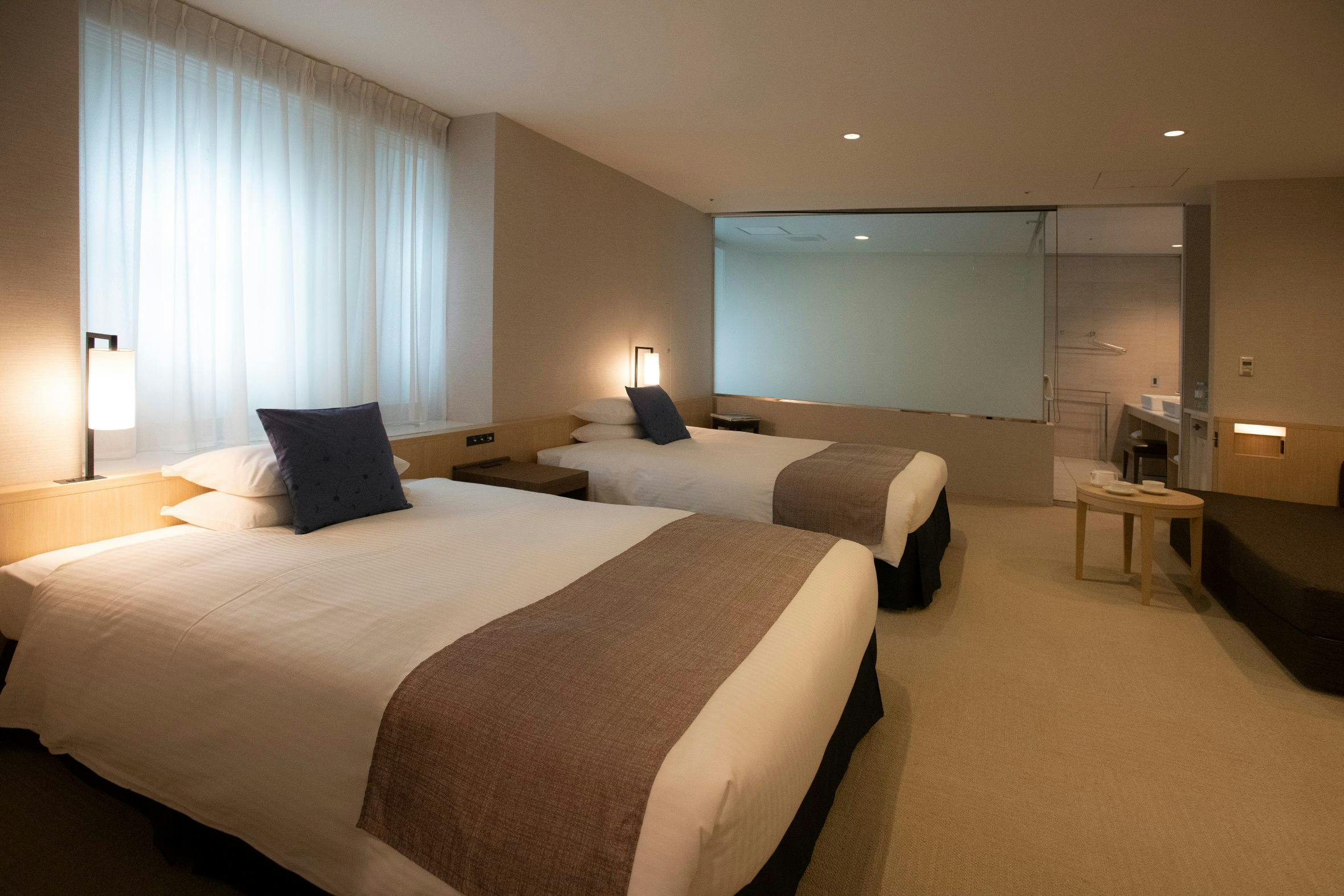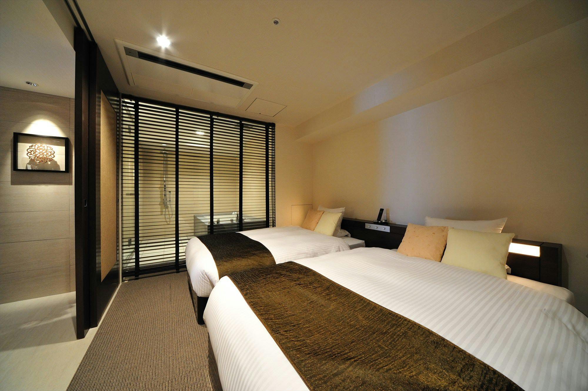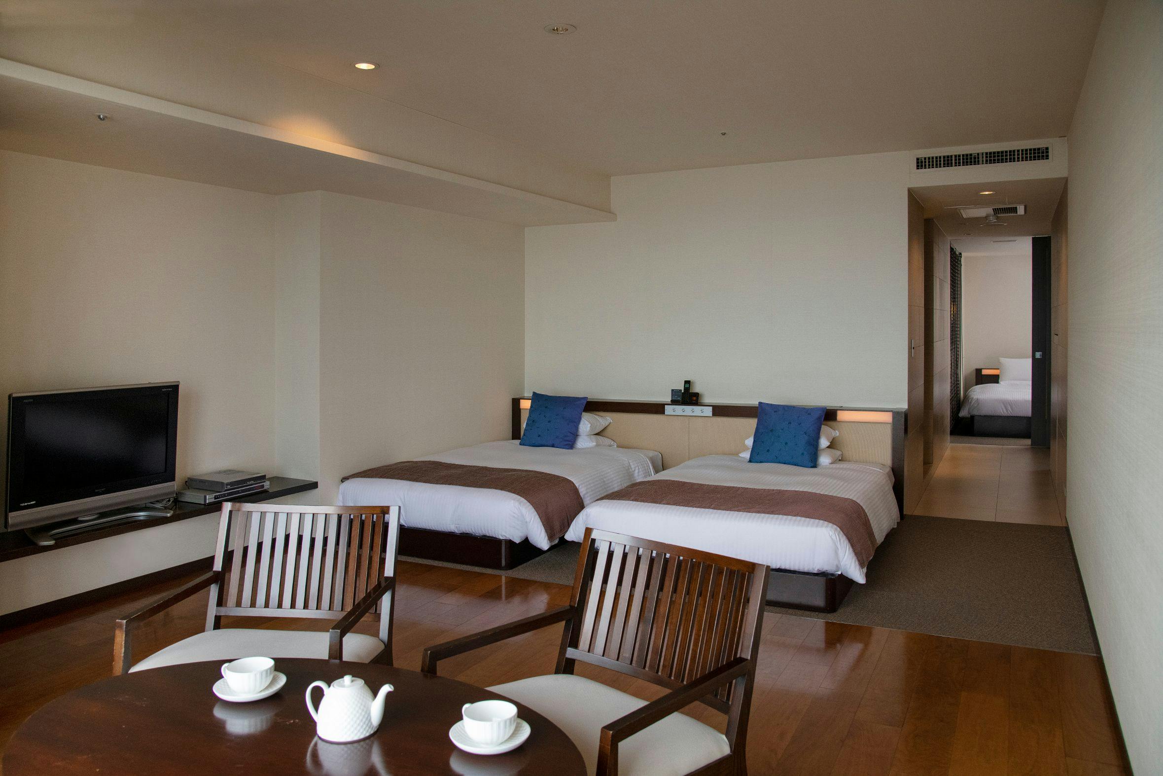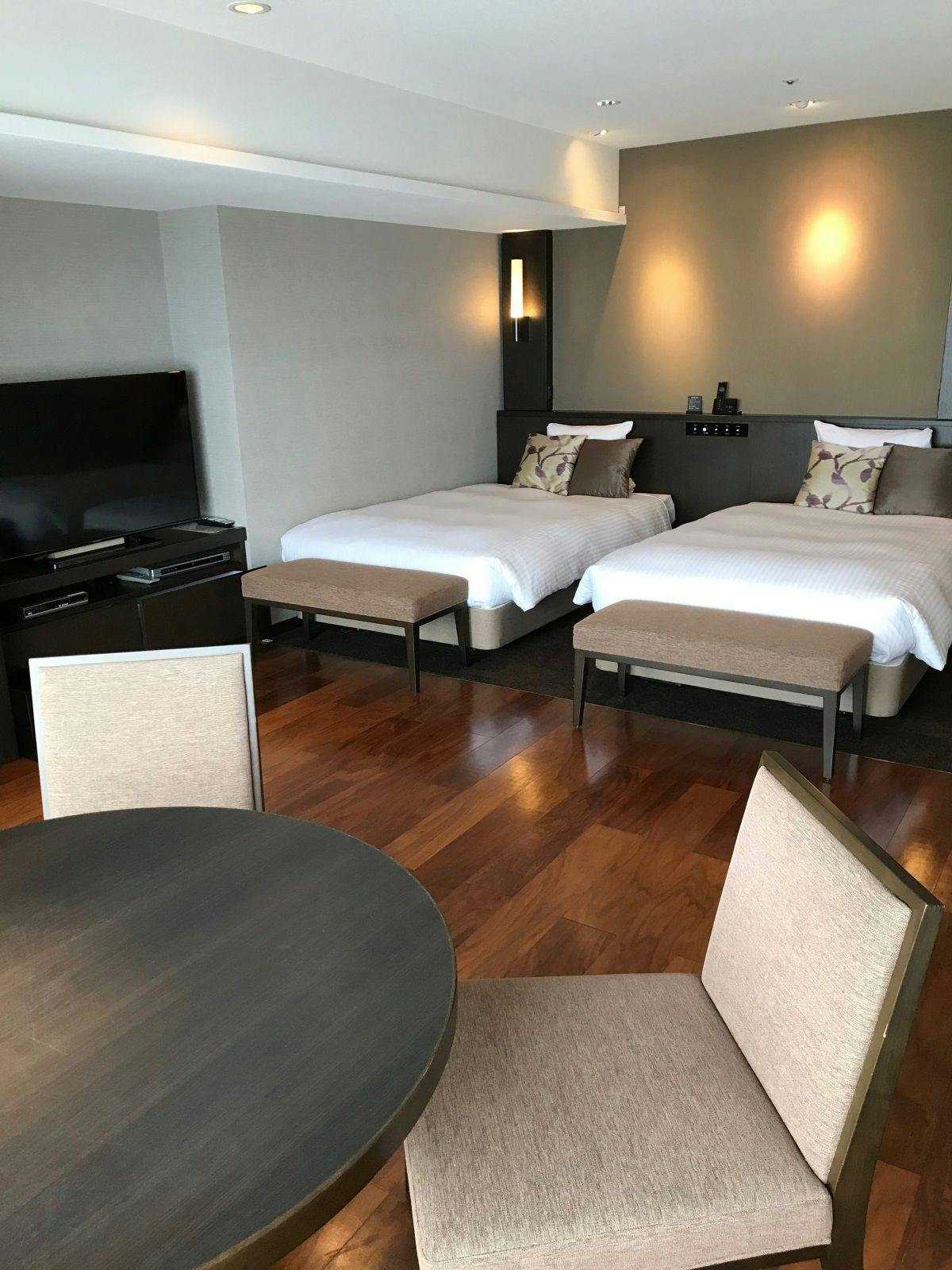 9階~12階の高層階フロア確約の客室<高層階から海を眺めるオーシャンビュールーム>■レインシャワー&バス ■シモンズ社製ベッド:200×120(4台)■椅子・テーブル ■DVD/CDプレイヤー ■洗面台2台:ダブルベイシン ■セーフティボックス(金庫)※客室のお風呂は温泉ではありません、予めご了承ください。