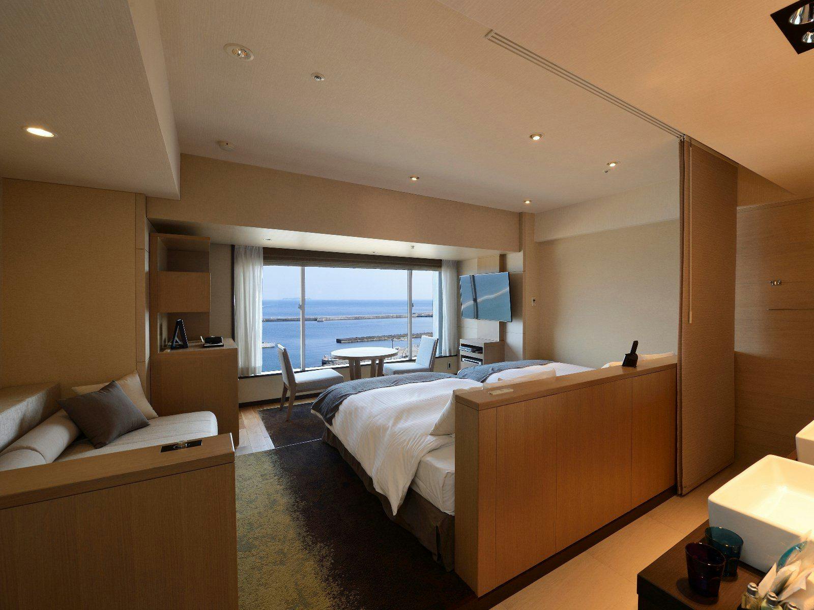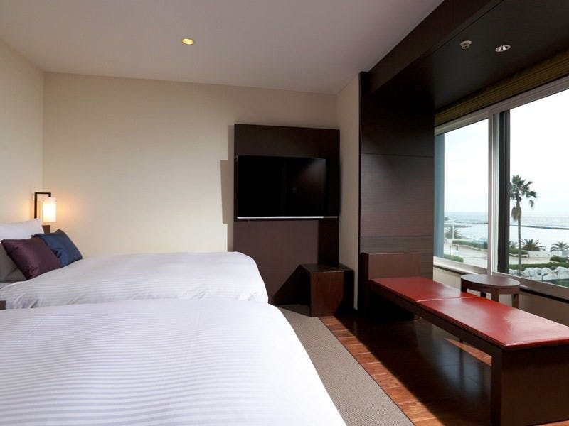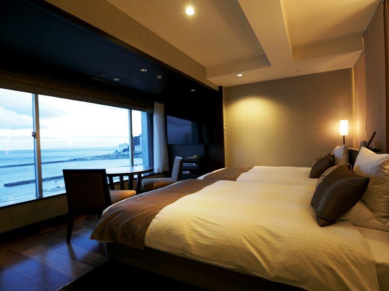 19時以降チェックイン限定ルーム禁煙・喫煙のご指定はできません。予めご了承ください<客室は相模湾を望むオーシャンビューです>○シモンズ社製ベッド:2,000mm × 1,150mm○液晶フラットTV32インチ(SHARP AQUOS)○DVD・CD複合UNIT完備(フロントにてDVDの貸出し有)○洗面台:Wベイシング○セーフティーボックス(金庫)○シャワーブース
