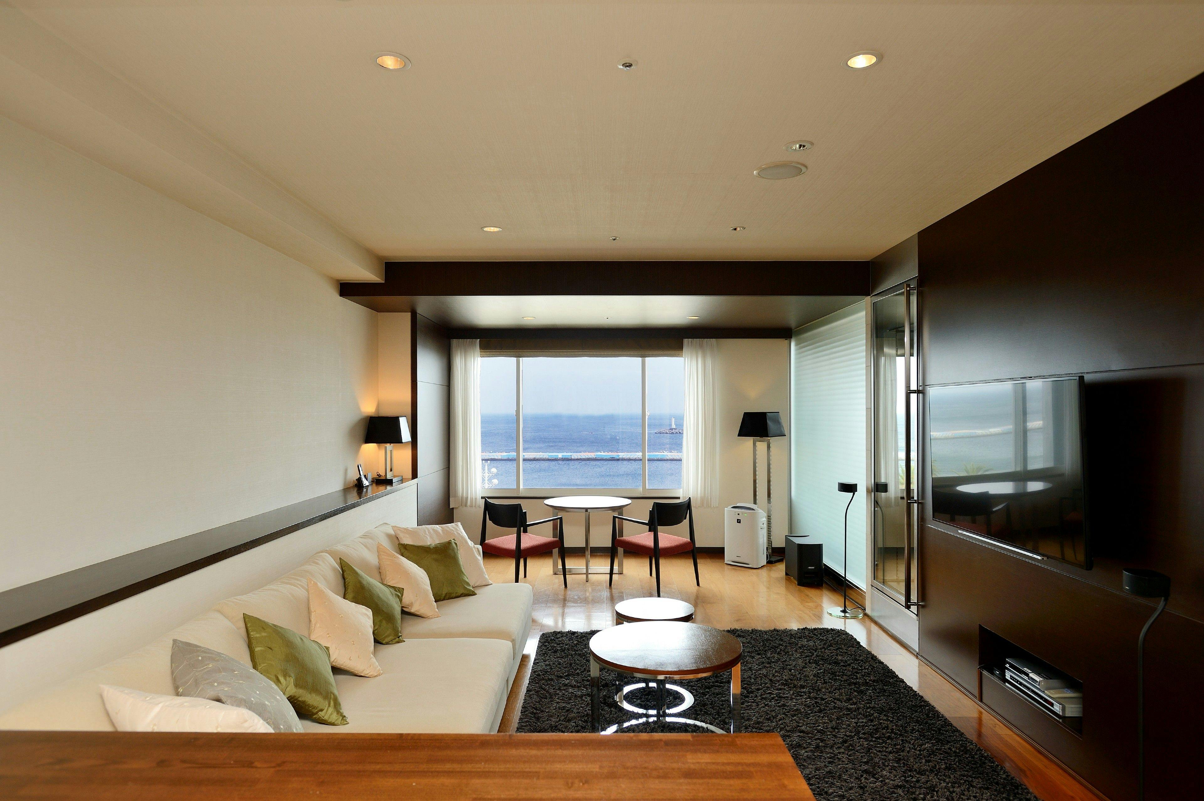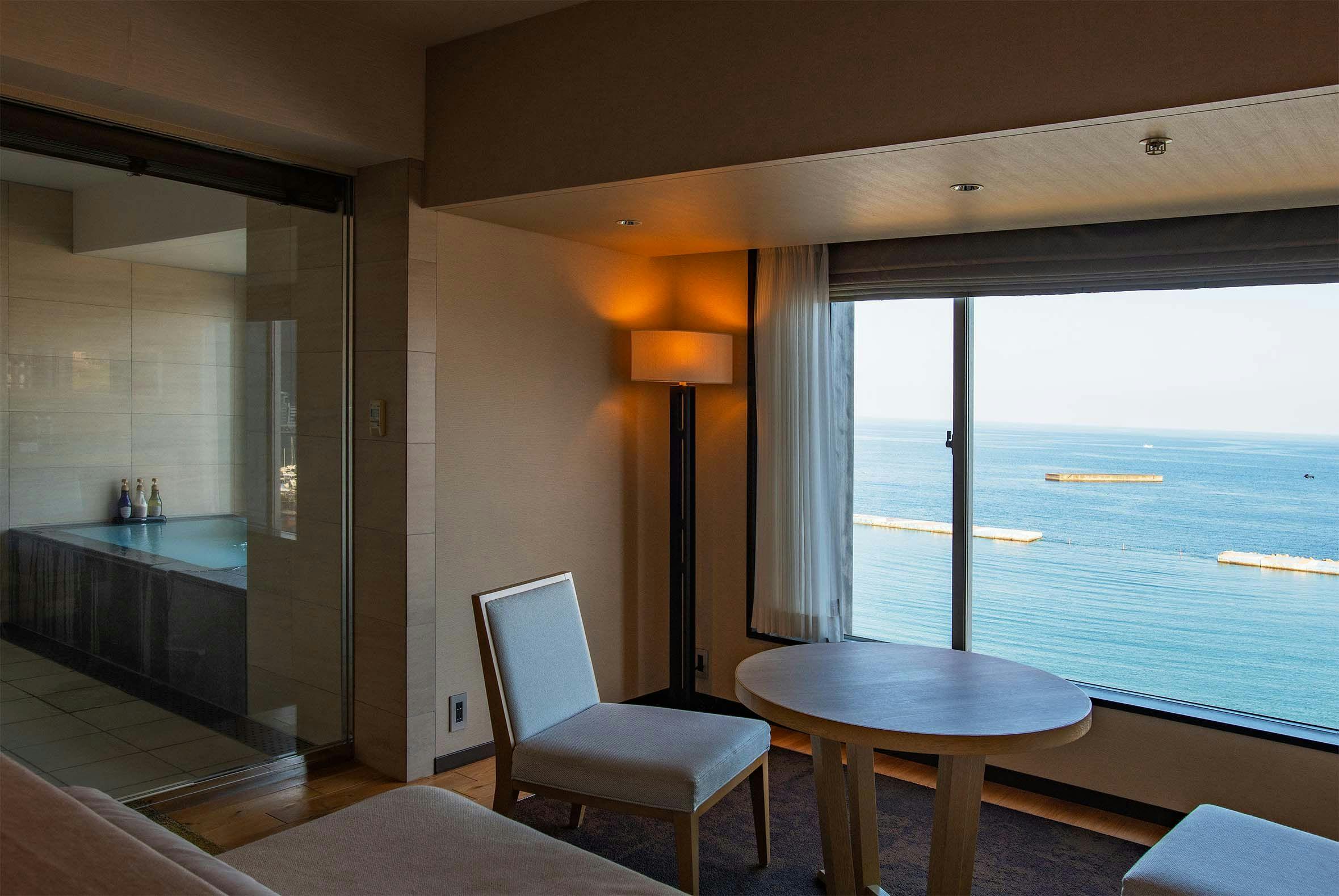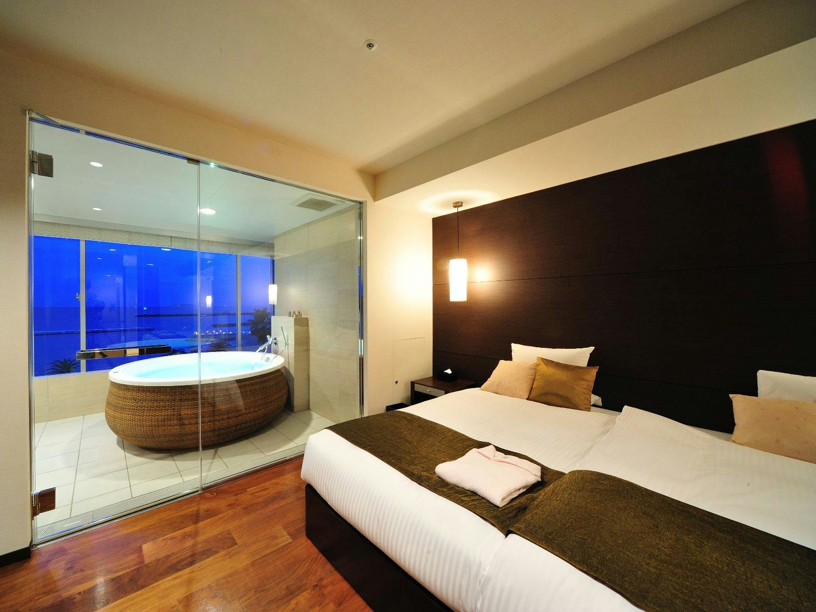 1日1室限定のスイートルーム。リビングとベッドルームが独立した贅沢な間取りです。※室内にスパ施術室がございます。(有料/要事前予約)<海を眺めるオーシャンビュールーム>■レインシャワー&海の見える“ビューバス”■シモンズ社製ベッド:200×120 2台 ■液晶TVリビング57インチ、ベッドルーム32インチ■テーブル・椅子 ■DVD/CDプレイヤー■洗面台2台:ダブルベイシン ■セーフティボックス(金庫)※客室のお風呂は温泉ではありません、予めご了承ください。