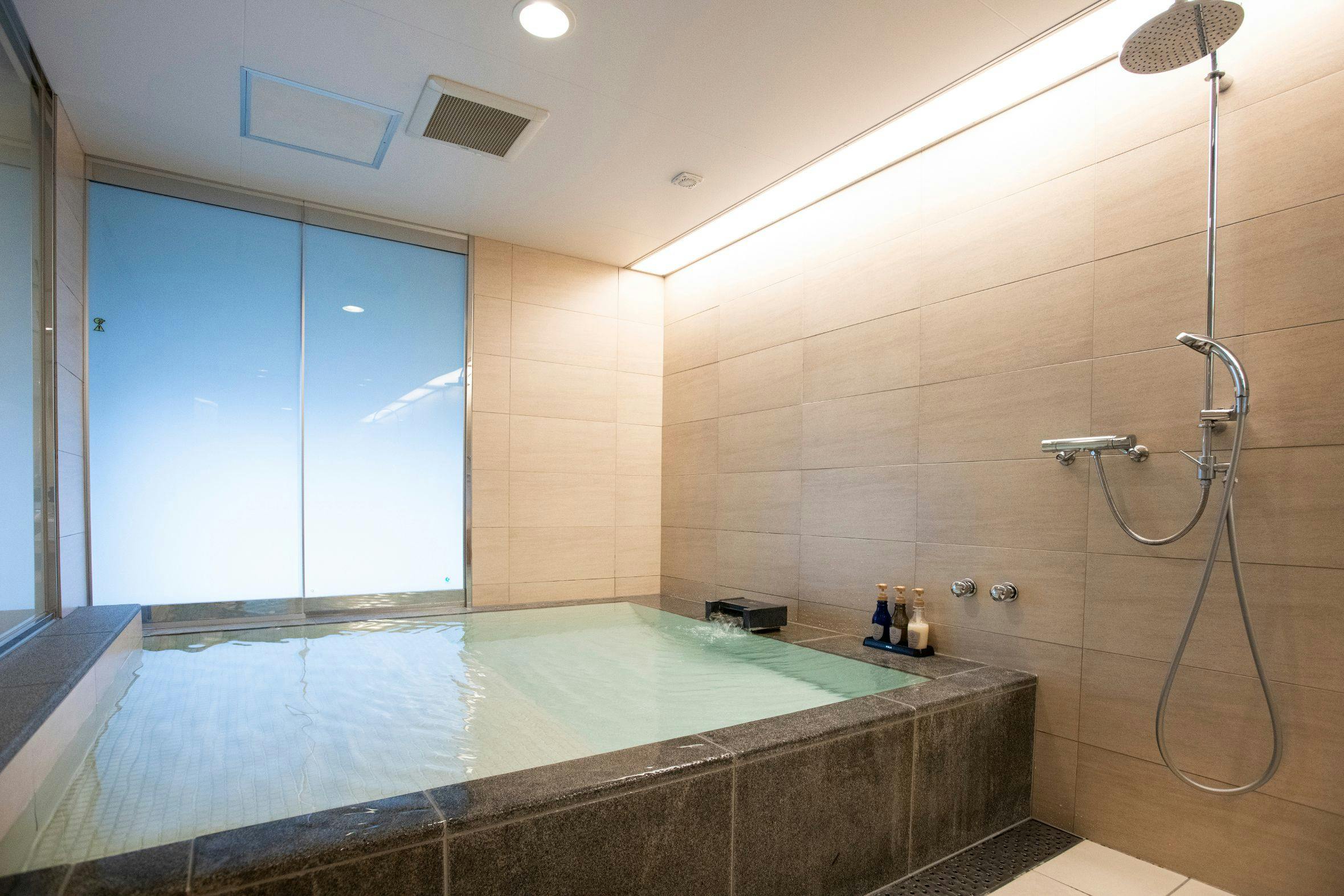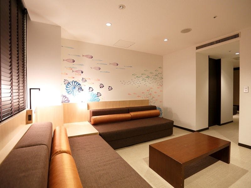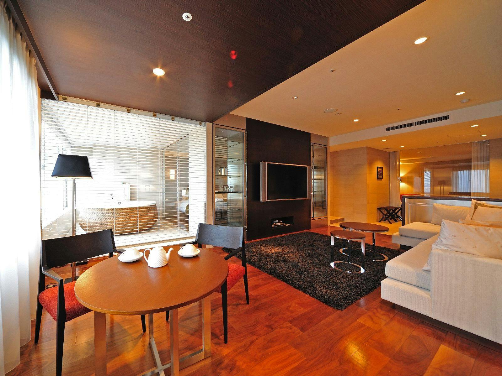 1日1室限定のスイートルーム。リビングとベッドルームが独立した贅沢な間取りです。※室内にスパ施術室がございます。(有料/要事前予約)<海を眺めるオーシャンビュールーム>■レインシャワー&海の見える“ビューバス”■シモンズ社製ベッド:200×120 2台 ■液晶TVリビング57インチ、ベッドルーム32インチ■テーブル・椅子 ■DVD/CDプレイヤー■洗面台2台:ダブルベイシン ■セーフティボックス(金庫)※客室のお風呂は温泉ではありません、予めご了承ください。