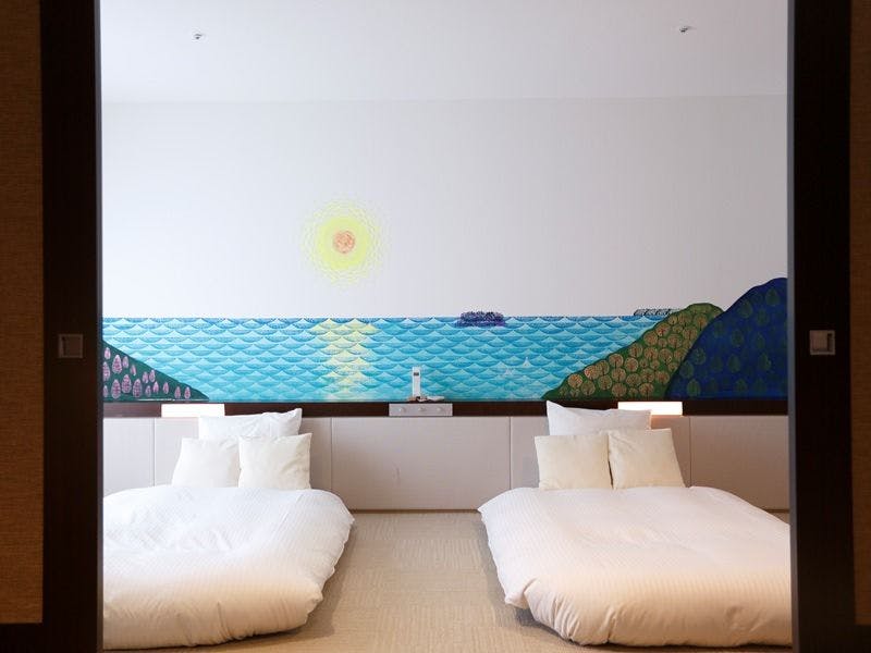 熱海の消しゴムハンコ作家、津久井智子さん監修・作成の壁紙アートルームです。※海側と反対向きとなる為、眺望はございません。■60インチ液晶テレビ ■室内大型温泉浴槽付■セーフティボックス(金庫)■洗面台2台:ダブルベイシン ■セーフティボックス(金庫)※窓は明り取りの窓となり、開閉できません。※お風呂は露天風呂ではございません。