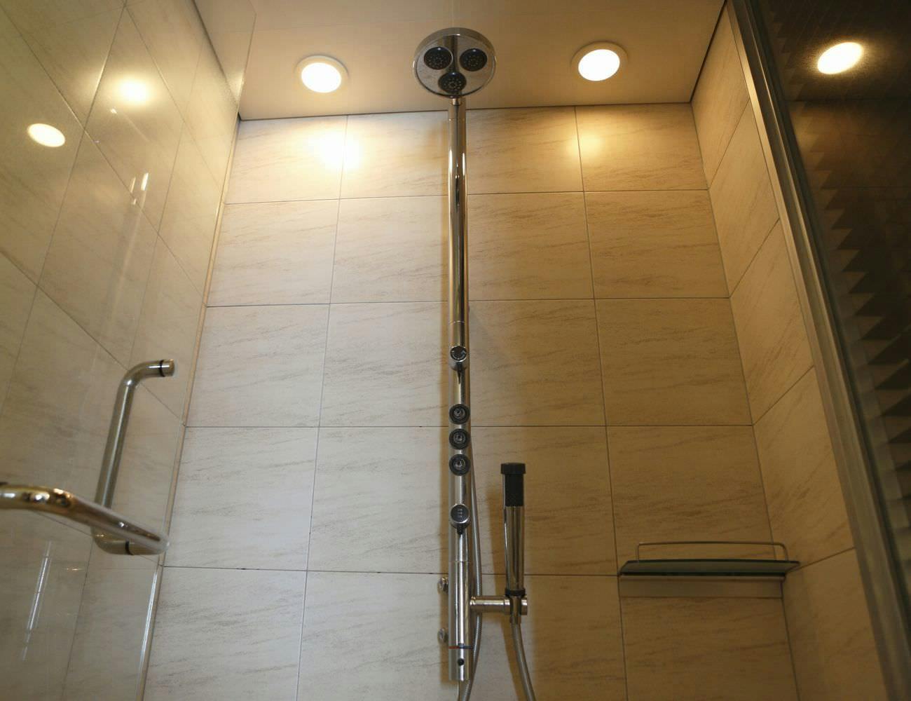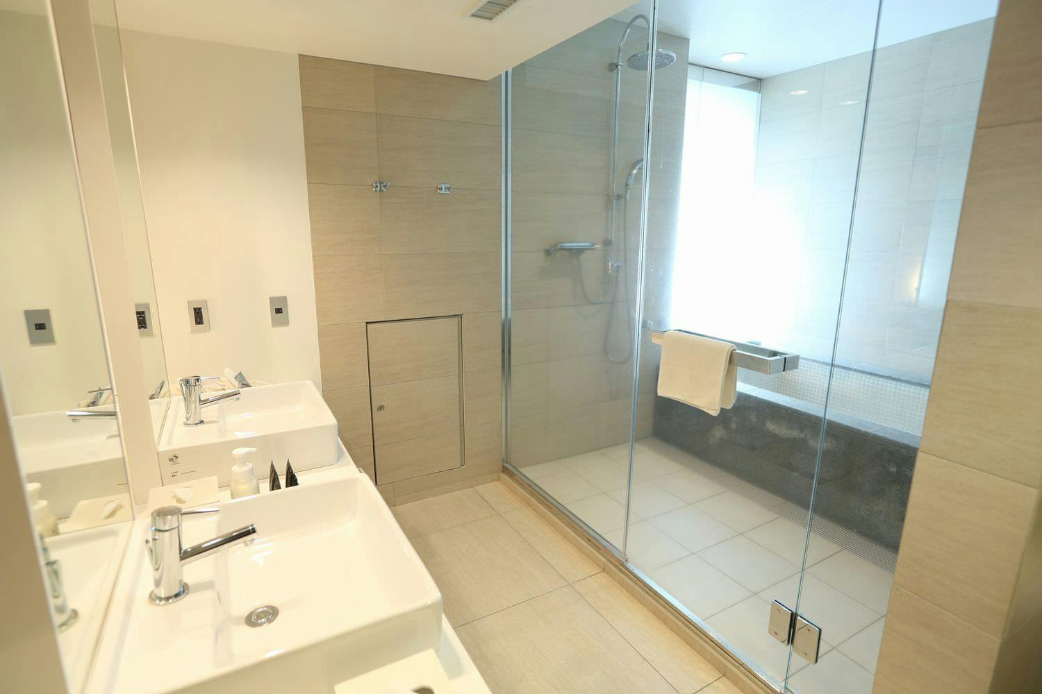 <海を眺めるオーシャンビュールーム>■レインシャワー(バスタブなし) ■シモンズ社製ベッド:200×115(2台)■液晶フラットTV32インチ ■DVD/CDプレイヤー ■洗面台2台:ダブルベイシン ■セーフティボックス(金庫)
