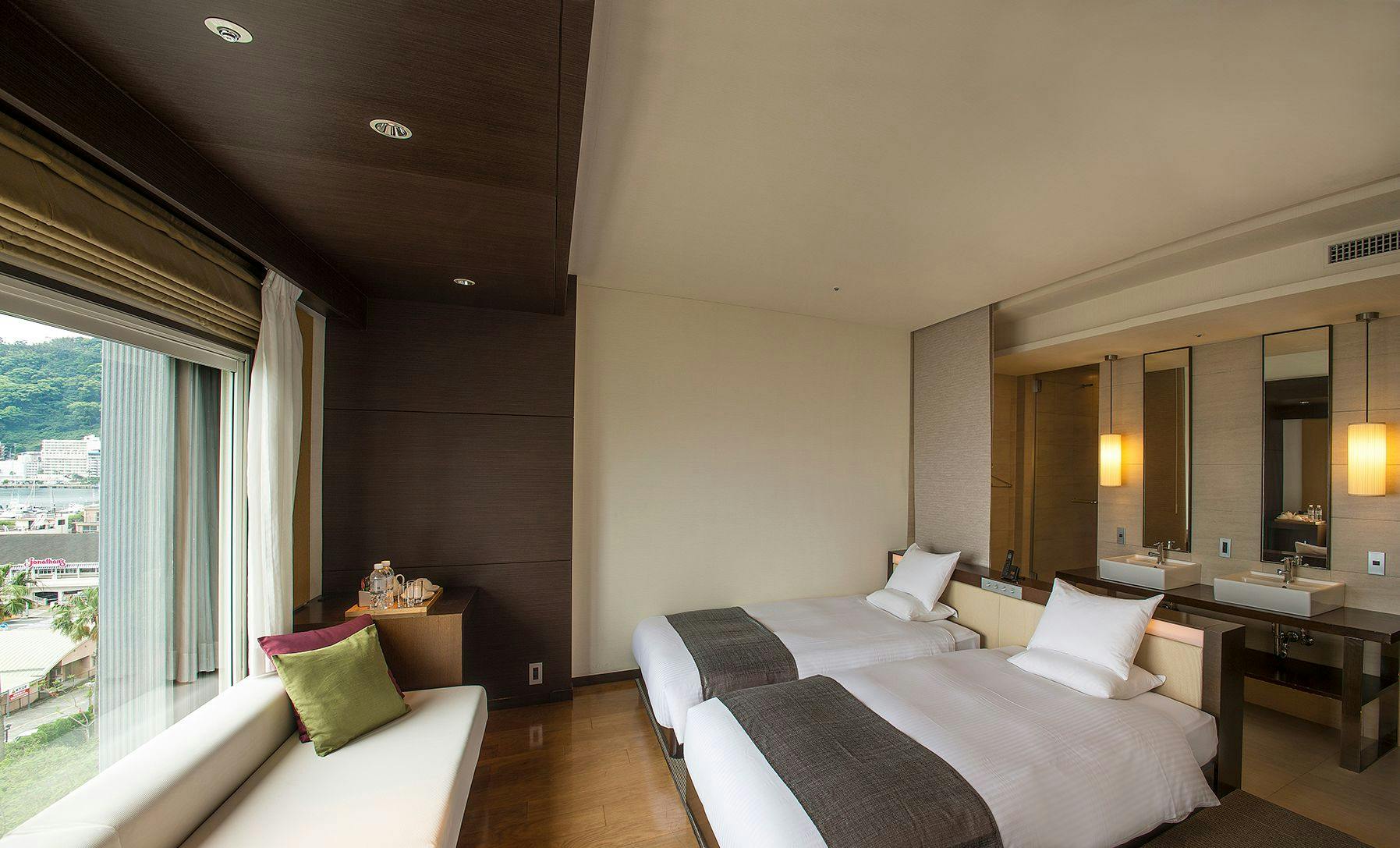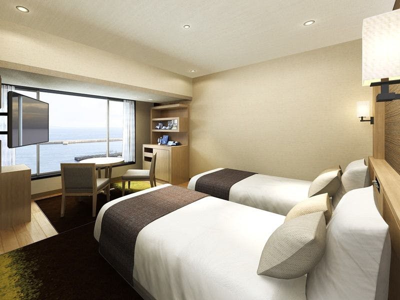 9階~12階の高層階フロア確約の客室。<高層階から海を眺めるオーシャンビュールーム>●シモンズ社製ベッド:200×120 2台●液晶TV ●DVD・CDプレイヤー ●テーブル・椅子 ●洗面台2台:ダブルベイシン●セーフティーボックス(金庫) ●シャワーブース