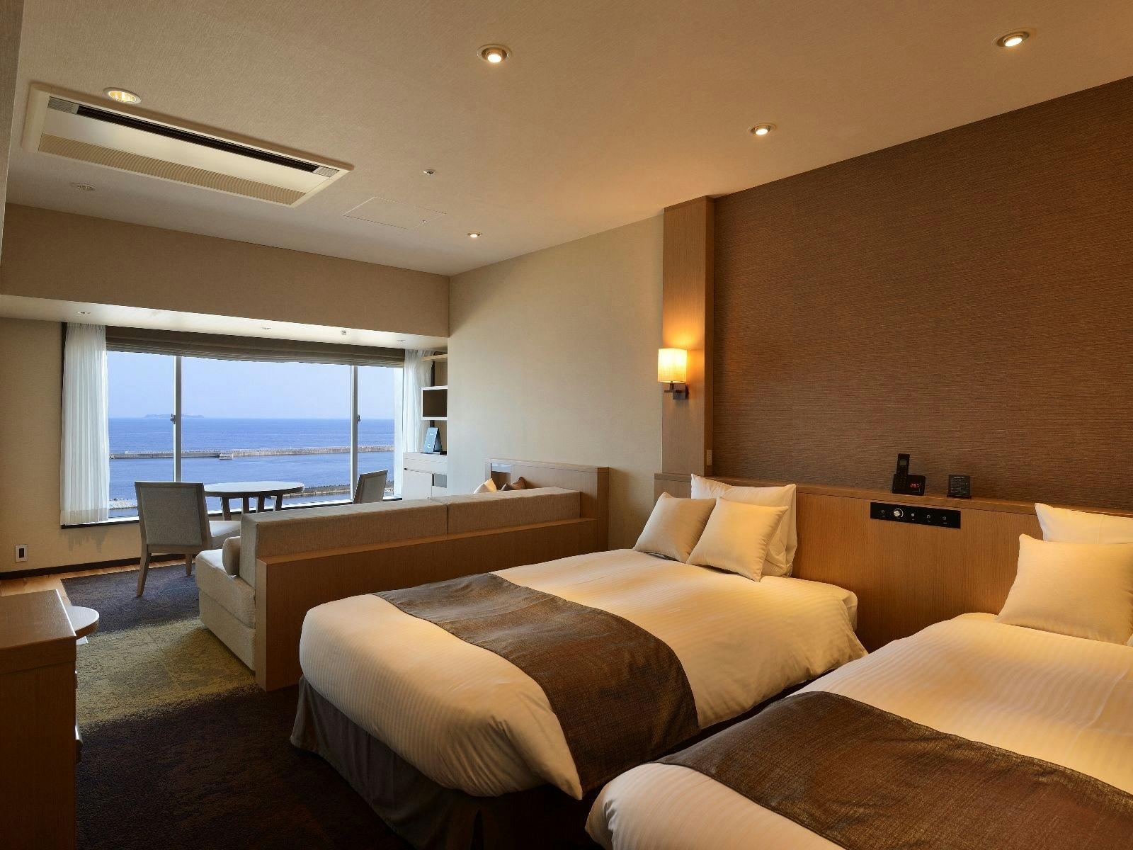 ※海側と反対向きとなる為、眺望はございません。■50インチ液晶テレビ ■室内大型温泉浴槽付■セーフティボックス(金庫)■洗面台2台:ダブルベイシン ■セーフティボックス(金庫)※3台目、4台目のベッドはエキストラ対応となります。※窓は明り取りの窓となり、開閉できません。※お風呂は露天風呂ではございません。
