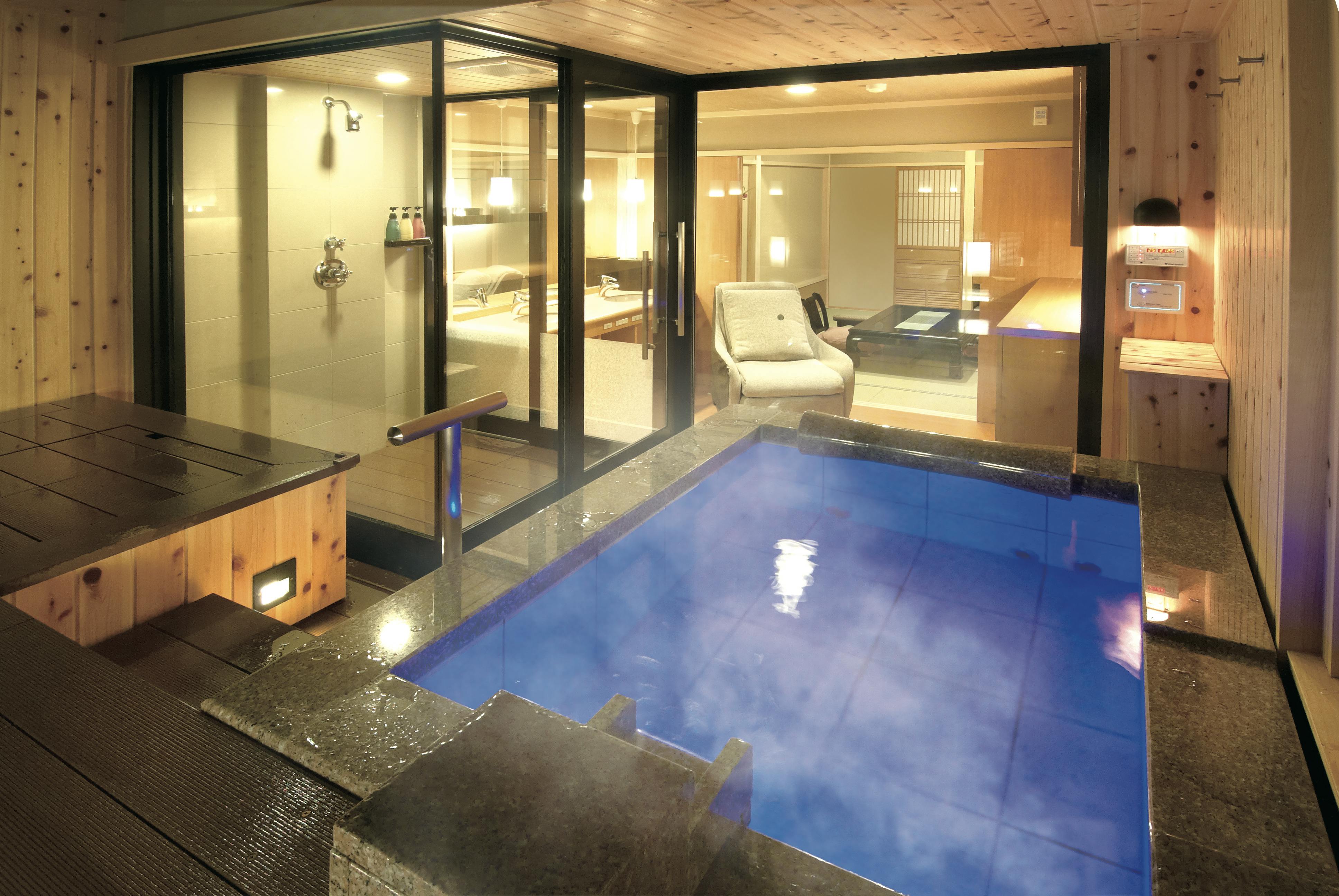 【設備】露天風呂、シャワーブース、トイレ、液晶テレビ、DVDプレイヤー、音響5.1ch、冷蔵庫、金庫、湯沸しポット