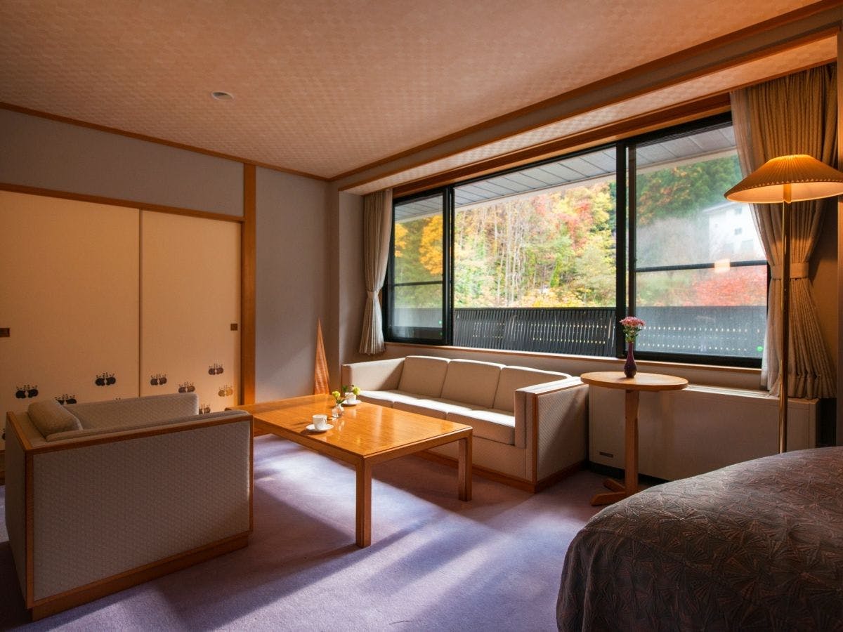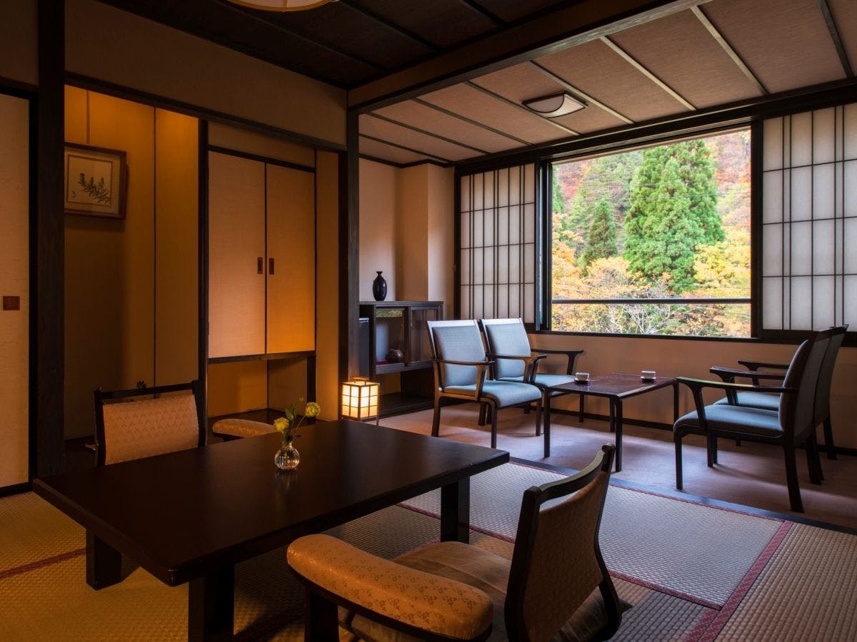 窓から見える景色は、季節により桜や山花が咲き、小川がせせらぐ風情のあるお部屋
