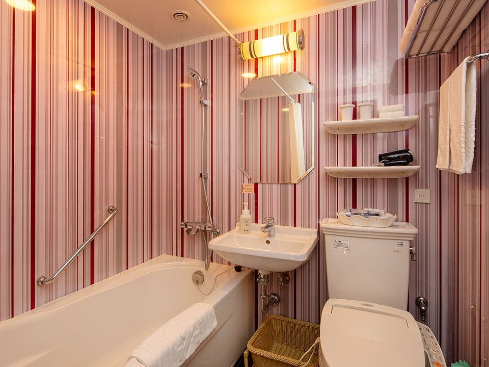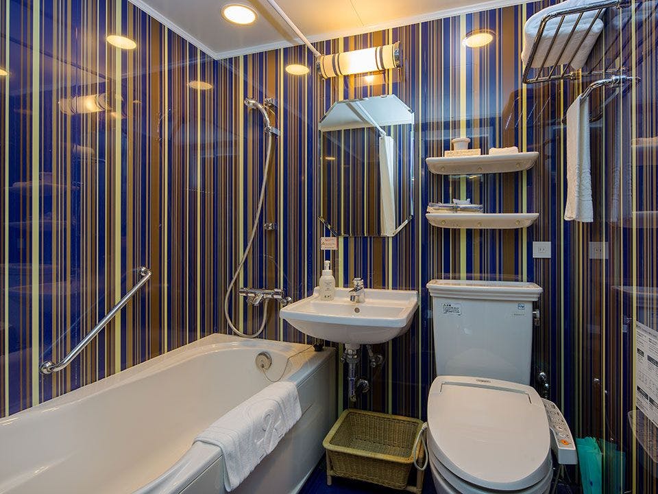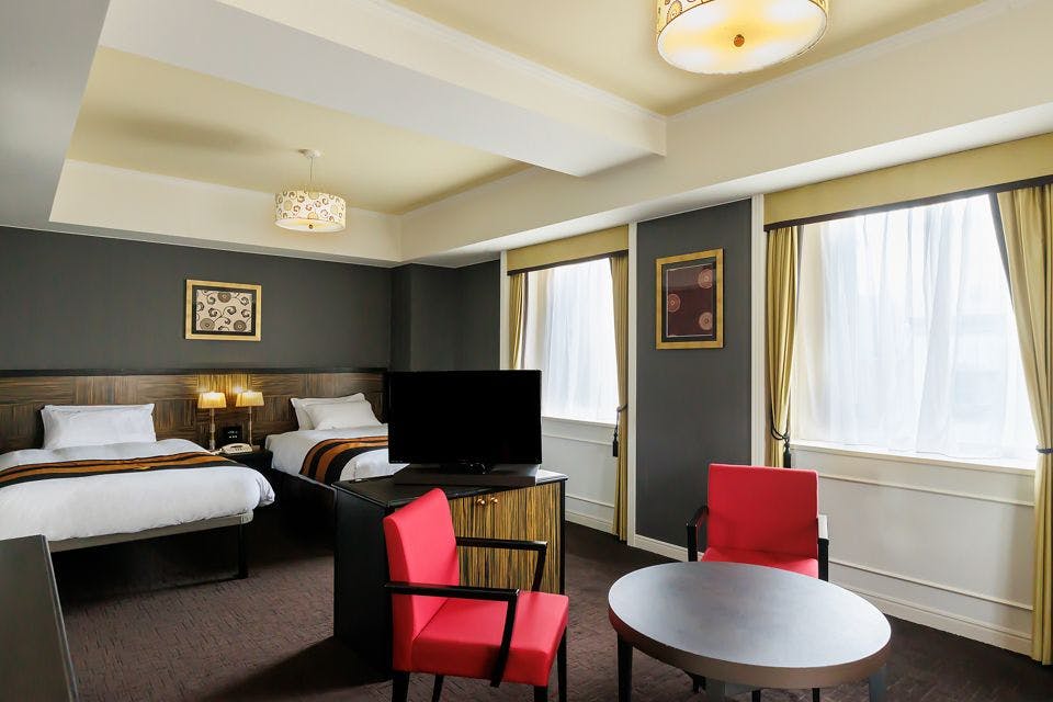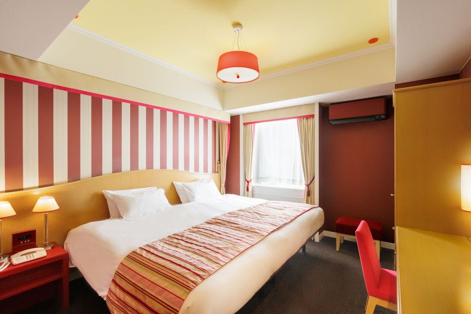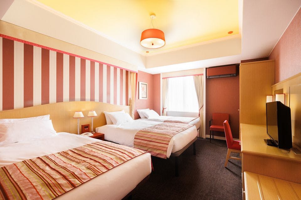 京の夕暮れを思わせる茜色をベースに、鮮やかなピンクのアクセントがチャーミングなお部屋。スタンダードツインのお部屋より少しゆったりめの造りがご滞在をさらに快適なものへと誘います。