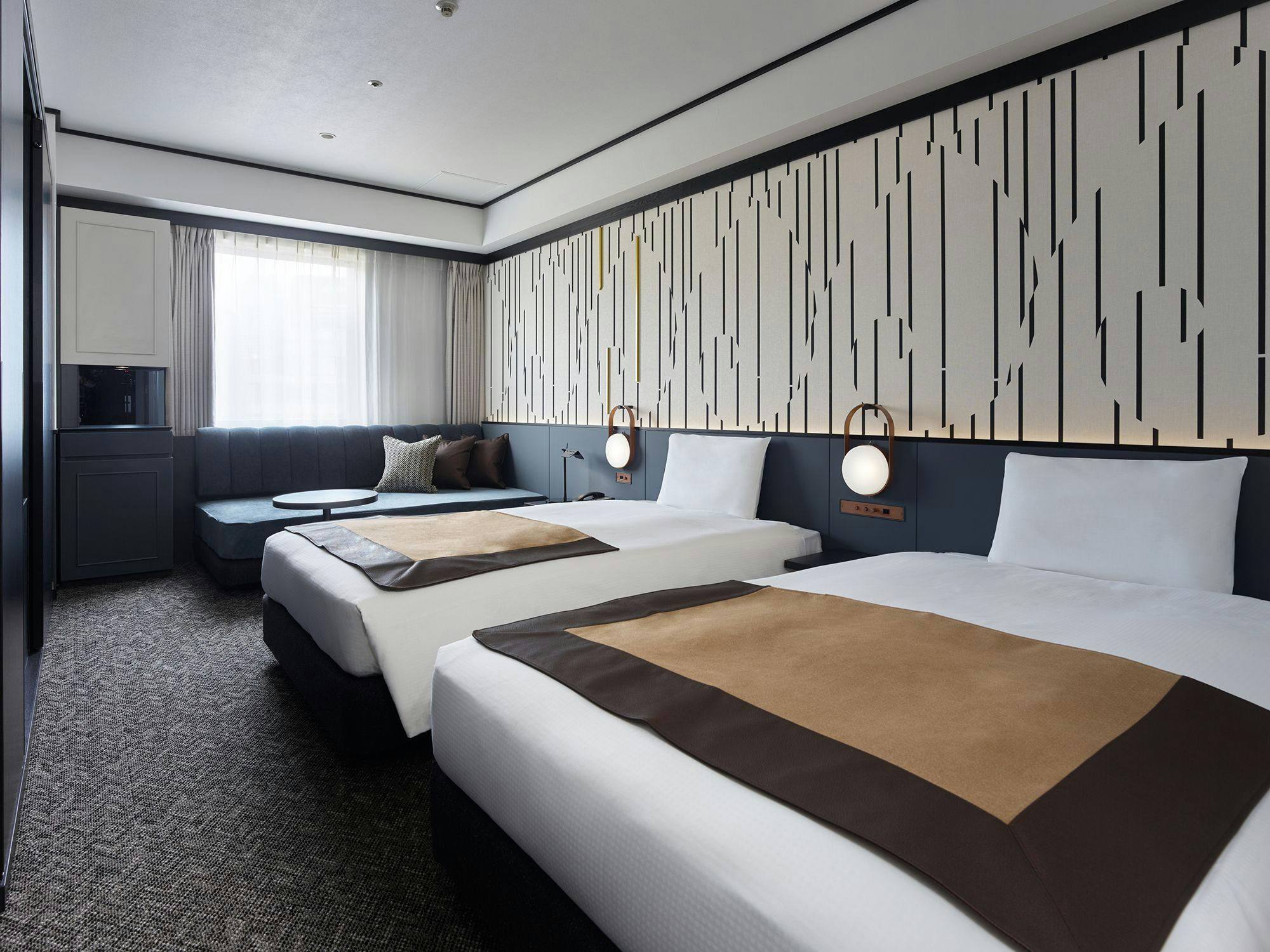 幅123cmのセミダブルベッドを採用したお部屋です。窓際にはゆっくりとお寛ぎいただけるL型のソファスペースを確保しております。ファミリーやカップルに人気のツインルームです。