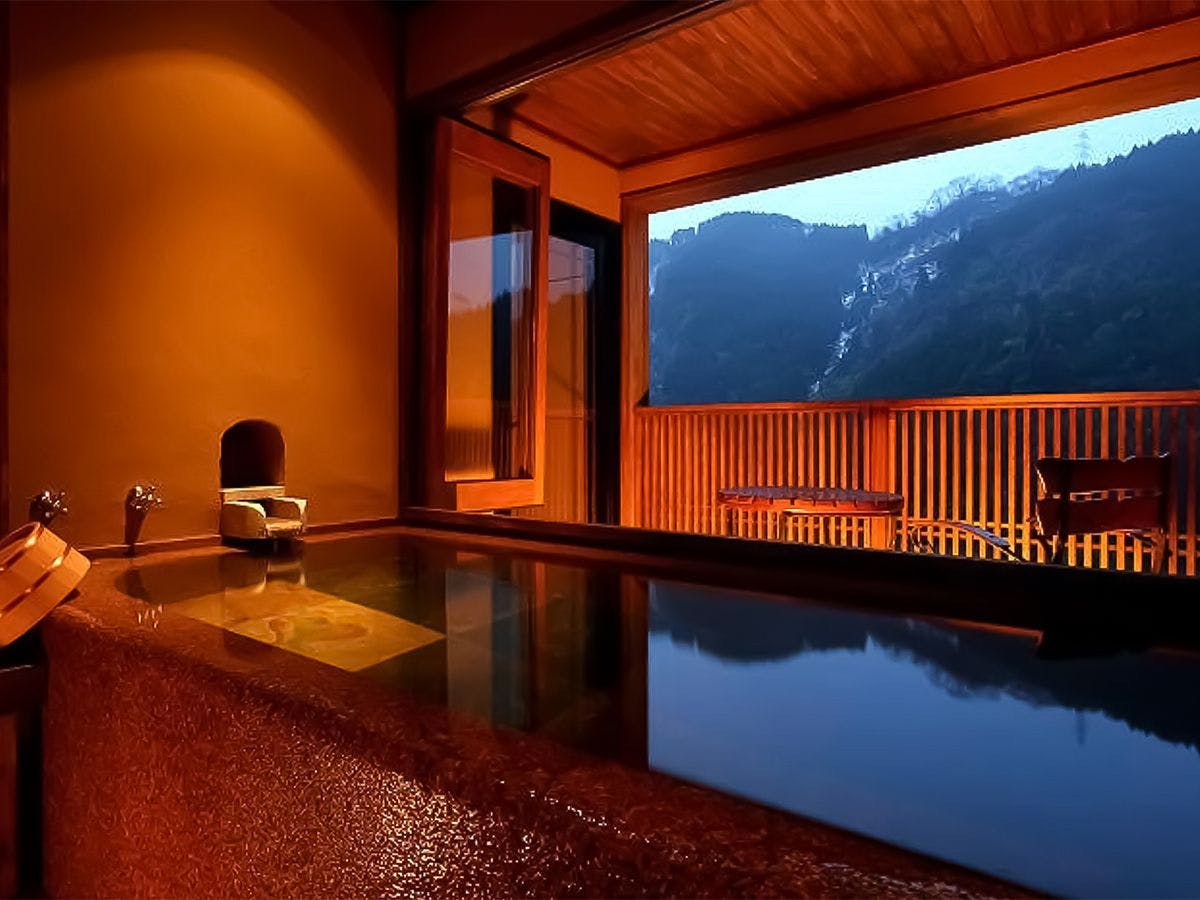 ゆったりとした浴槽を持つ客室露天風呂や大きく取った客室の窓から、