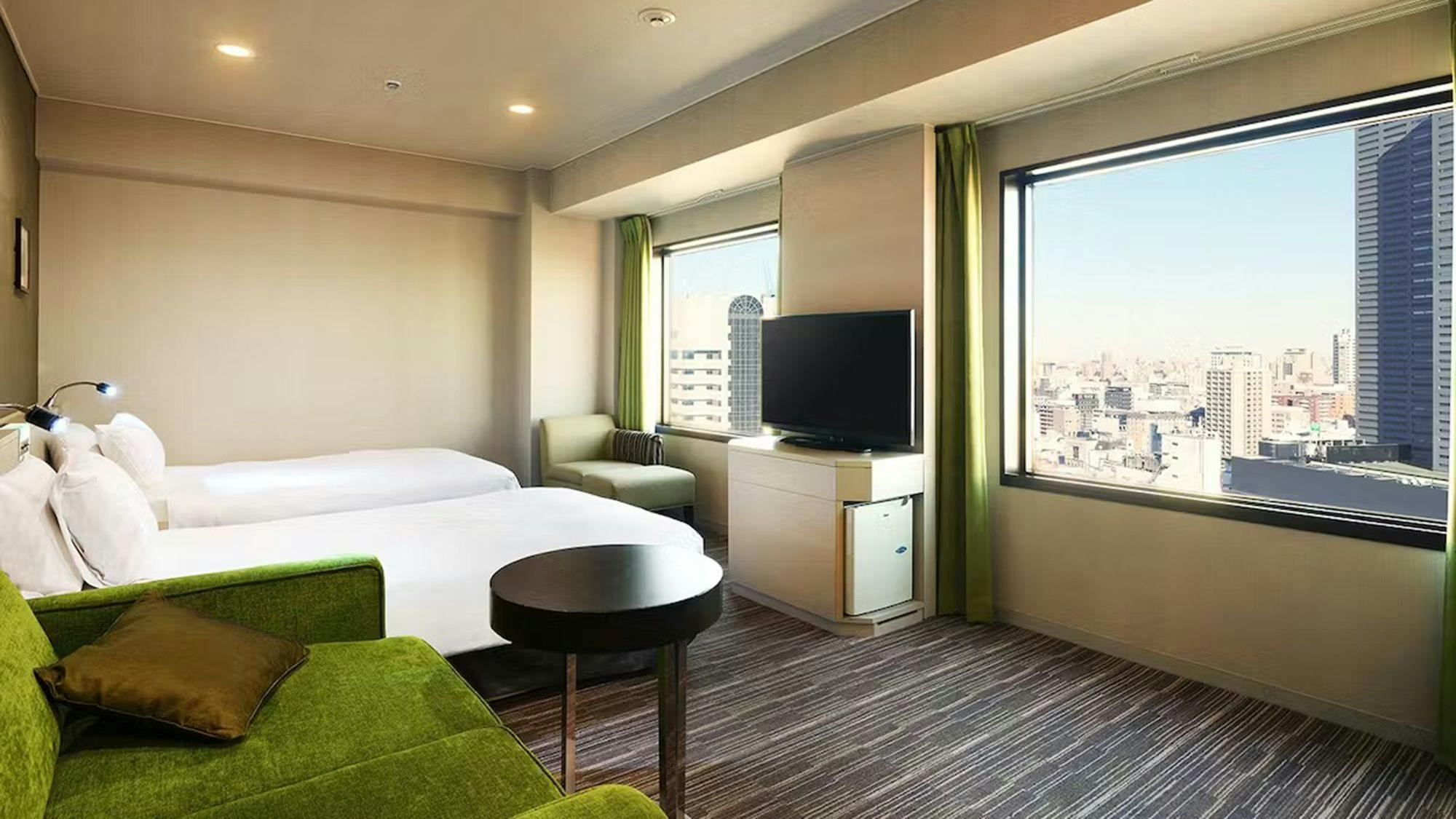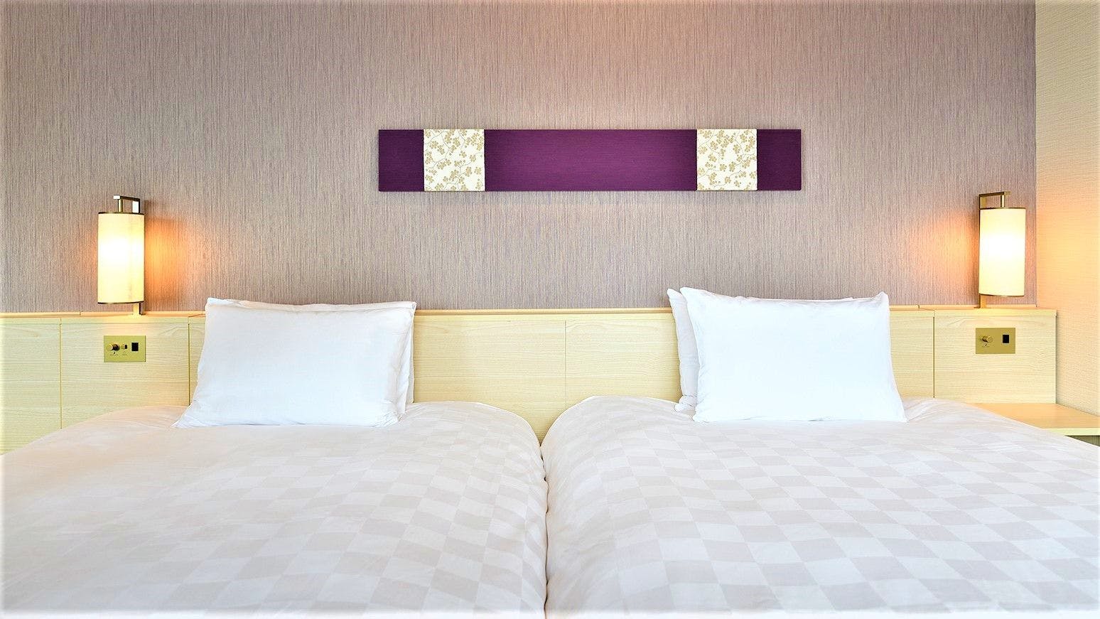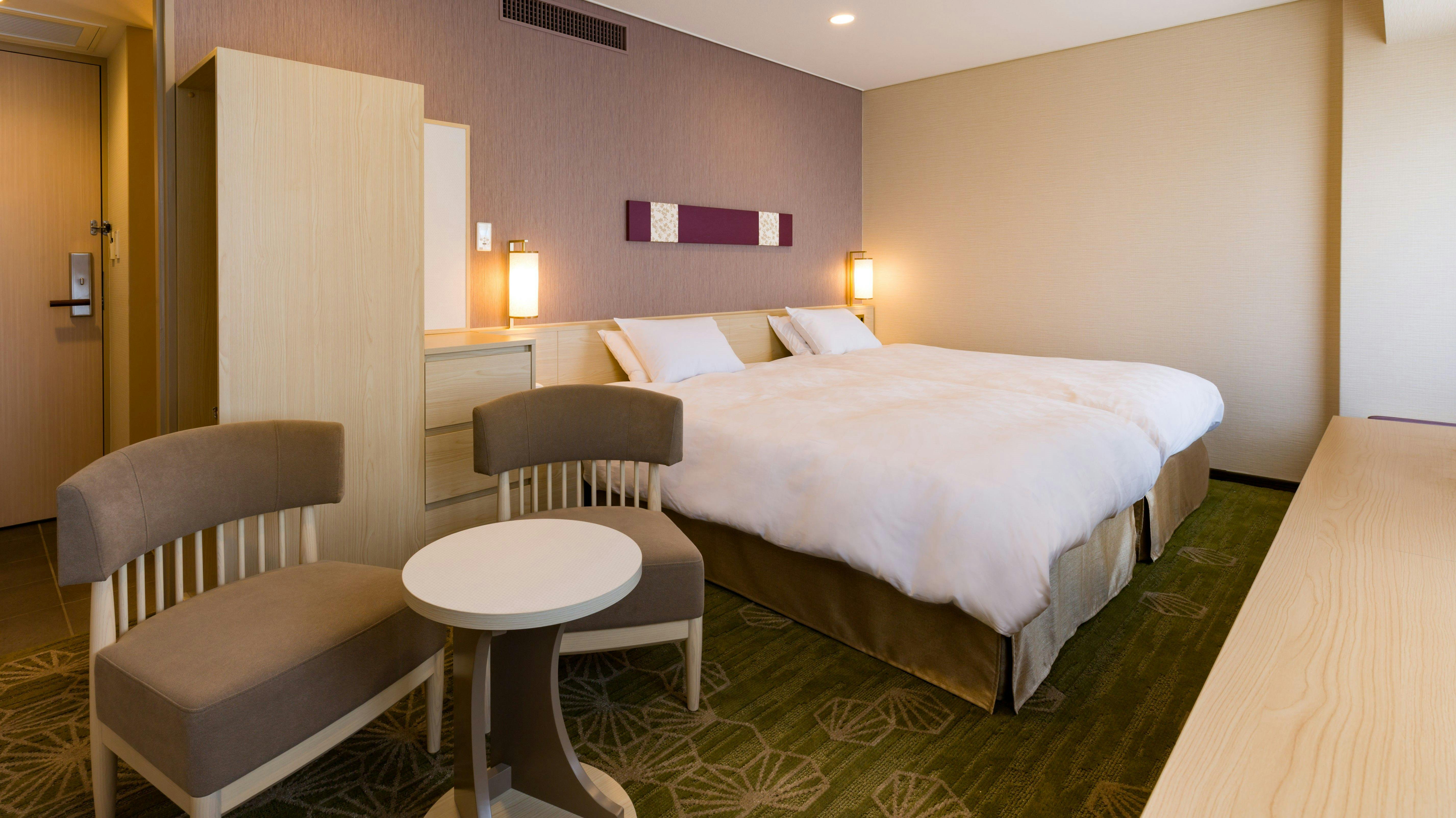 2018年リニューアルし、白木調に萌黄色と菜の花や、藤紫色と桜色など和風のデザインを取り入れたハリウッドツインルーム。30.6平米のゆたっりした空間に、皆さまをお迎えいたします。