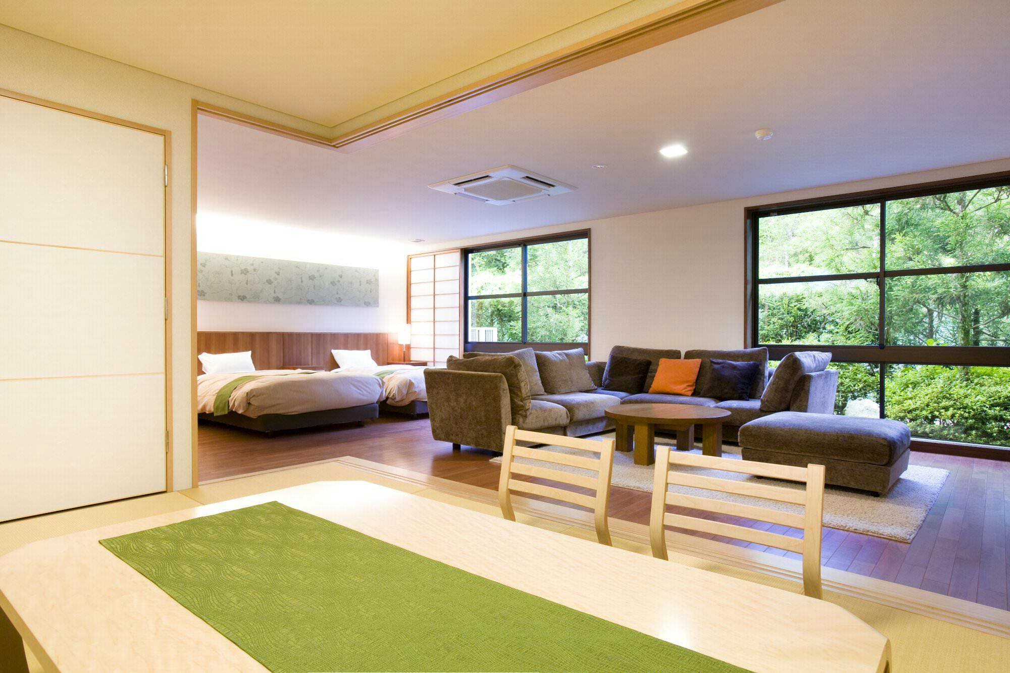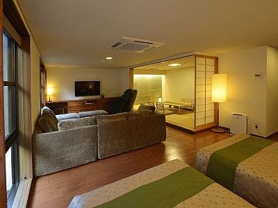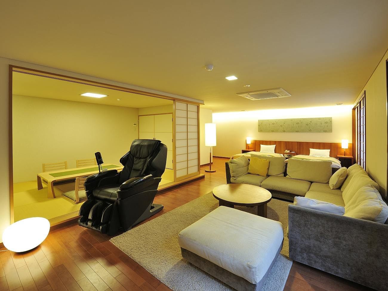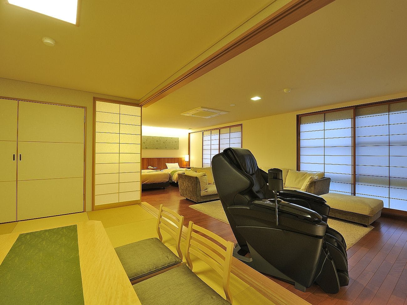 和室12畳+8畳の二間続きの広々とした造り。イタリア・アルフレックス社製の高級ソファや42インチ大型液晶テレビ、高性能マッサージチェアなどを設えた和モダンな空間になっております。