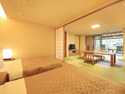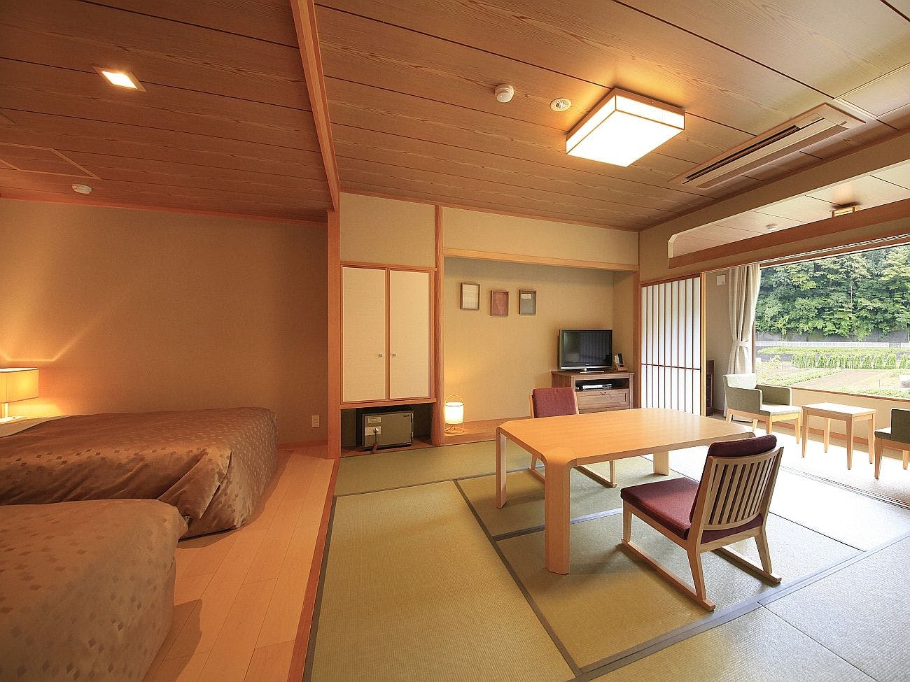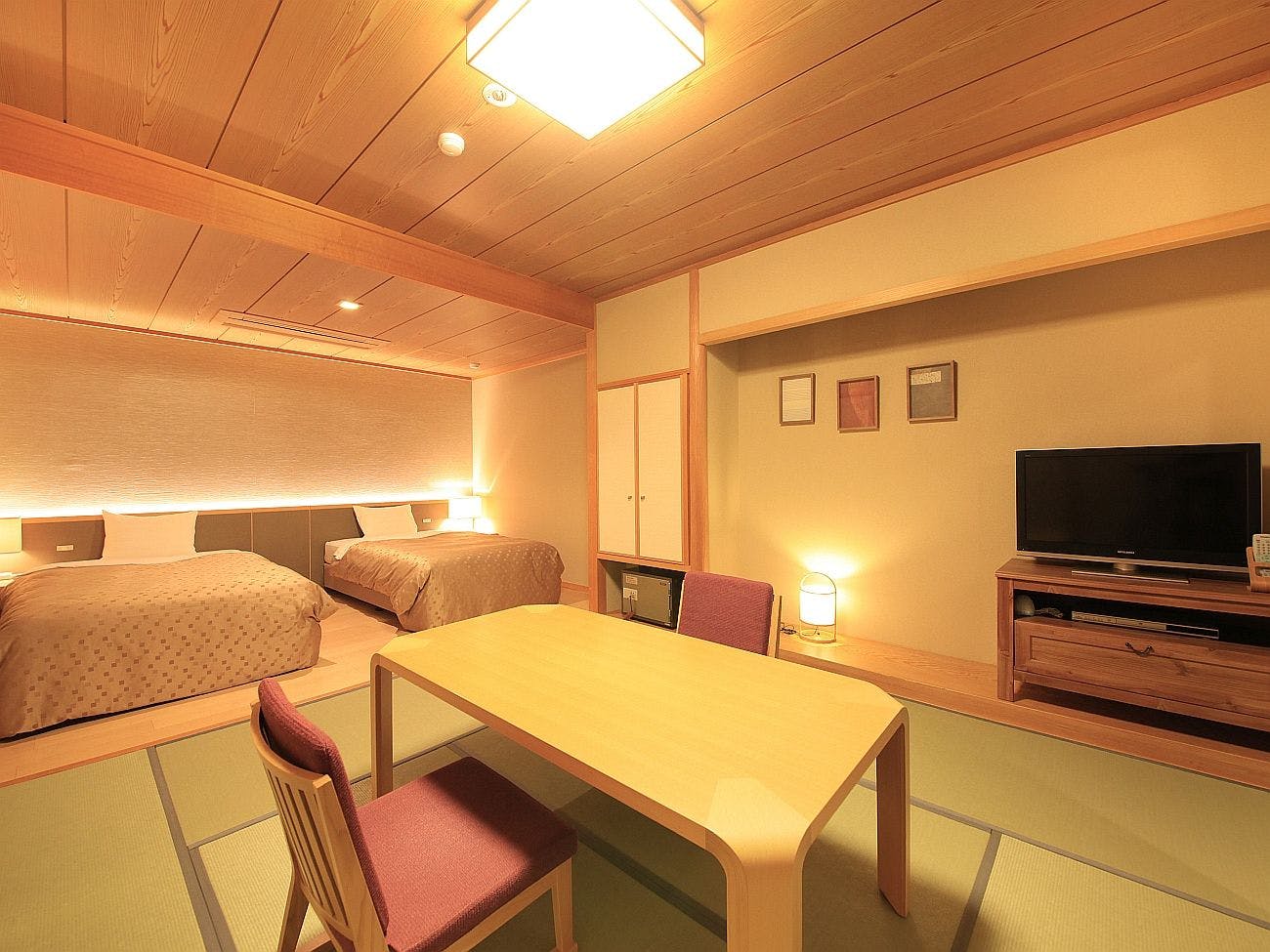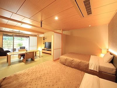 和室12畳+8畳の二間続きの広々とした造り。イタリア・アルフレックス社製の高級ソファや42インチ大型液晶テレビ、高性能マッサージチェアなどを設えた和モダンな空間になっております。