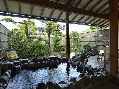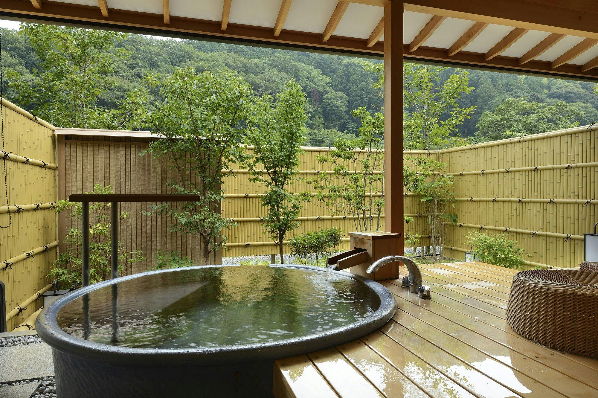 広々としたテラスにあるお風呂は、檜風呂・岩風呂・石風呂の3タイプがございます。庭園を愛でながらのプライベートな温泉浴が心身をじっくりと癒してくれます。