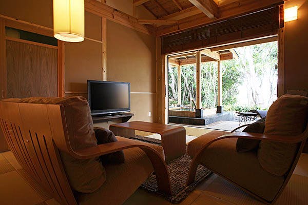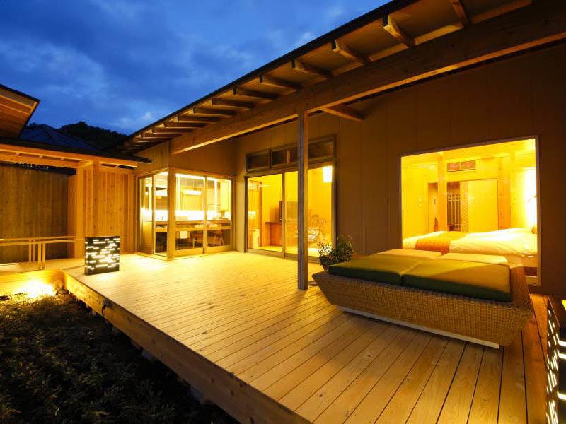 湯浴み後は露天風呂に続く専用デッキテラスでリラックスタイムを。