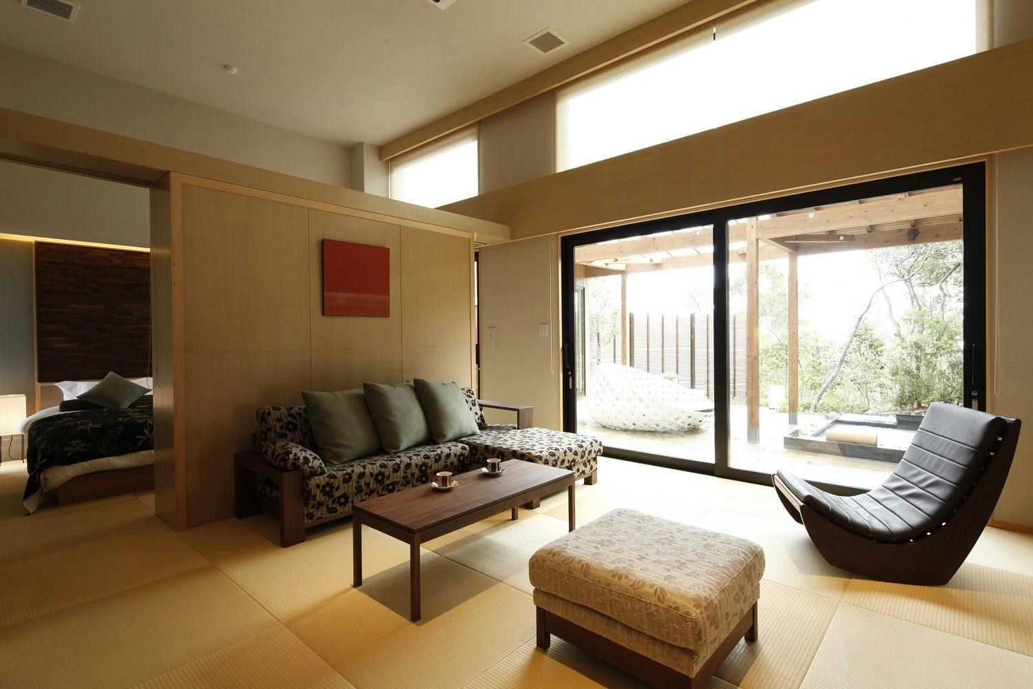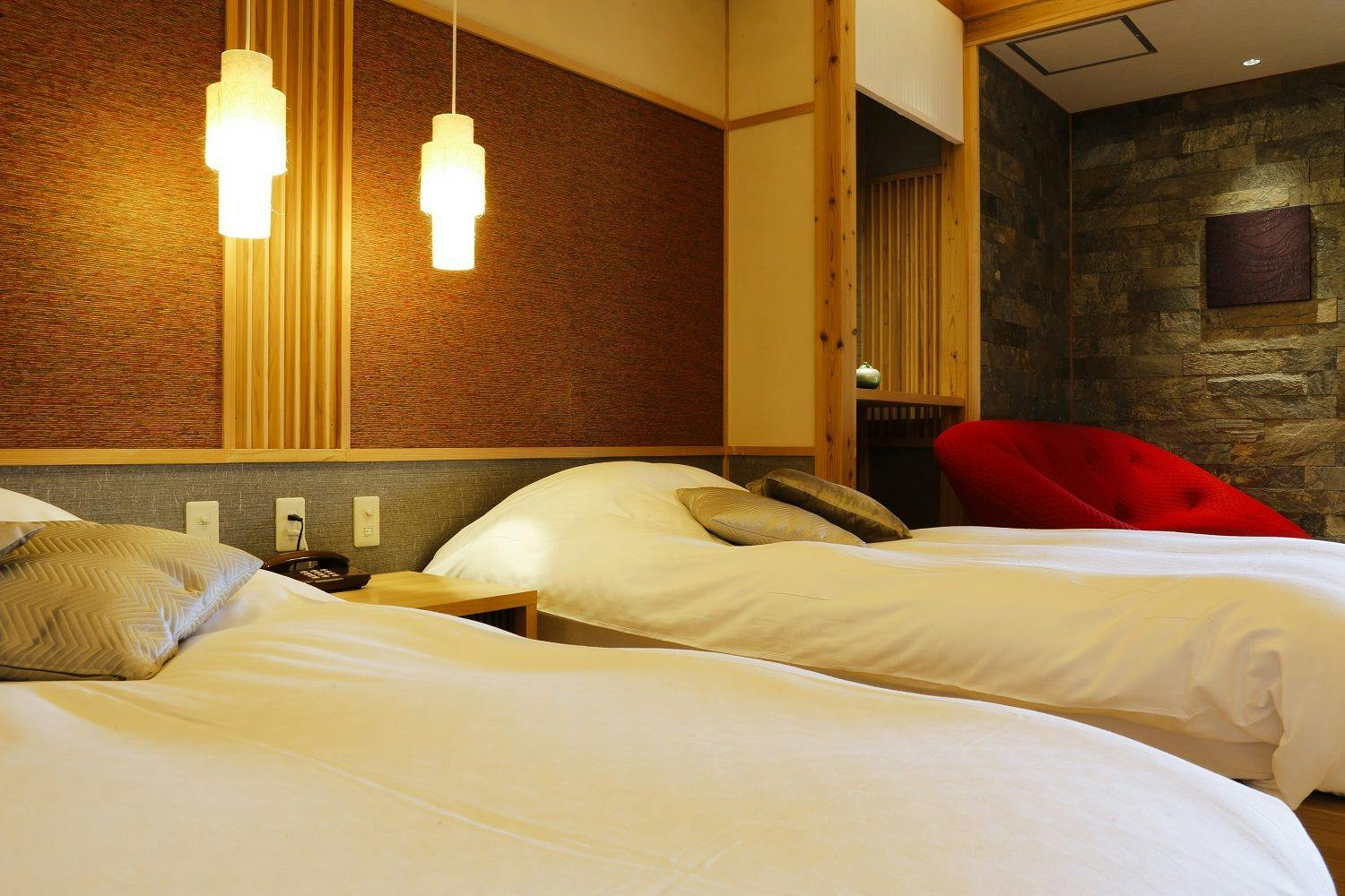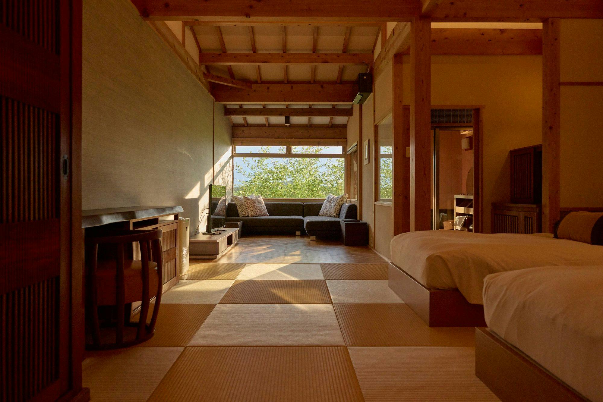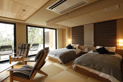 ツインベッド+和室畳リビング+石の露天風呂付。