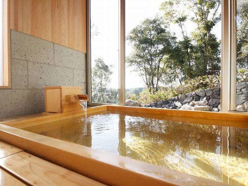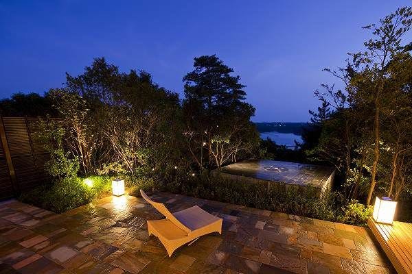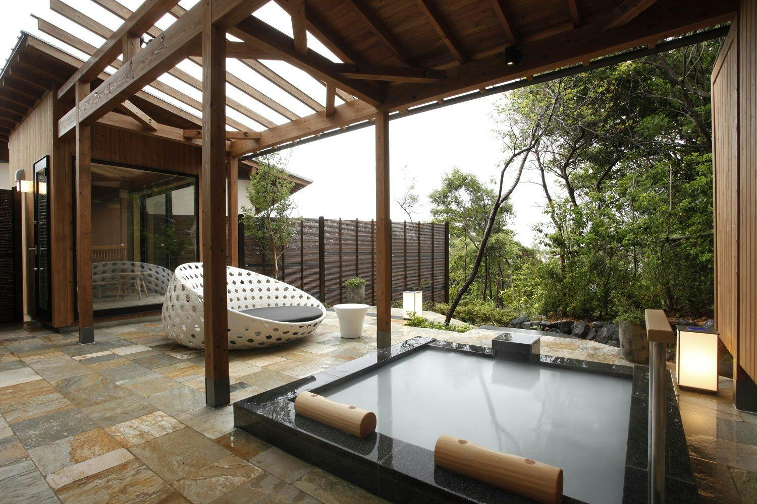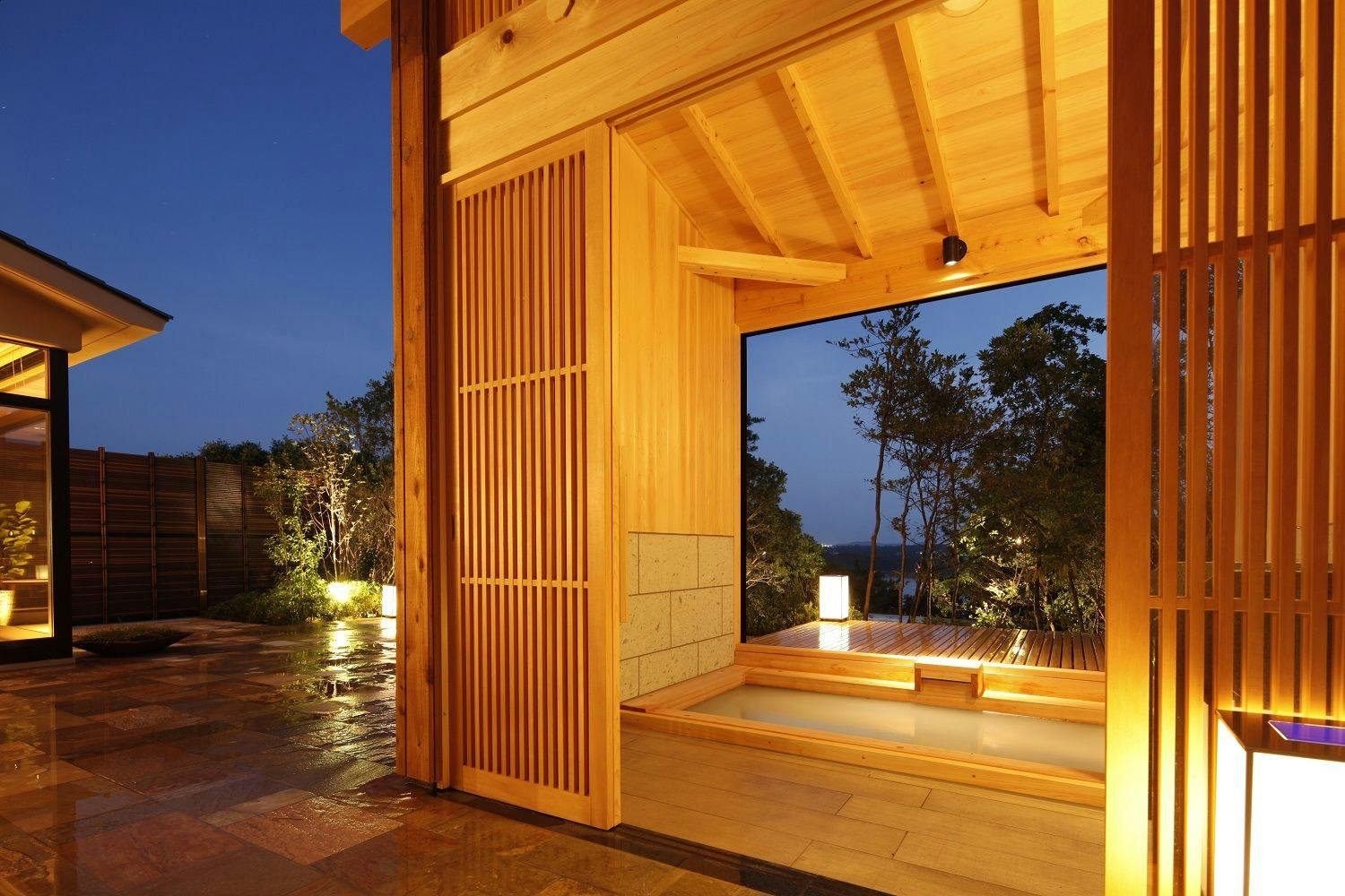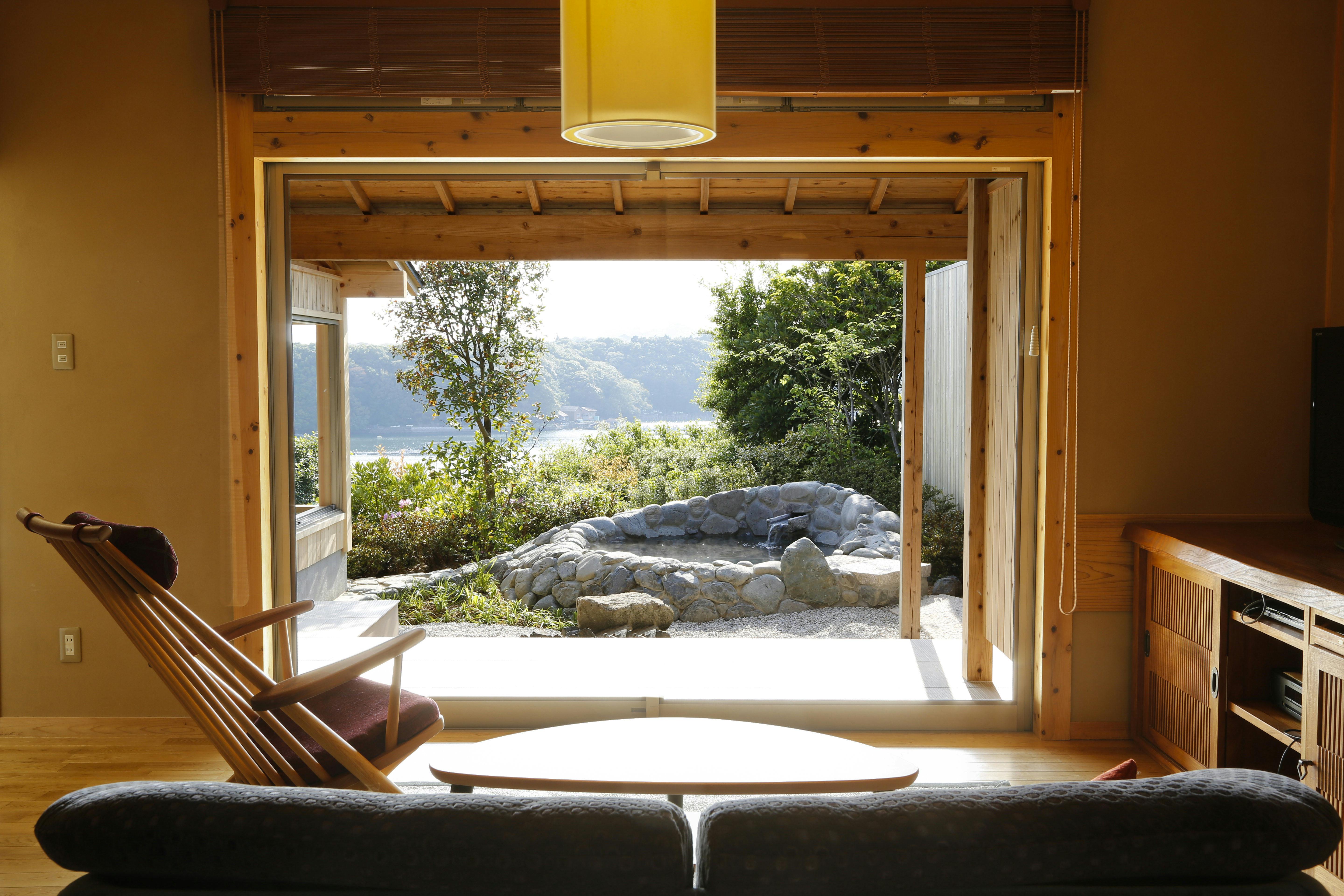 庭には東屋スタイルの檜の露天風呂を備え、