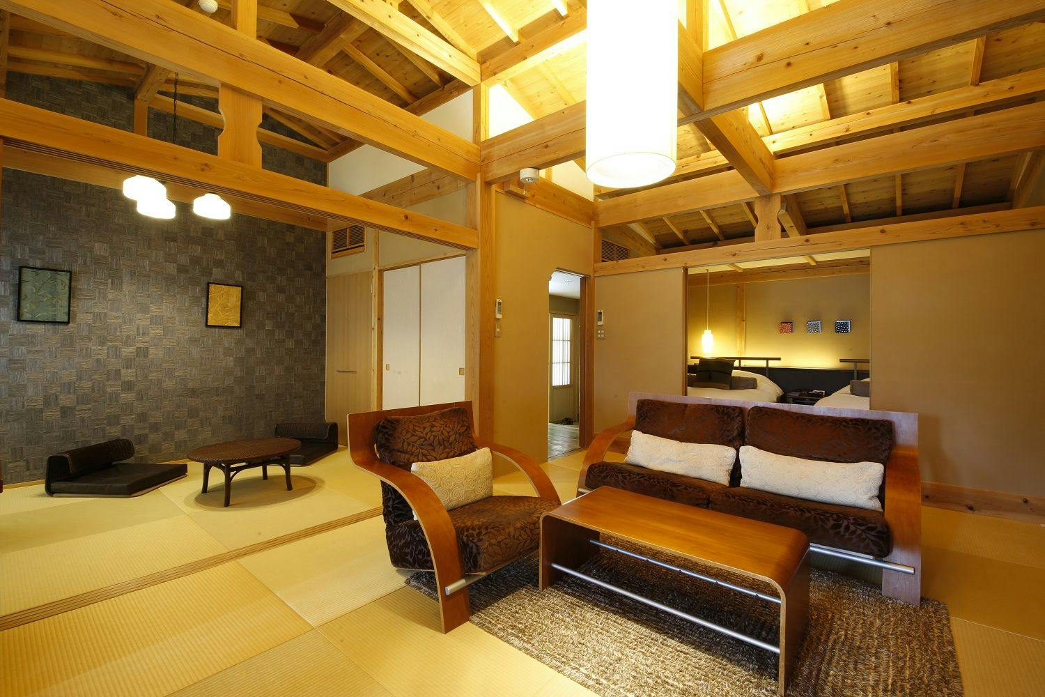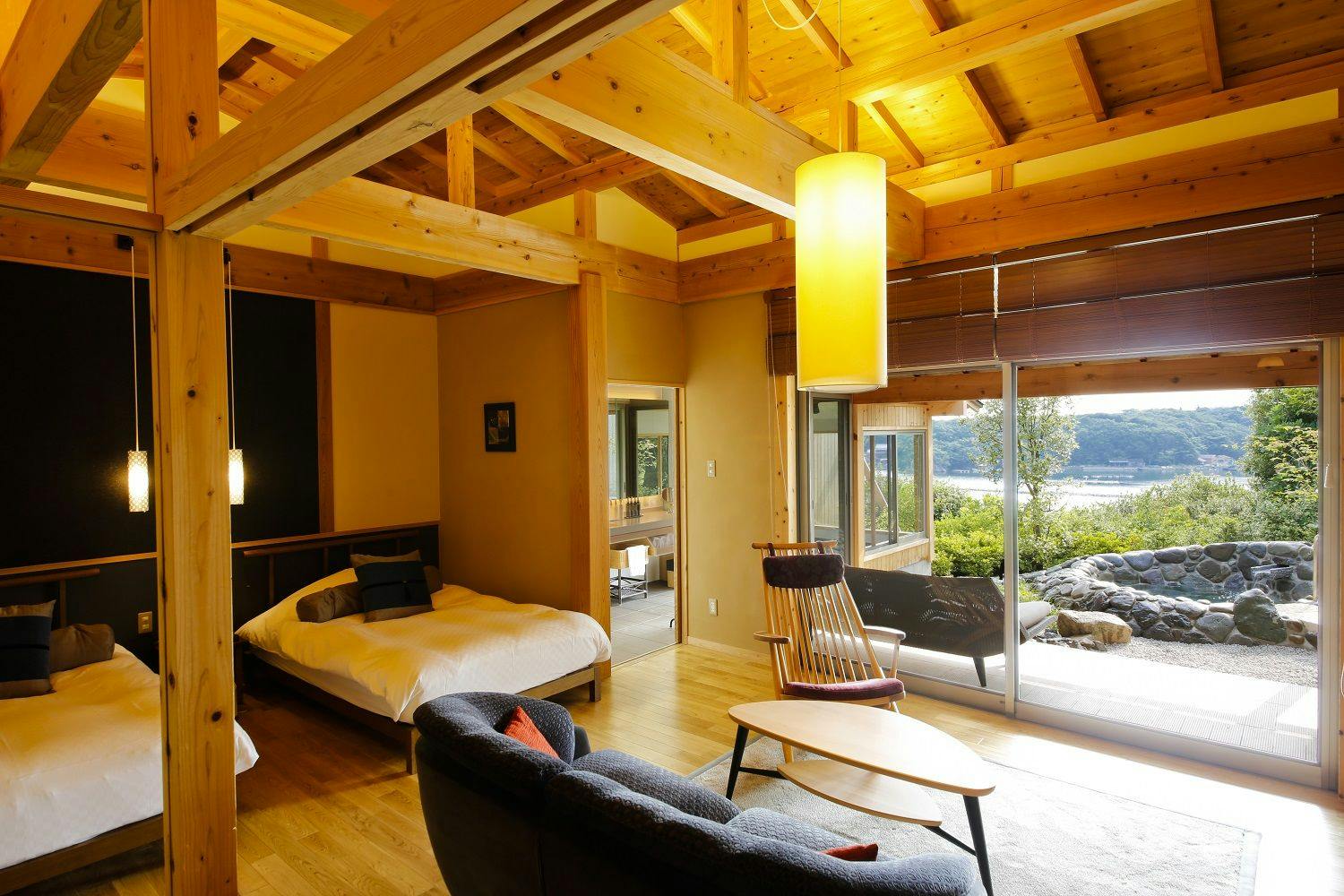 英虞湾を望む、梁を活かした高天井が特徴の客室は専有面積約110平米。