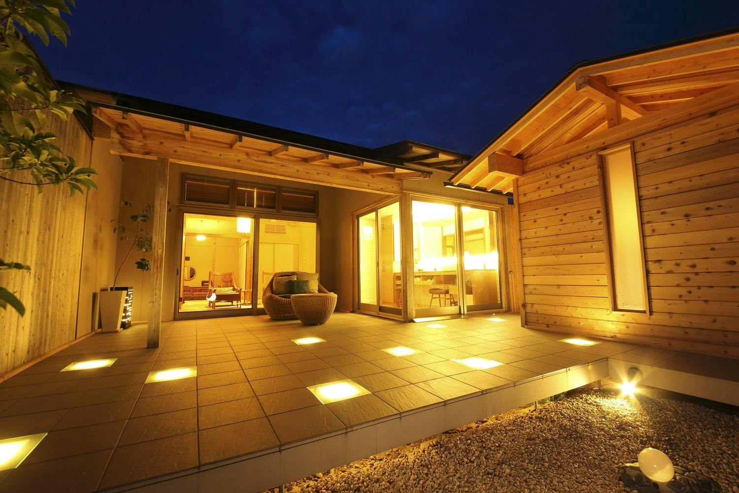 専用デッキテラスとお庭に東屋スタイル檜露天風呂がある梁を活かした高天井