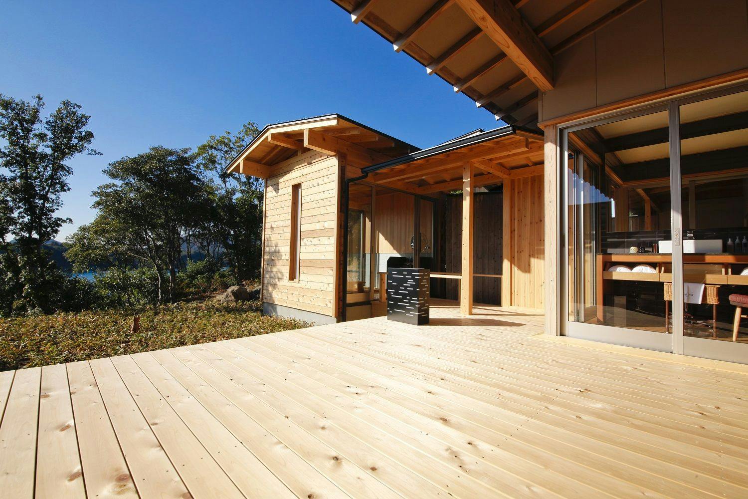 専用デッキテラスとお庭に東屋スタイル檜露天風呂