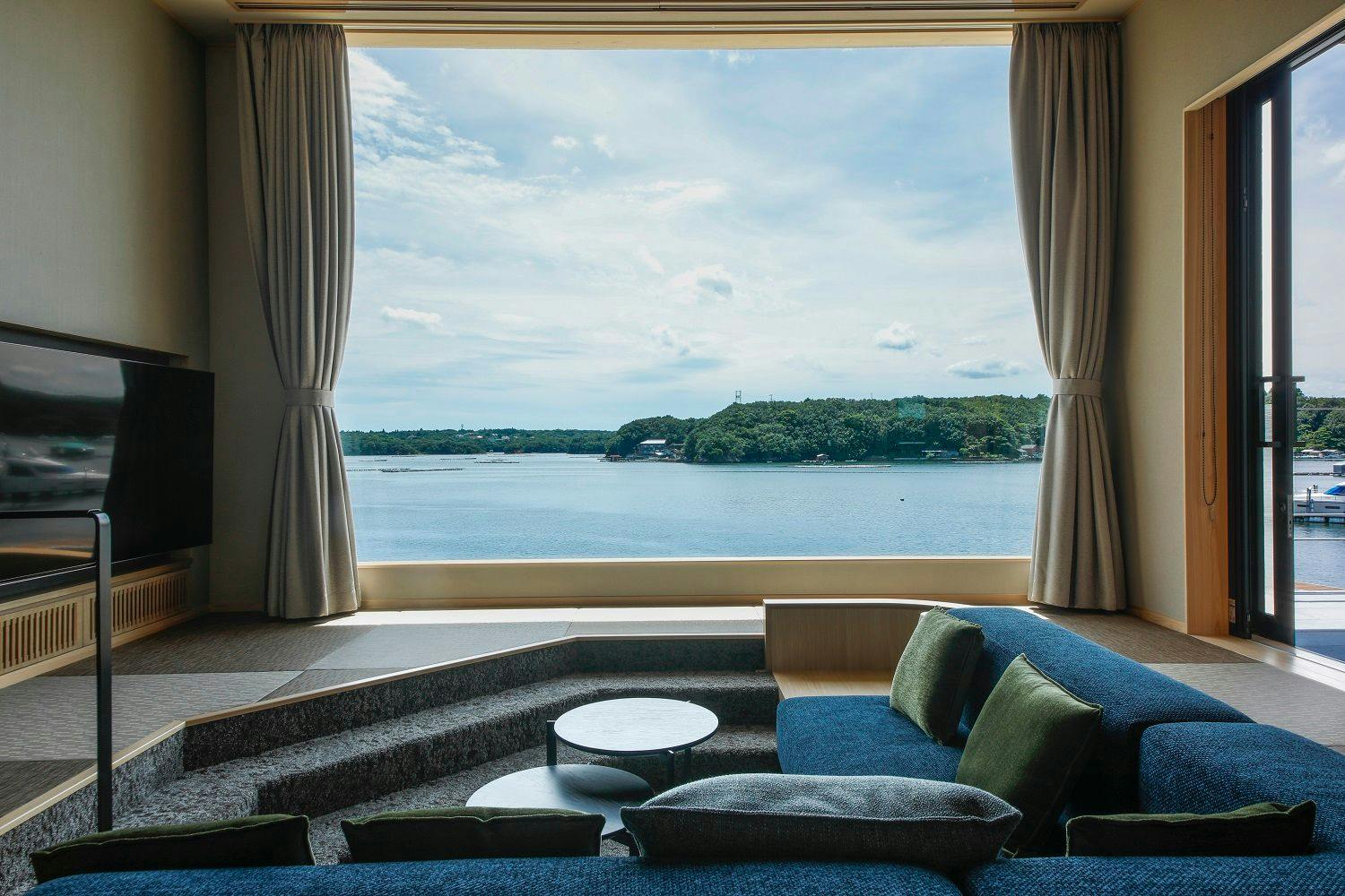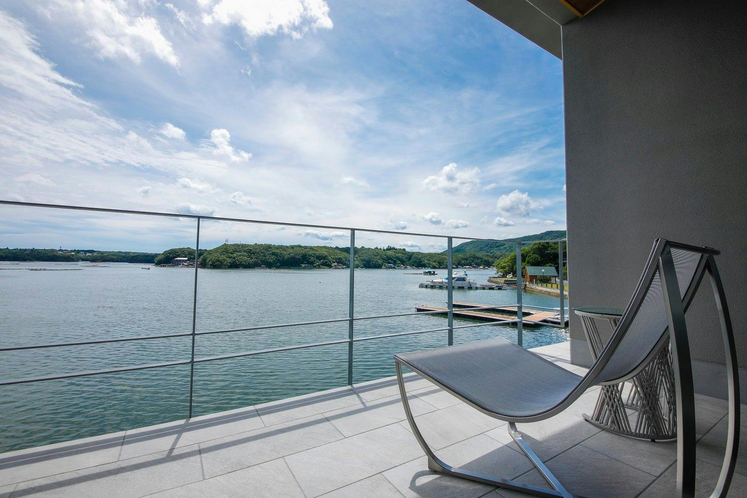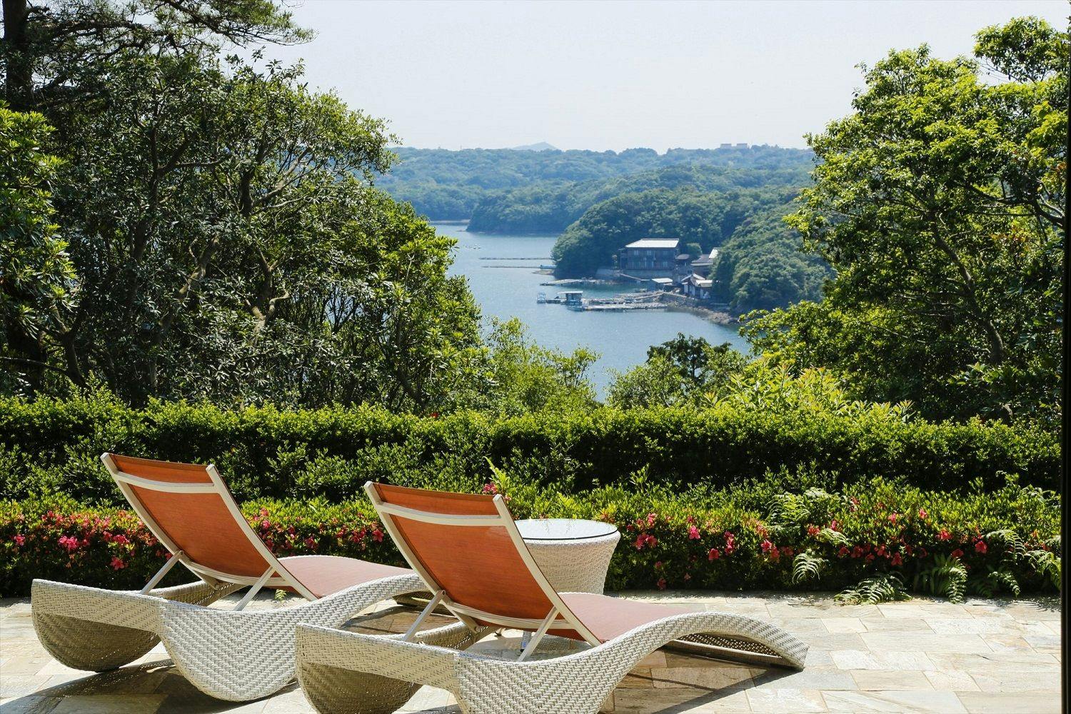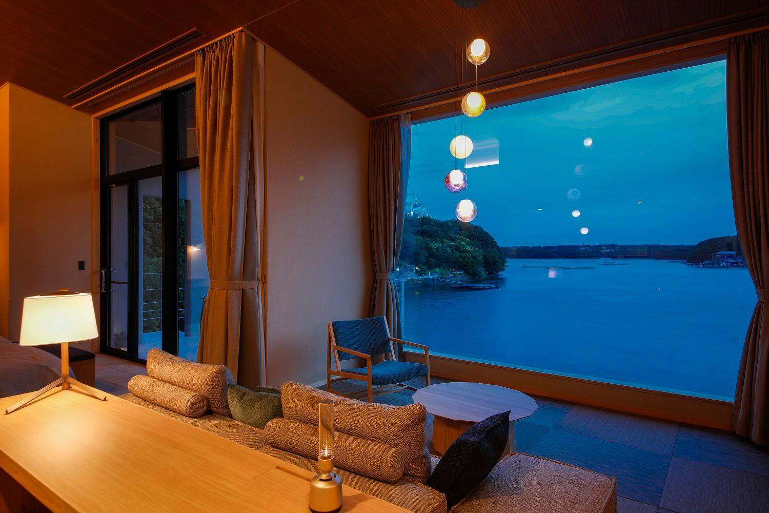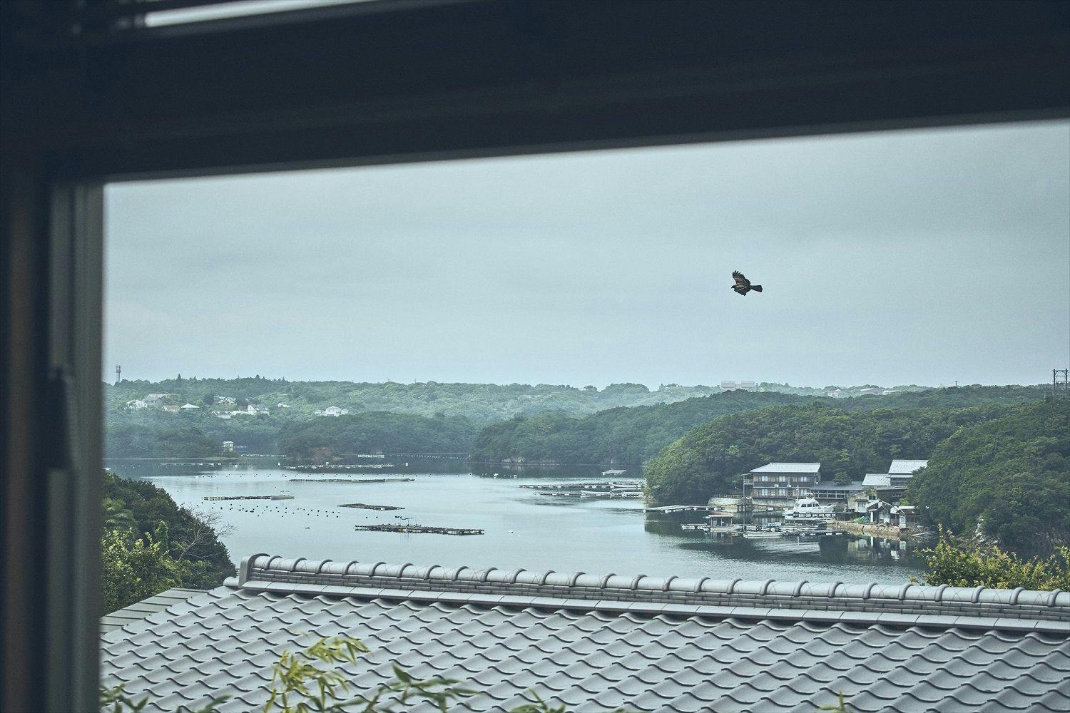 穏やかな英虞湾に包まれた静寂な景色を大きな窓越しから眺められる