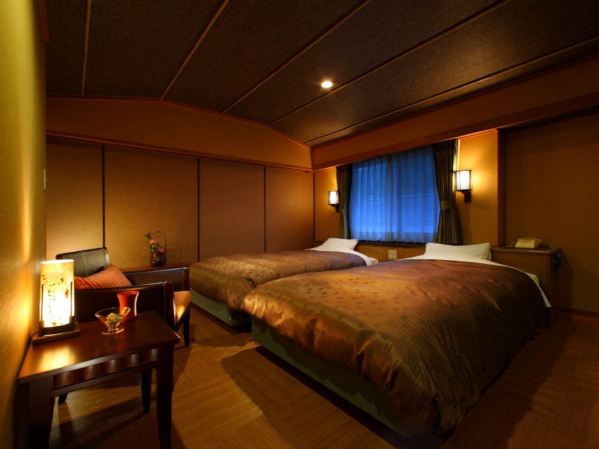 階段を上がると、落ち着きのあるゆったりベッド付客室。