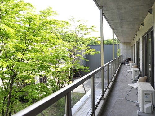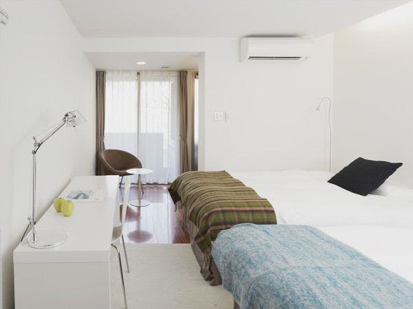 白を基調とした、シンプルで落ち着いた客室。テラスからは中庭の緑が見え、明るい光が気持ちの良いお部屋です。床暖房が設置され、冬でも大変暖かくお過ごし頂けます。
