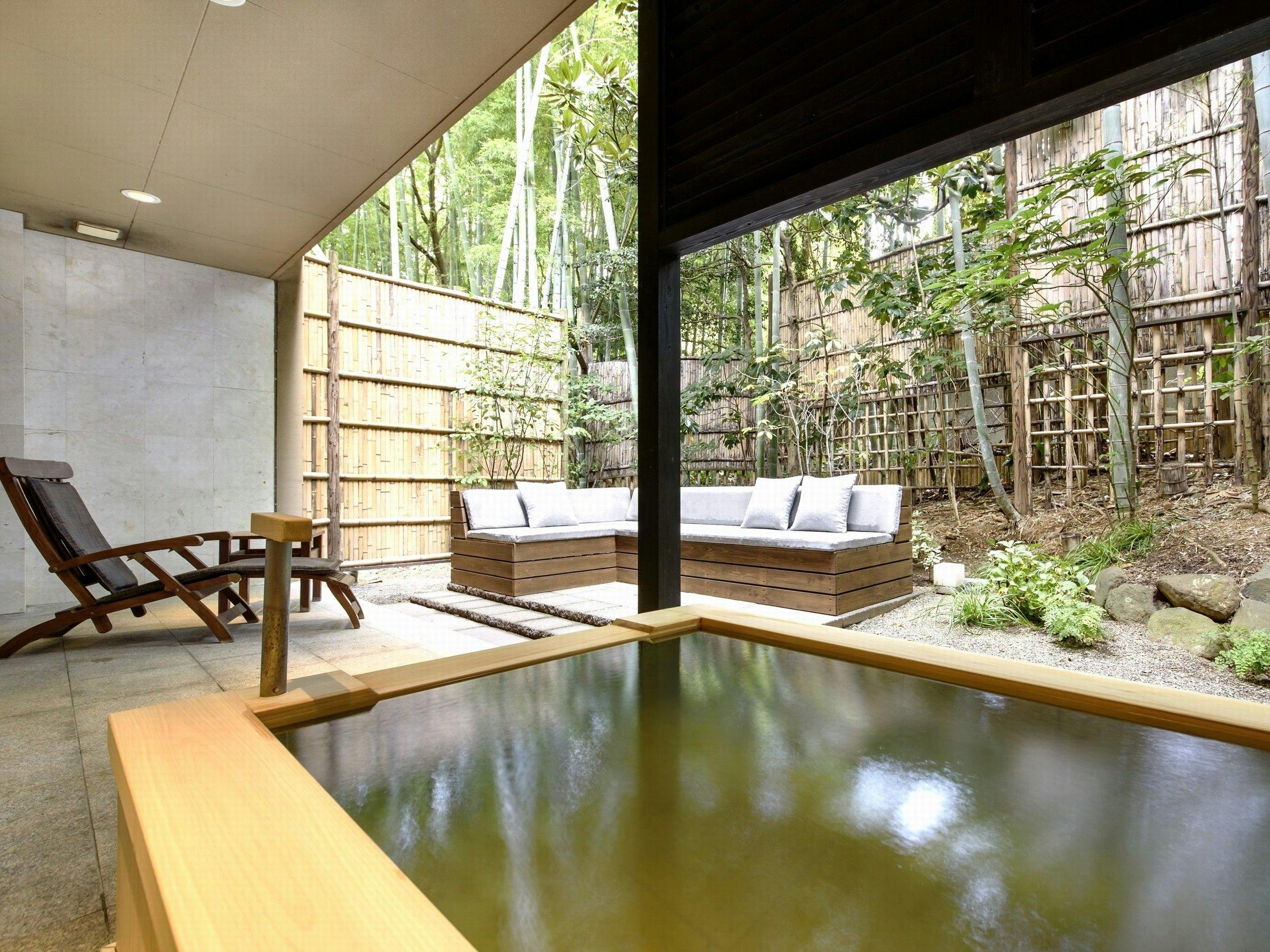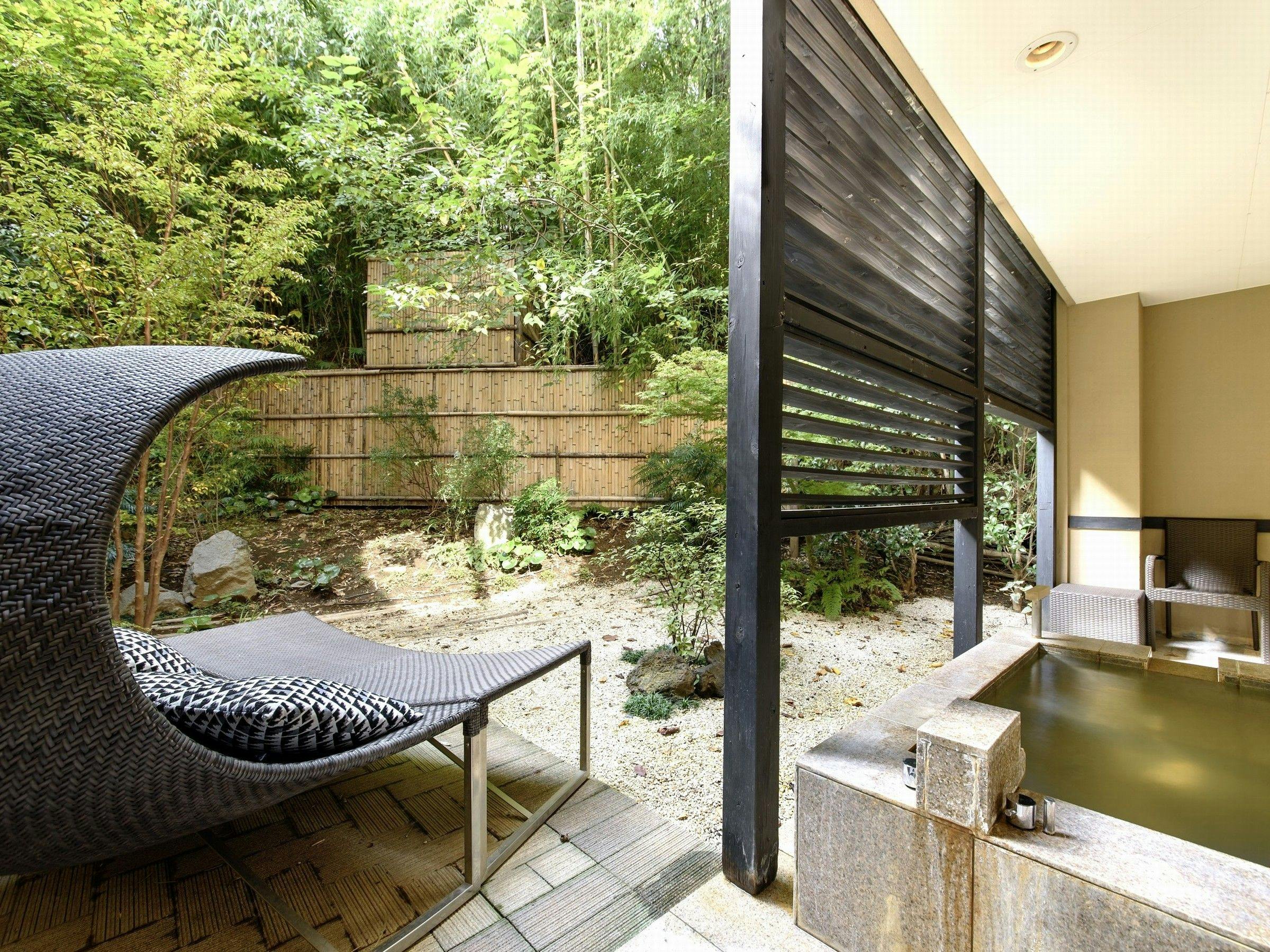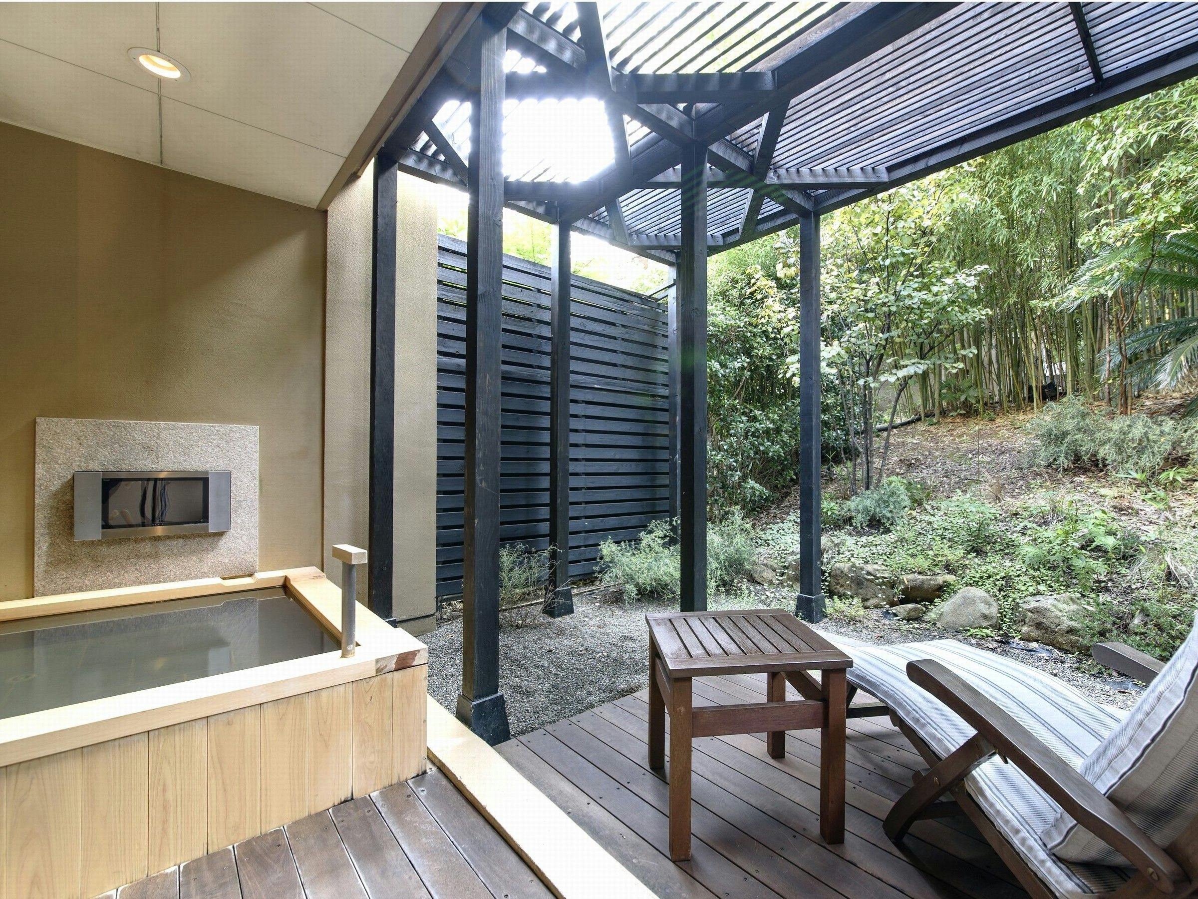 鳥の声が聞こえるプライベートガーデンテラスには、広い露天風呂があります。