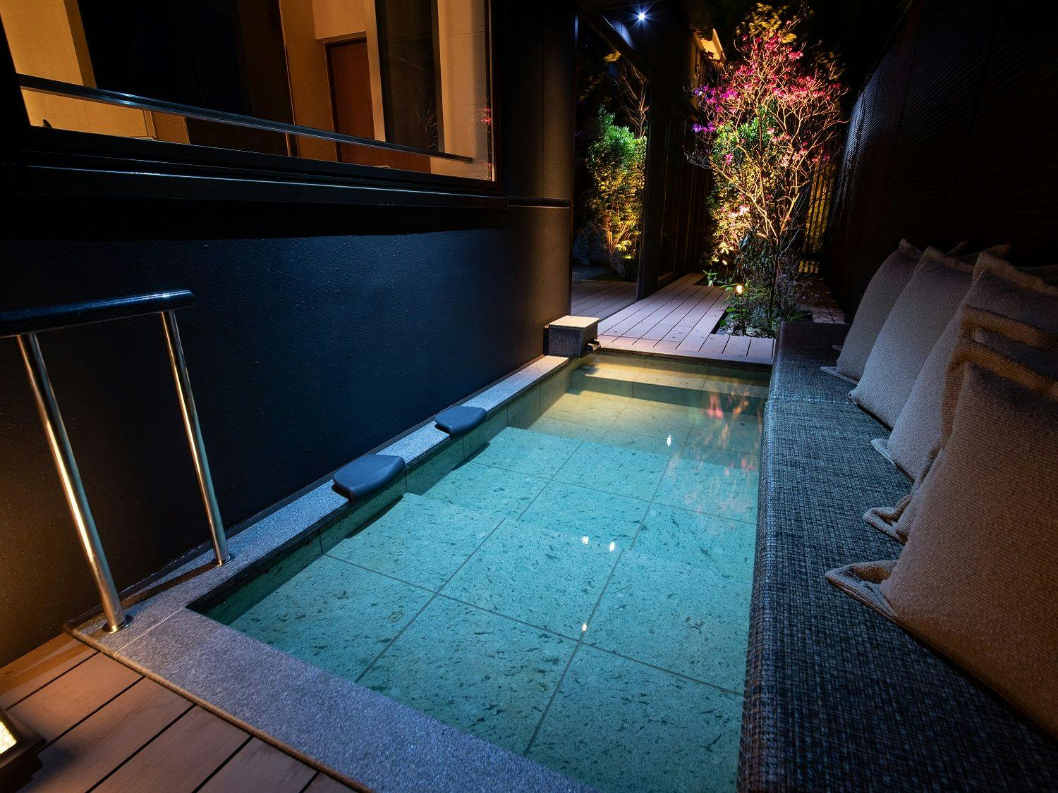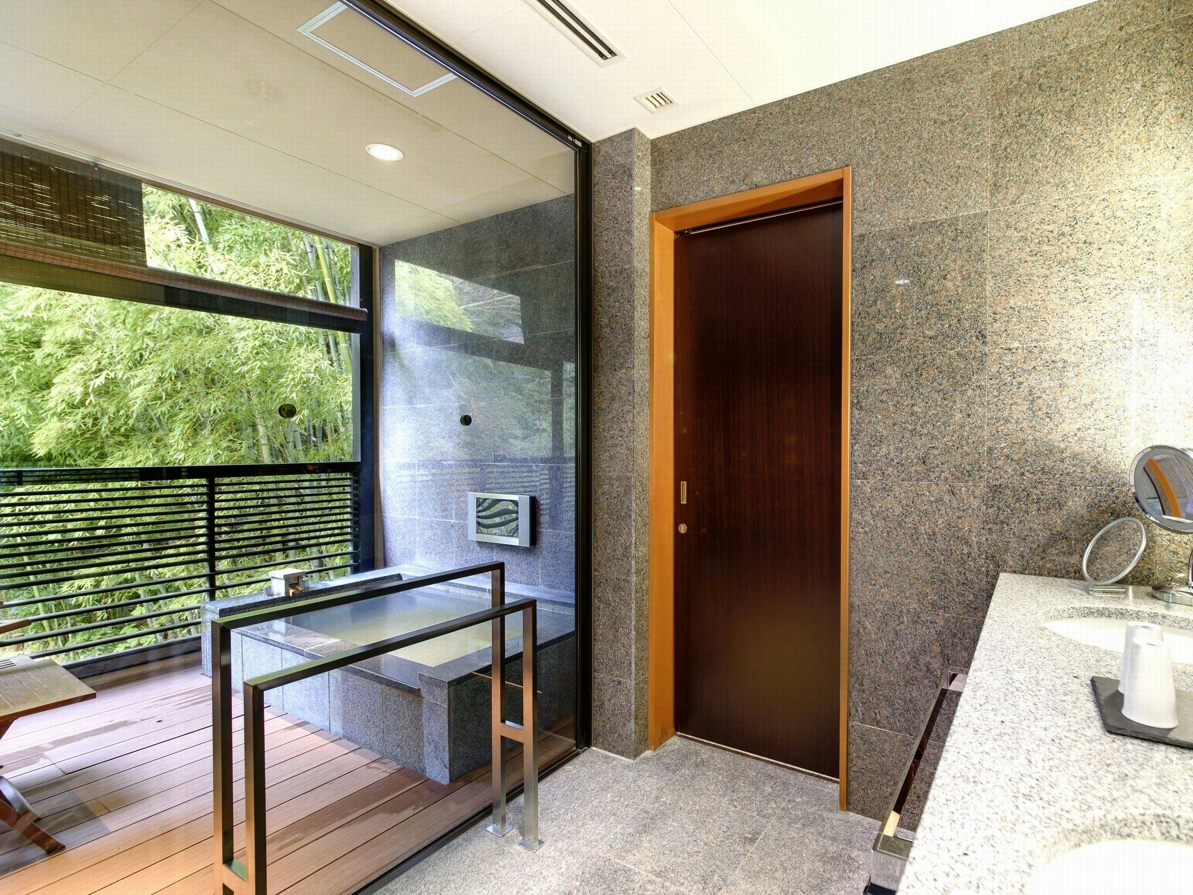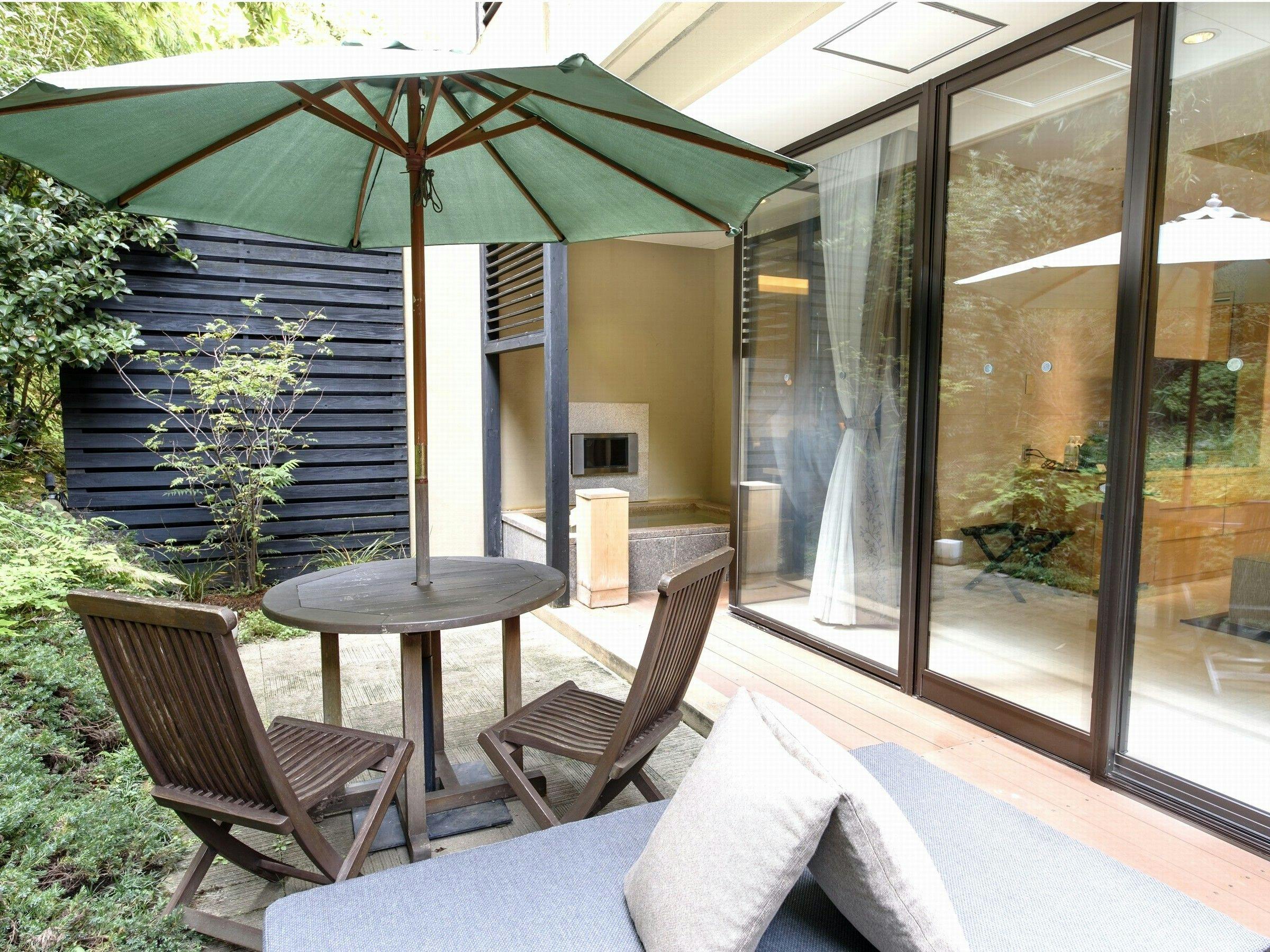 鳥の声が聞こえるプライベートガーデンテラスには、広い露天風呂があります。