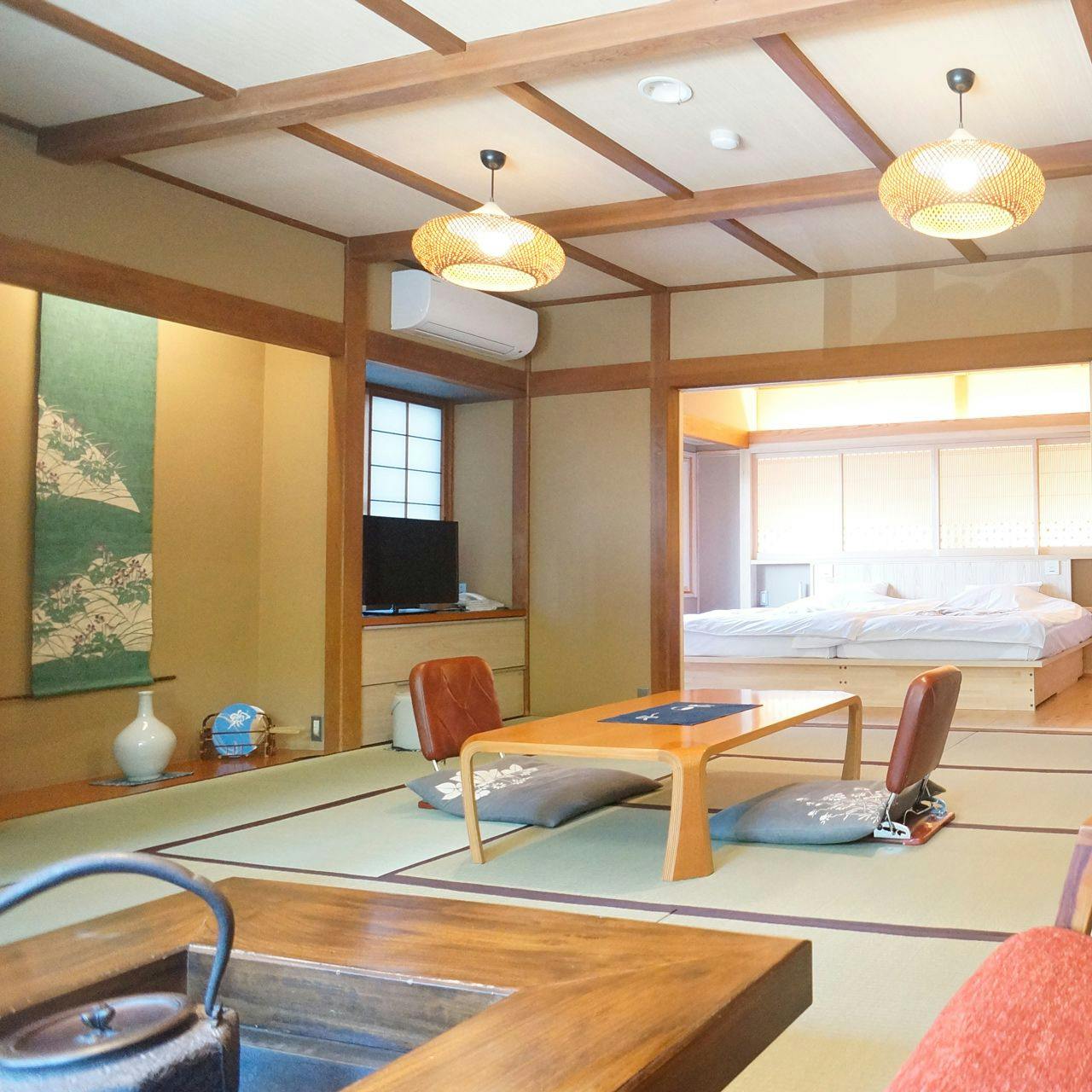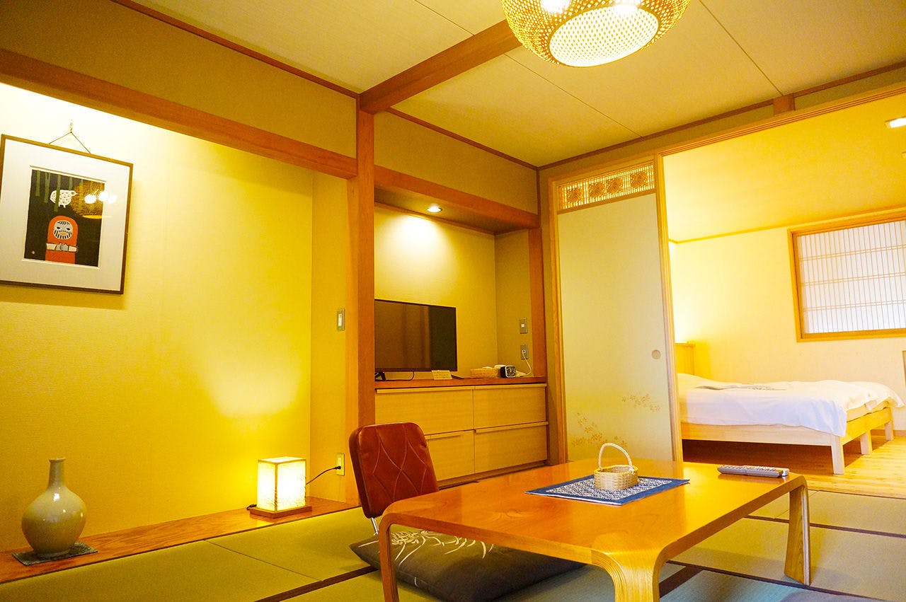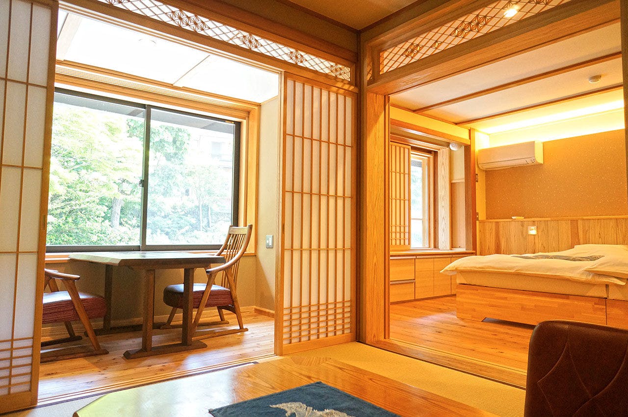 「住吉屋らしさ」を継承する雰囲気を残しつつ居住性を向上させた客室。