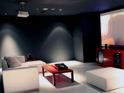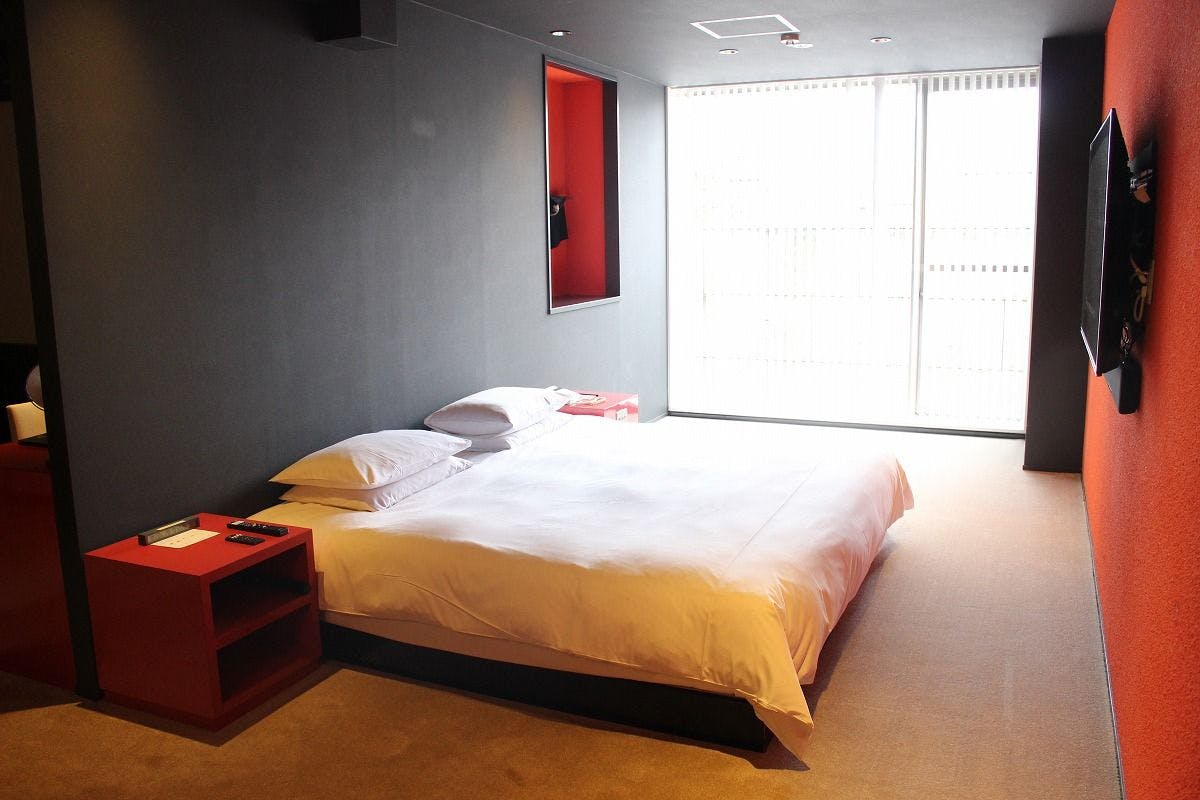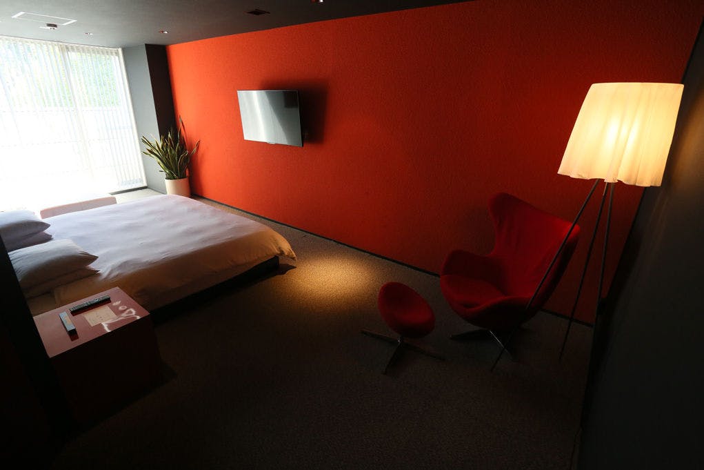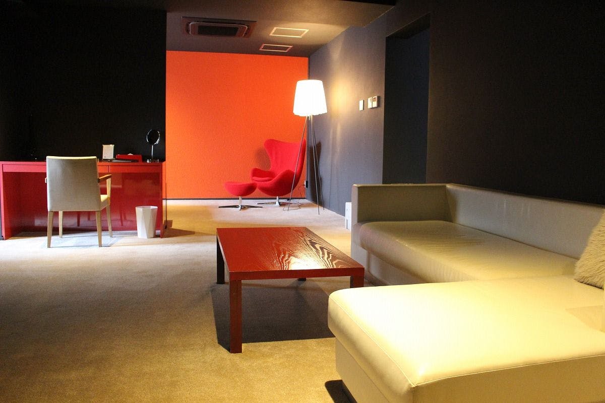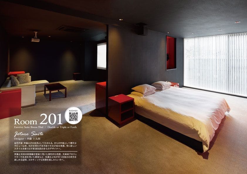斉藤上太郎氏の西陣織を壁面に用いた個性的な部屋。大画面プロジェクターや朱漆を用いた壁面など、快適さと和が持つ力強さの双方を楽しめる空間。エロティックな刺激を楽しみたい方へ。