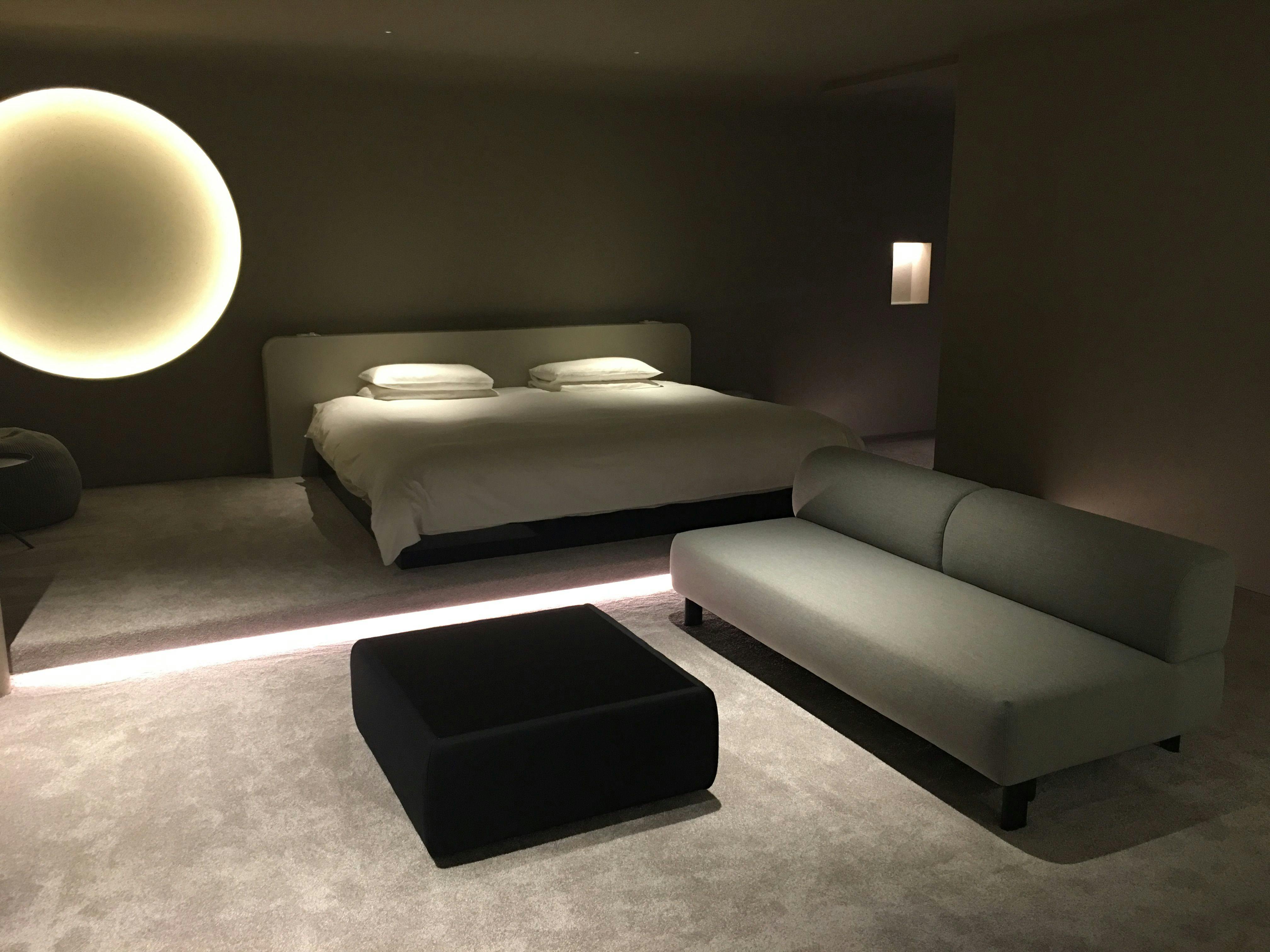 部屋の中に存在する印象的な月が、温かく室内を照らします。気分により月の満ち欠けを変えることで、リラックスしたりエネルギーチャージができるような空間になっています。