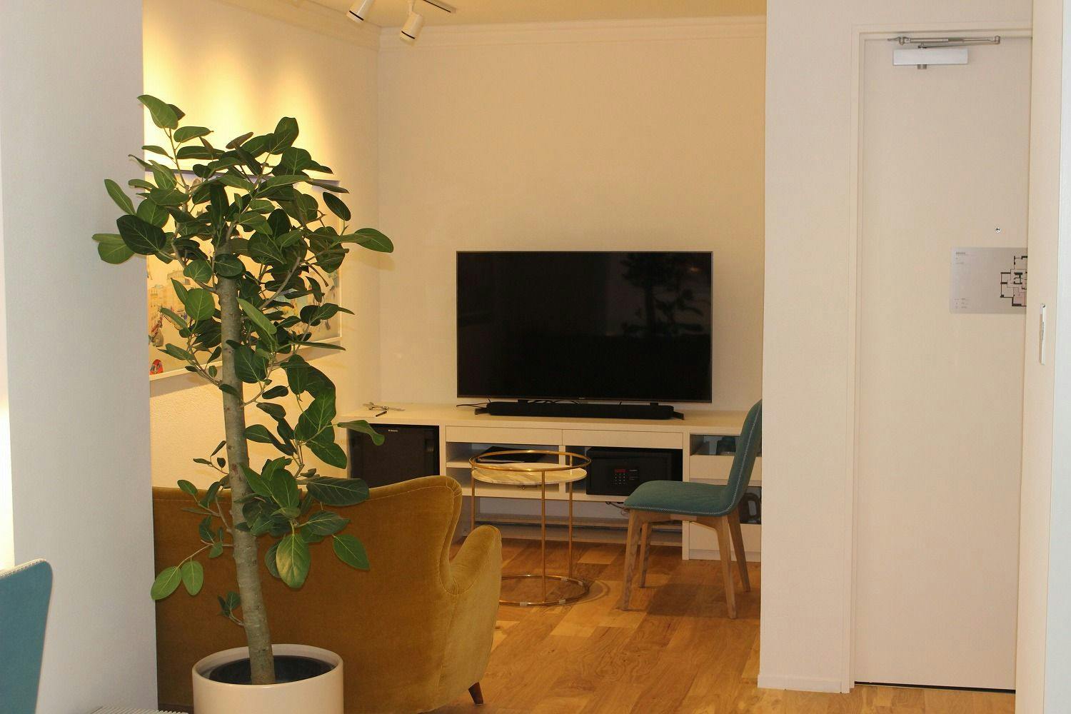 ゆったりとしたソファスペースが特徴的なコンフォタブルでクリーンな空間では
