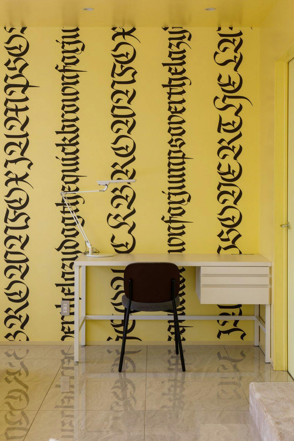 部屋の壁に施された美しいカリグラフィーのデザインが印象的。