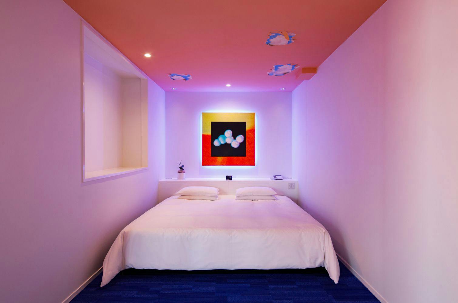 個性的な家具と調和する鮮やかな床や壁が高揚感を抱かせ、非日常に浸ることができる空間となっています。