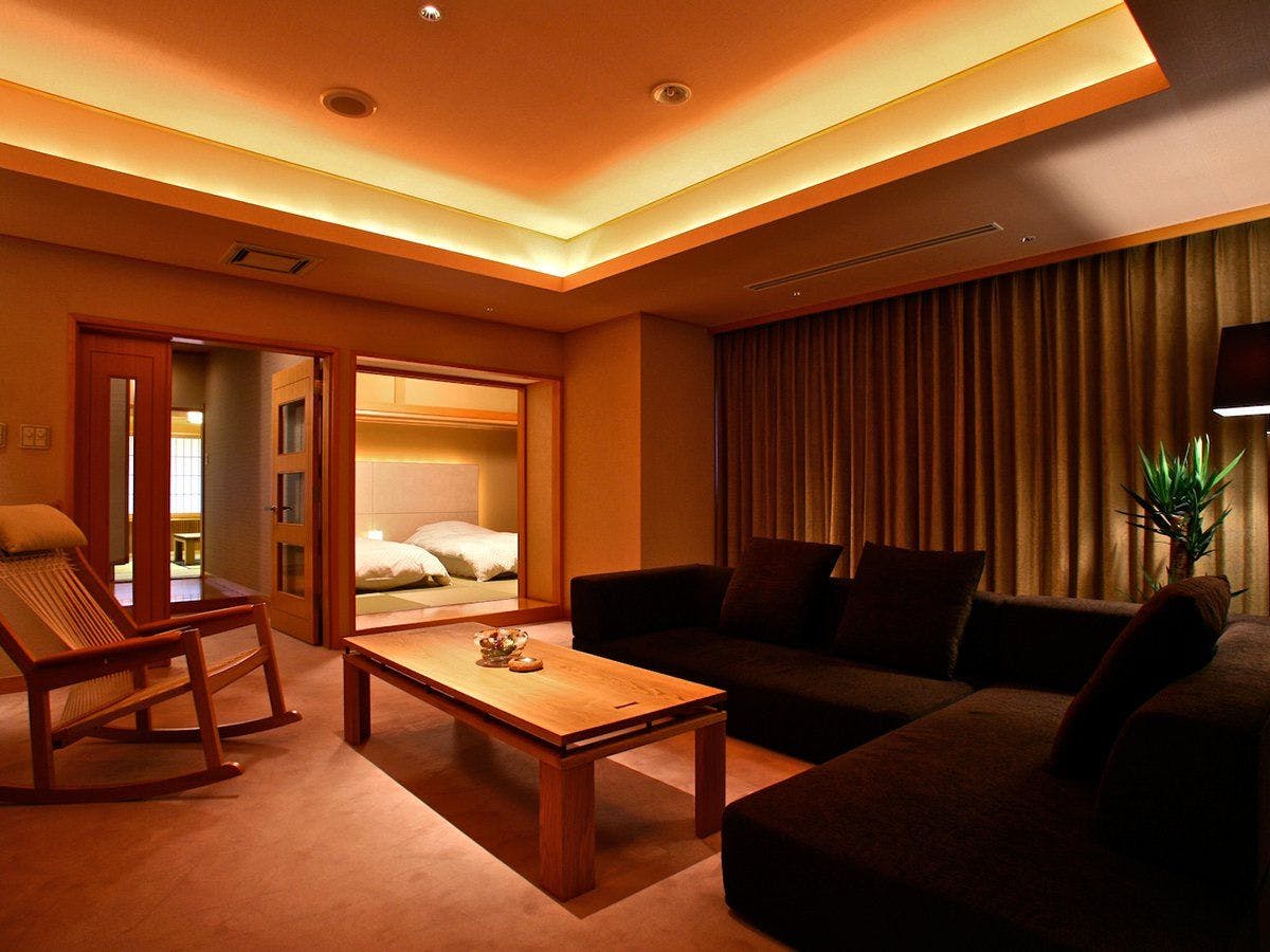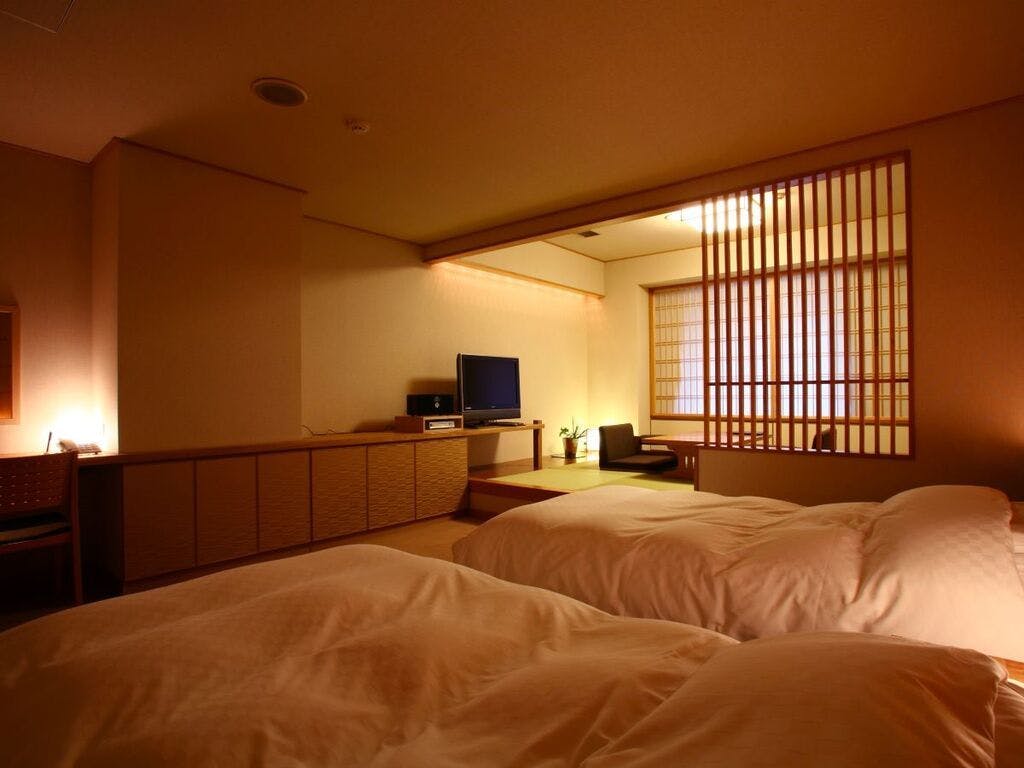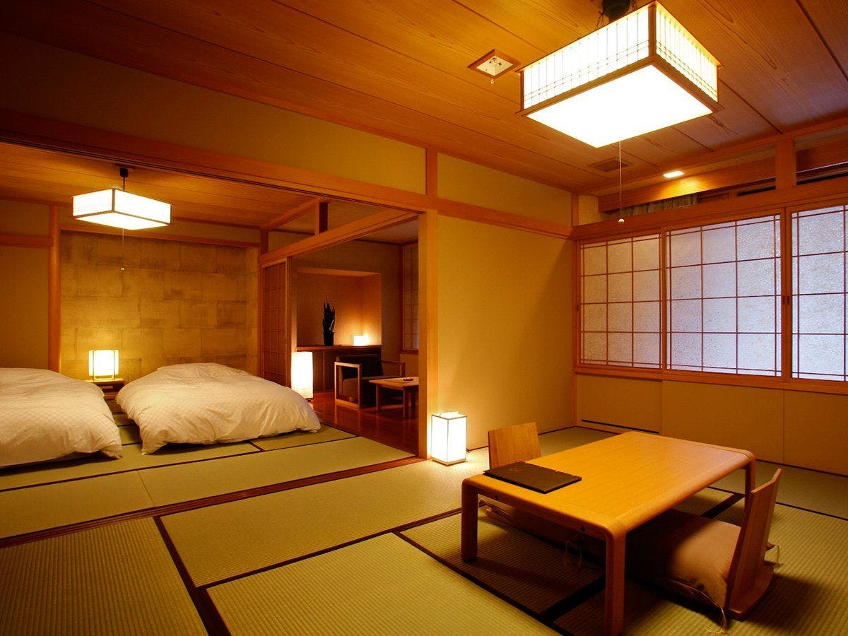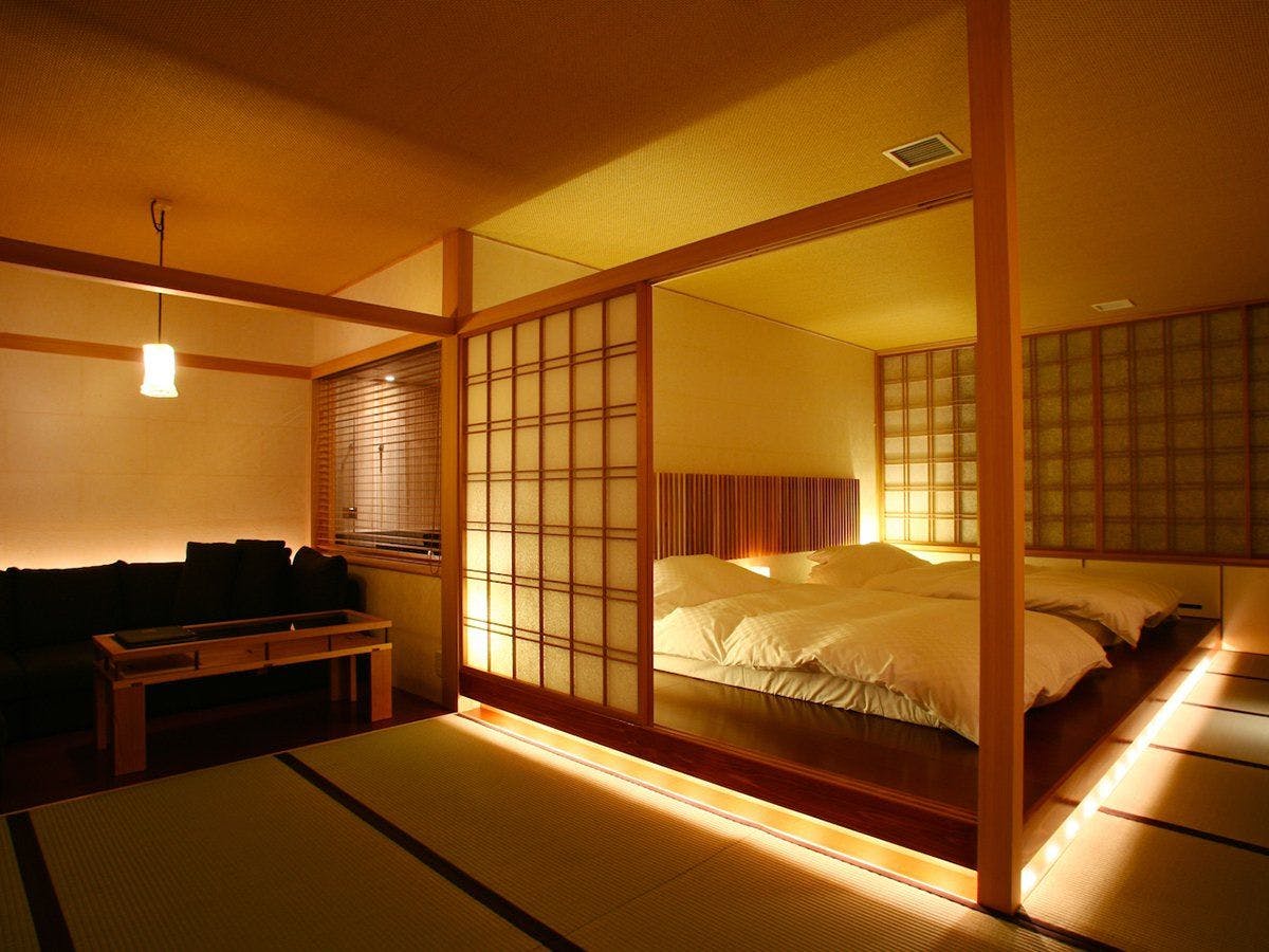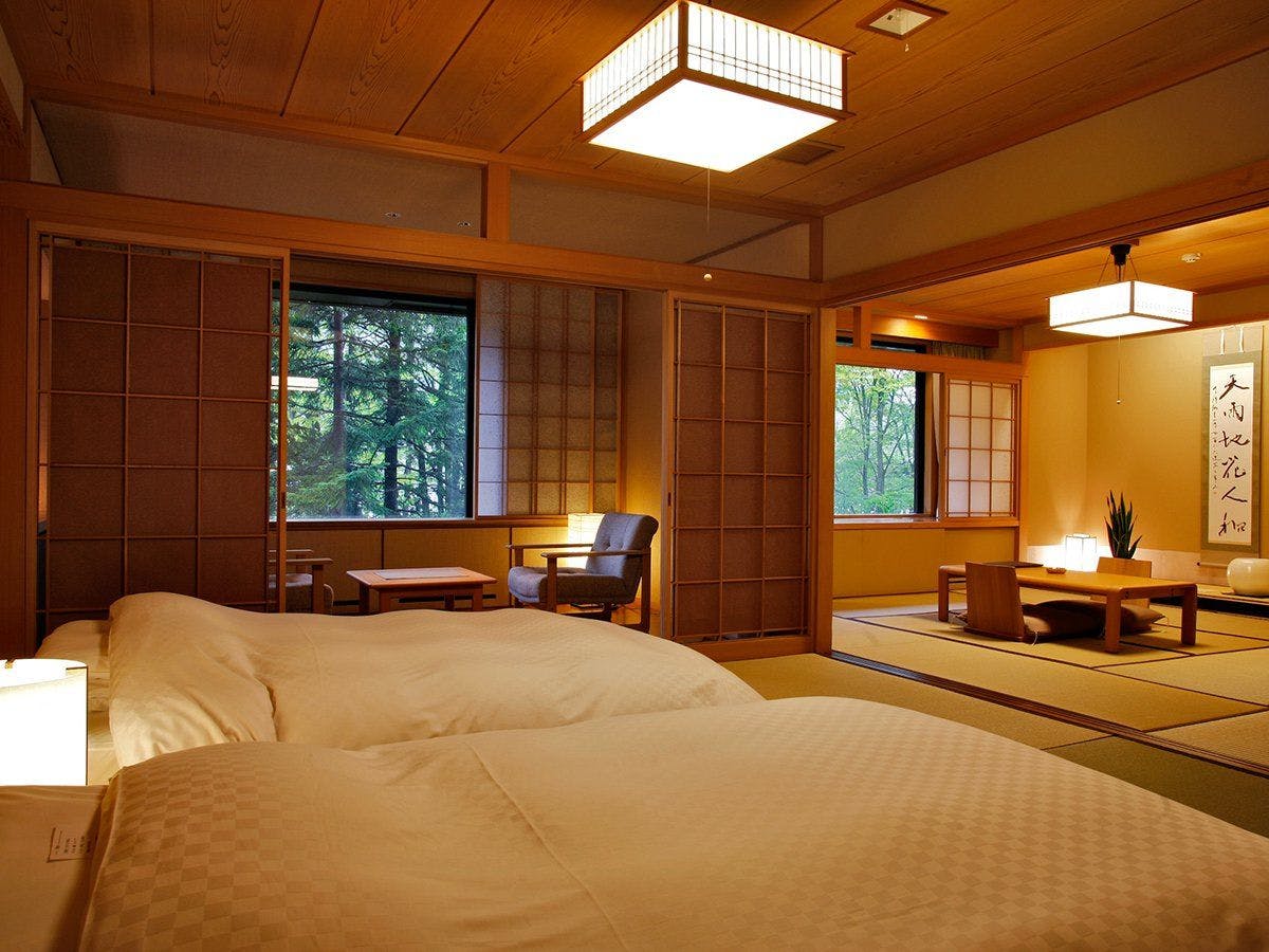 広さ90平米で5名様までご利用いただけます。間取り/ツインベッド+和室10帖+ソファスペース+檜温泉内風呂■お部屋の冷蔵庫フリードリンク■バーフリードリンク■本館の大浴場と、離れの湯屋「森乃湯」もご入浴いただけます(メンテナンスにつき本館休館の場合はご利用いただけませんのでご了承願います)