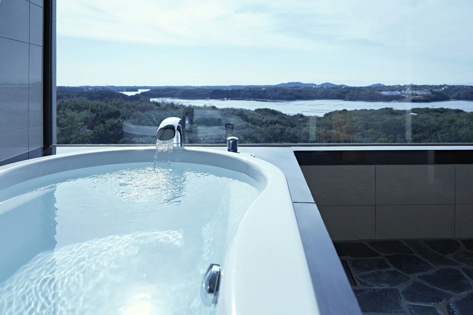 穏やかな英虞湾を眺めながら。邸宅のようにくつろげる広々としたリビングとベッドルーム。こだわりぬいた上質な空間。窓のむこうに広がる穏やかな英虞湾の景色。悠然として、どこか神秘的な時の流れを感じながら読書やカフェタイム、バスタイムをお愉しみいただけます。※画像はイメージです。眺望は客室により異なります。
