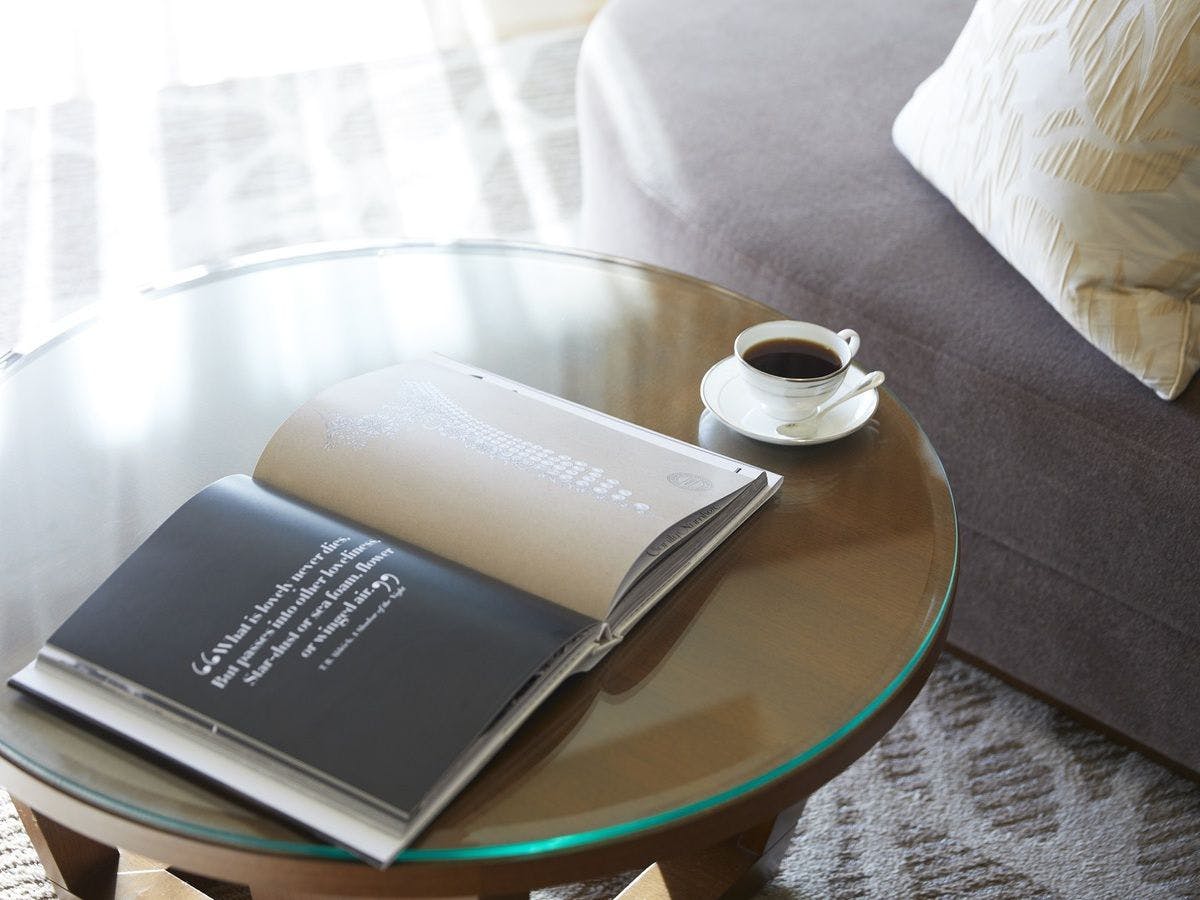 窓のむこうに広がる海や森の景色。邸宅のようにくつろげる広々としたリビングとベッドルーム。こだわりぬいた上質な空間。窓のむこうに広がる海や森の景色。悠然として、どこか神秘的な時の流れを感じながら読書やカフェタイム、バスタイムをお愉しみいただけます。※画像はイメージです。眺望は客室により異なります。