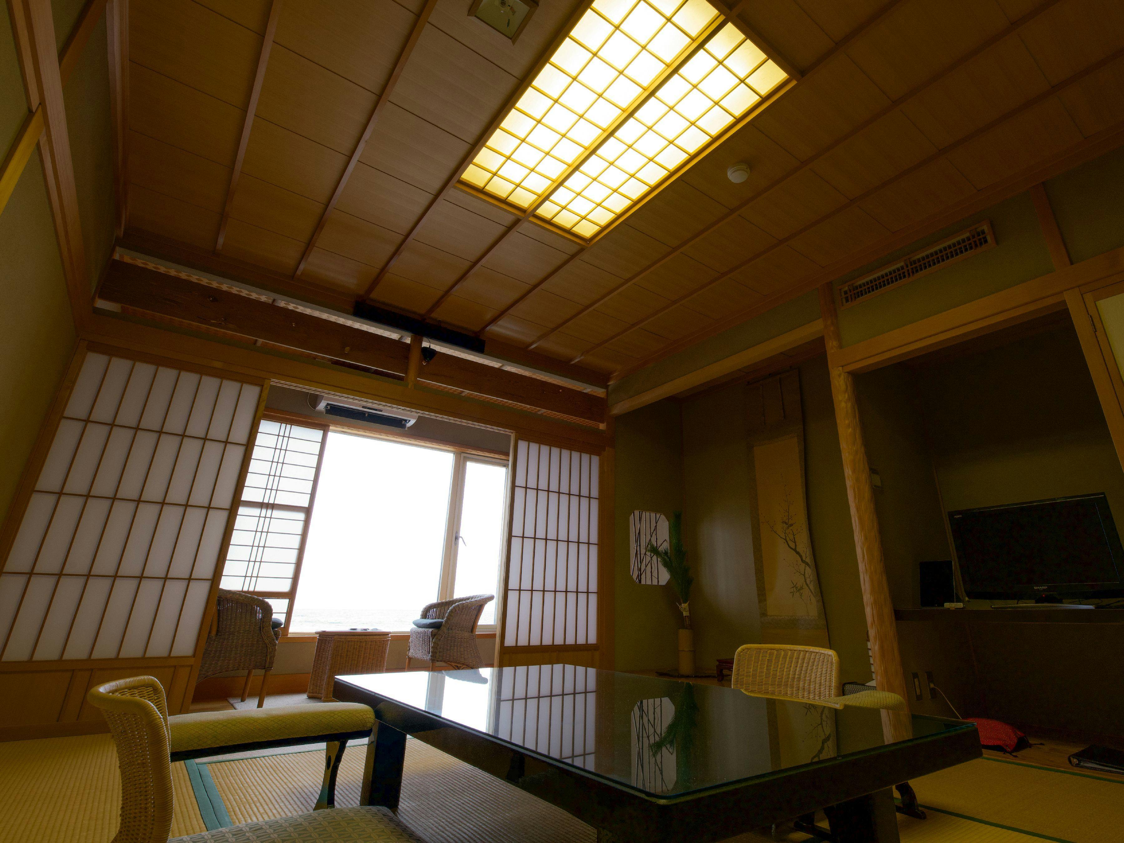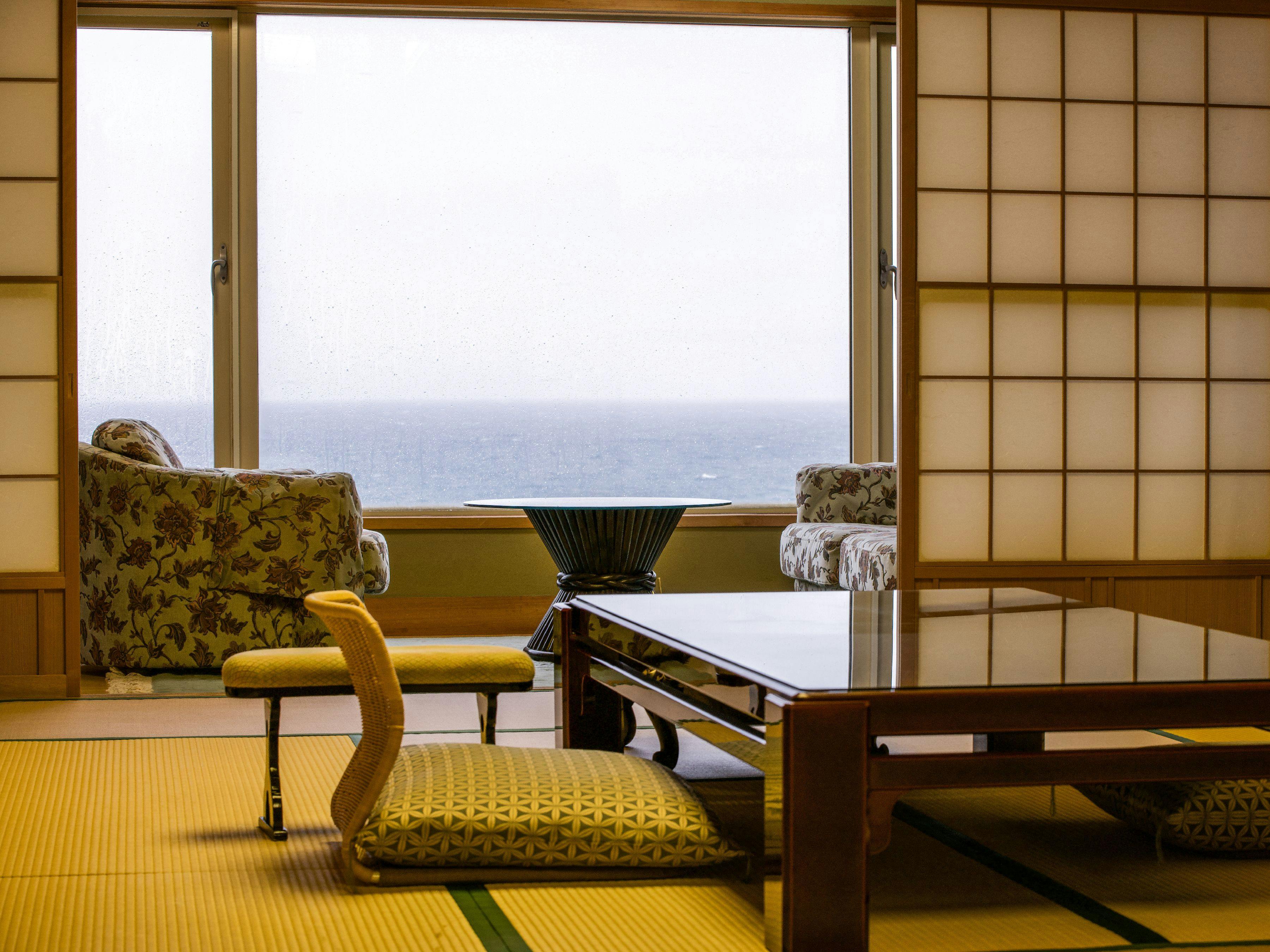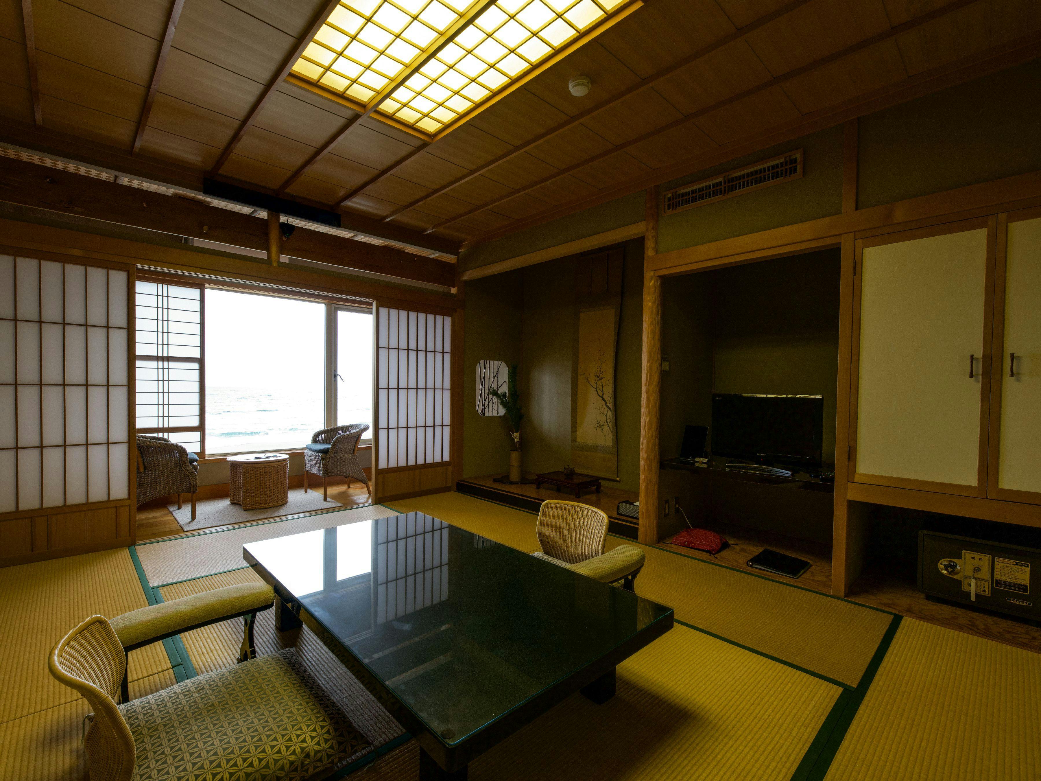 二間続きのゆったりとした客室。お部屋からは津軽海峡・下北半島を望む絶景。