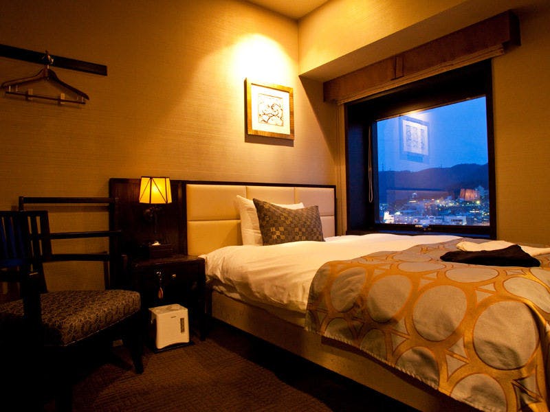 ~大正浪漫~■市街地側の眺望■○シモンズ社製ベッド(1200mm×2050mm)を2台設置。○レトロな雰囲気のお部屋○地デジ対応液晶テレビ(40インチ)○高速インターネット接続無料○温水洗浄機付トイレ※お部屋にはユニットバス付、シャワーはハンスグローエ(ドイツ製)のシャワーヘッドを導入。切り替え式でお好みに合わせてご利用くださいませ。
