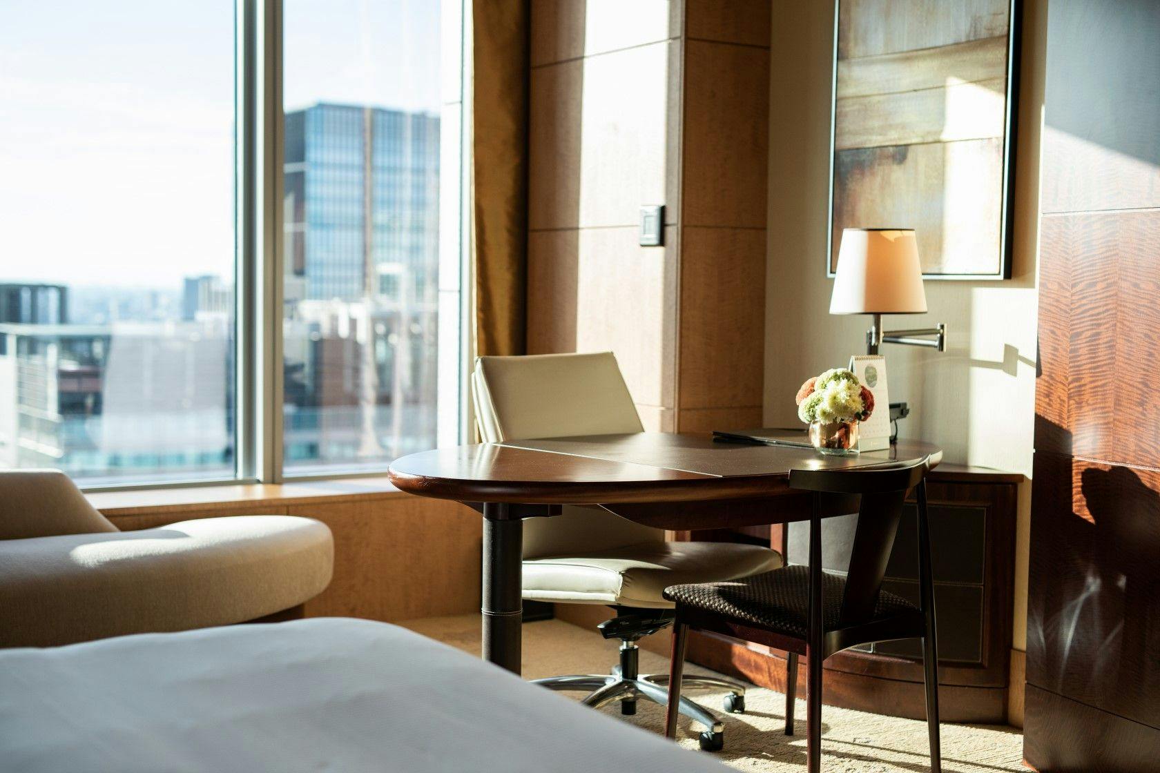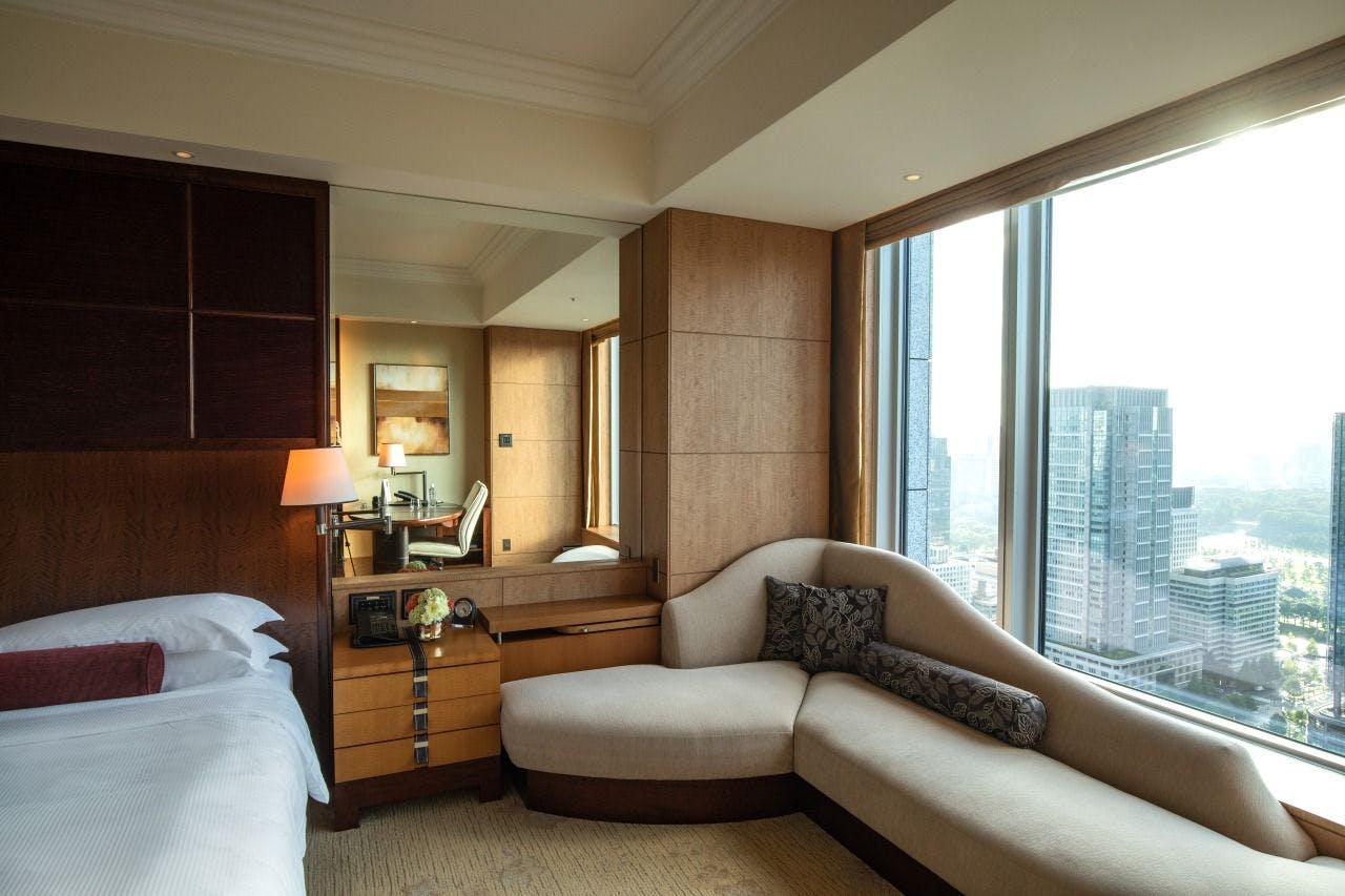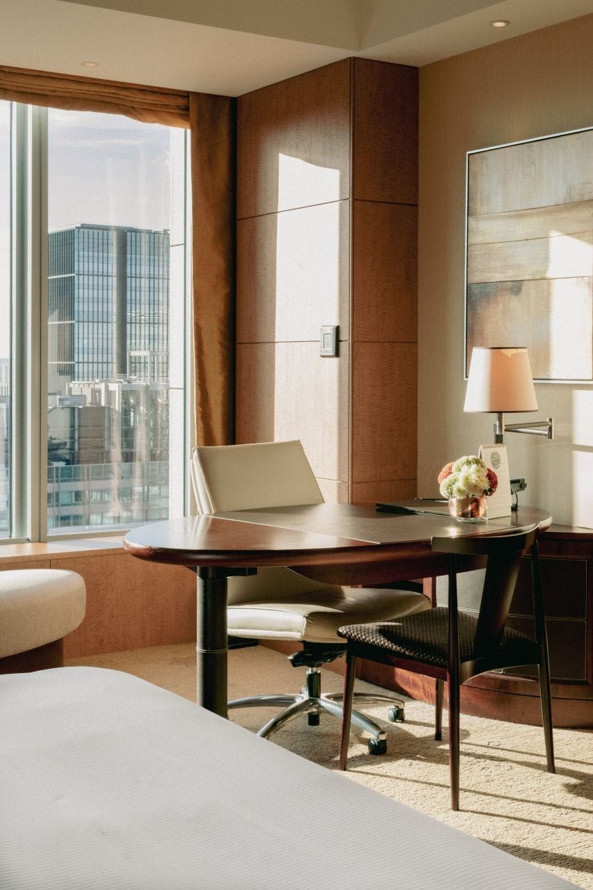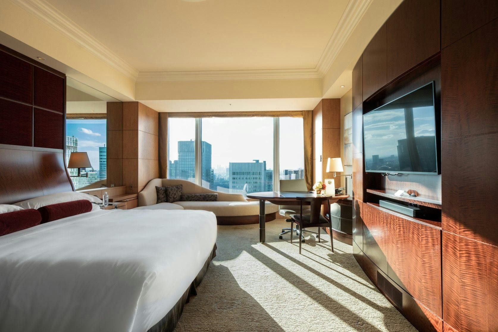 オリエンタルなエッセンスを加え、エレガントな雰囲気のリビングルームを有するプレミアスイートは、スタイリッシュなアパートメントのようなお部屋。ウォークインクローゼットを備え、より豊かなご滞在をお約束いたします。窓からは明るい陽が差し込み、都心の絶景をお楽しみいただけます。