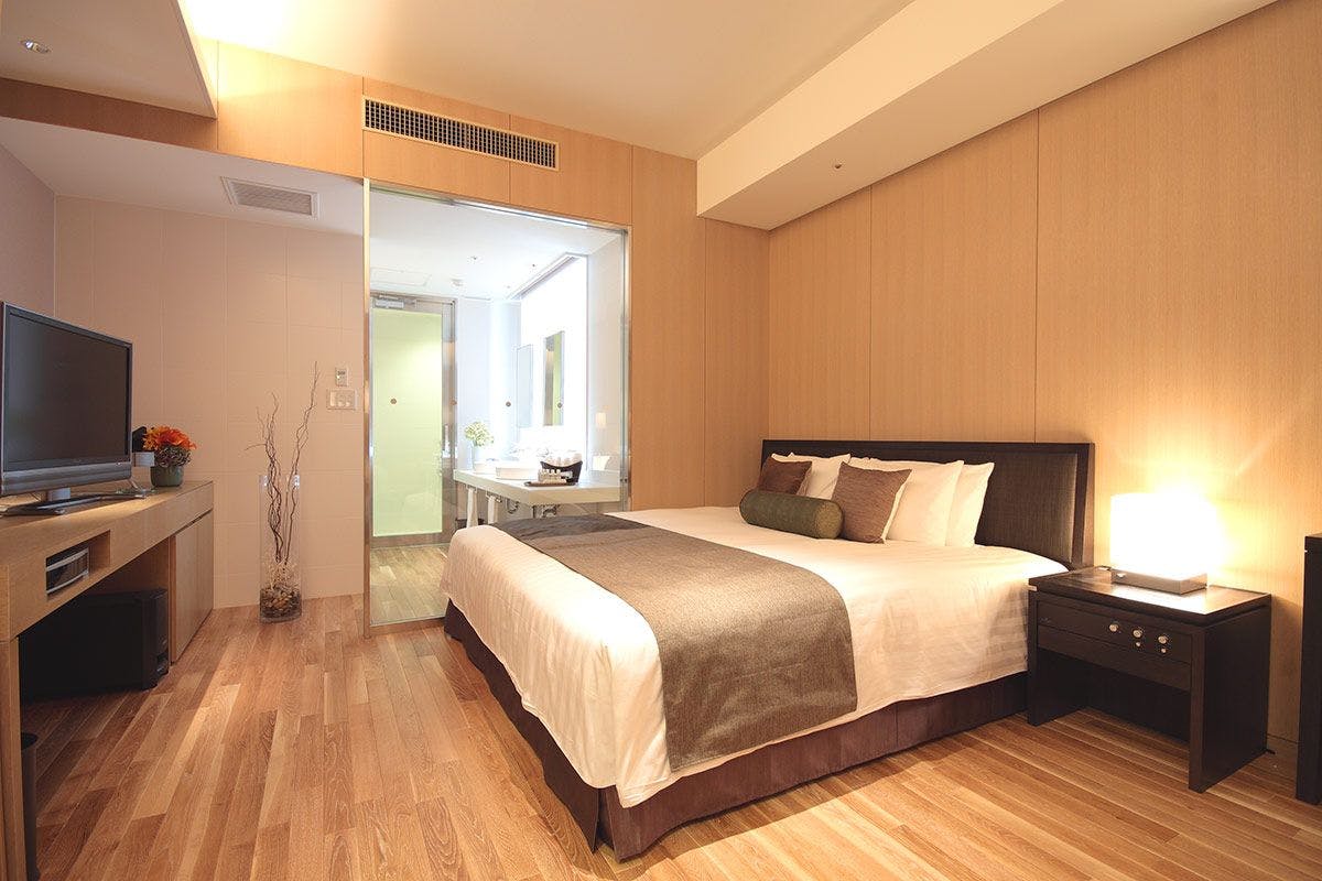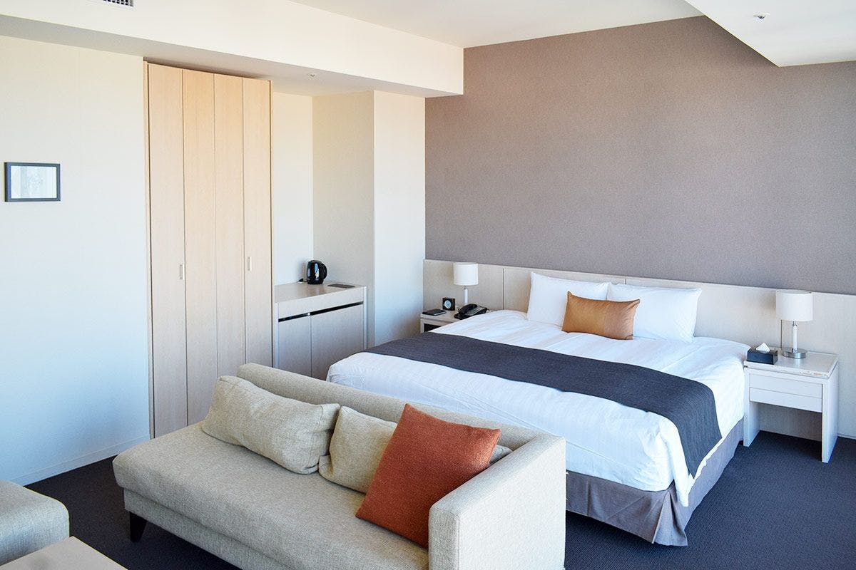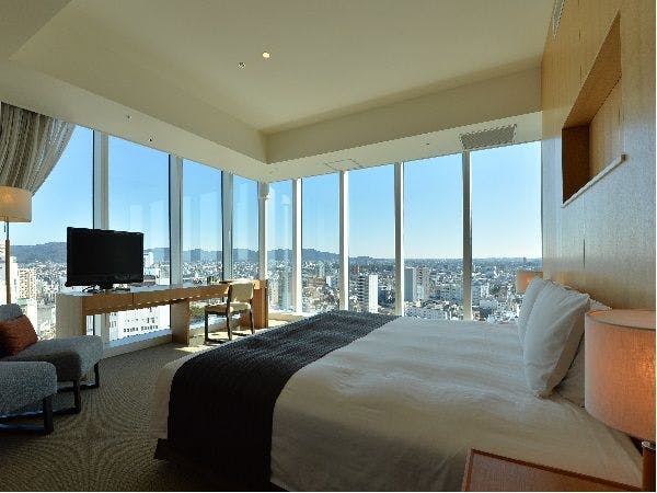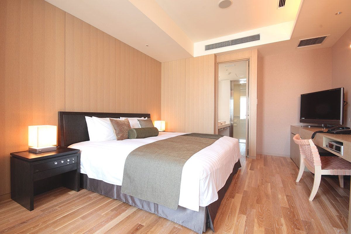 ■エグゼクティブフロア(10階)/禁煙室 ■200cm×200cmキングサイズベッド×1台(シモンズ製 6.5インチ ダブルクッション)■バス・トイレセパレート(ジェットバス付) ■バスアメニティ「Waphyto」 ■BOSE製2.1chホームシアターセット ■42型4Kテレビ設置 ■ミニバー(有料) ■ネスプレッソマシーン