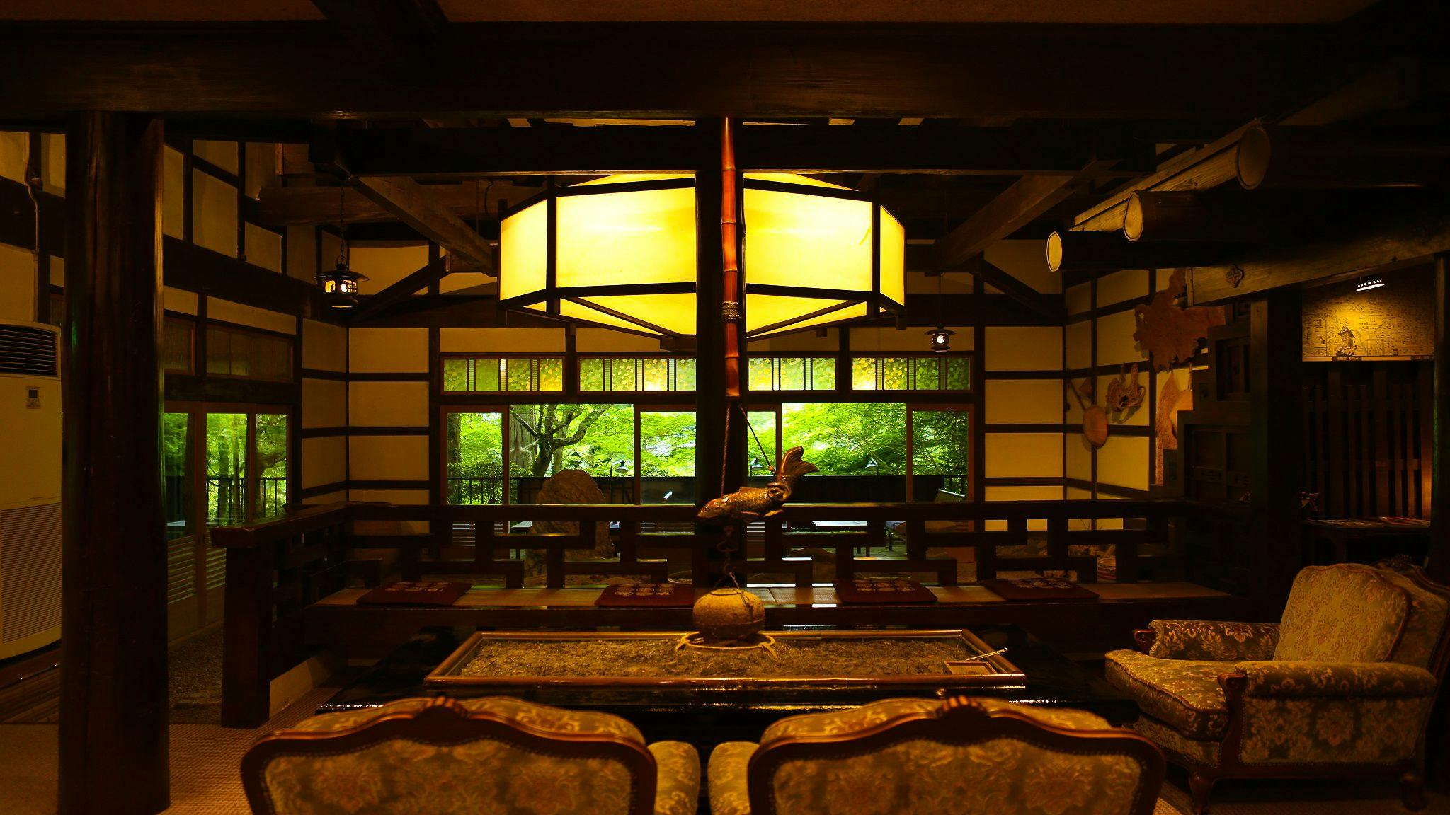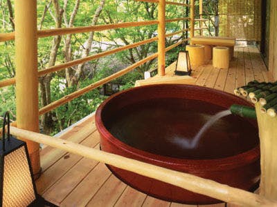 和室8畳2間続きのお部屋と専用露天風呂付露天風呂は十和田石と檜と北山杉で出来ており、日頃の疲れを癒していただきます。お部屋から季節の移ろいと美しい自然をお楽しみ頂けます。