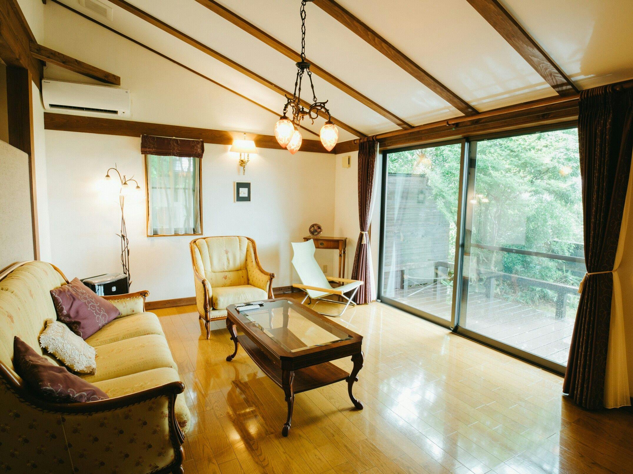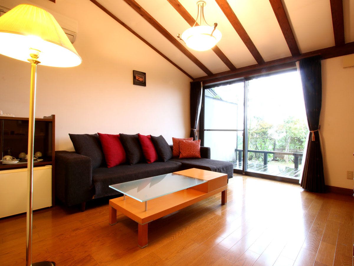 テラスへと続く広い窓からは瀬の本高原の雄大な広がり、その向こうには阿蘇五岳をのぞみます。気持ちのいい風が訪れる木立が見える部屋もございます。