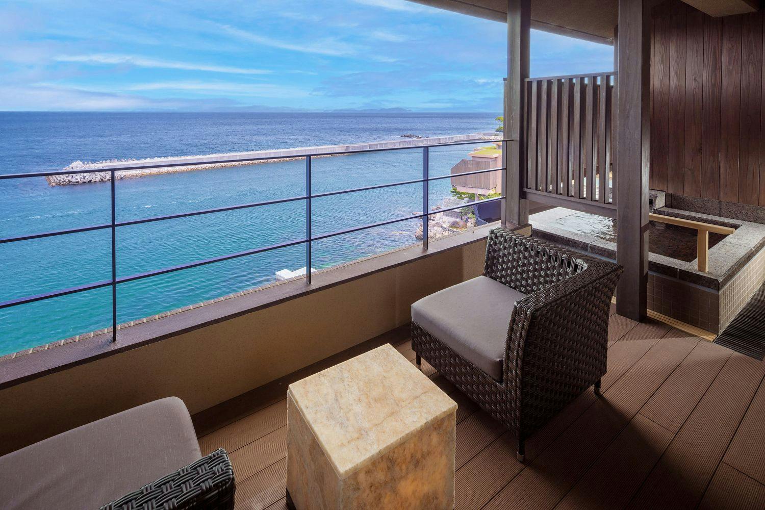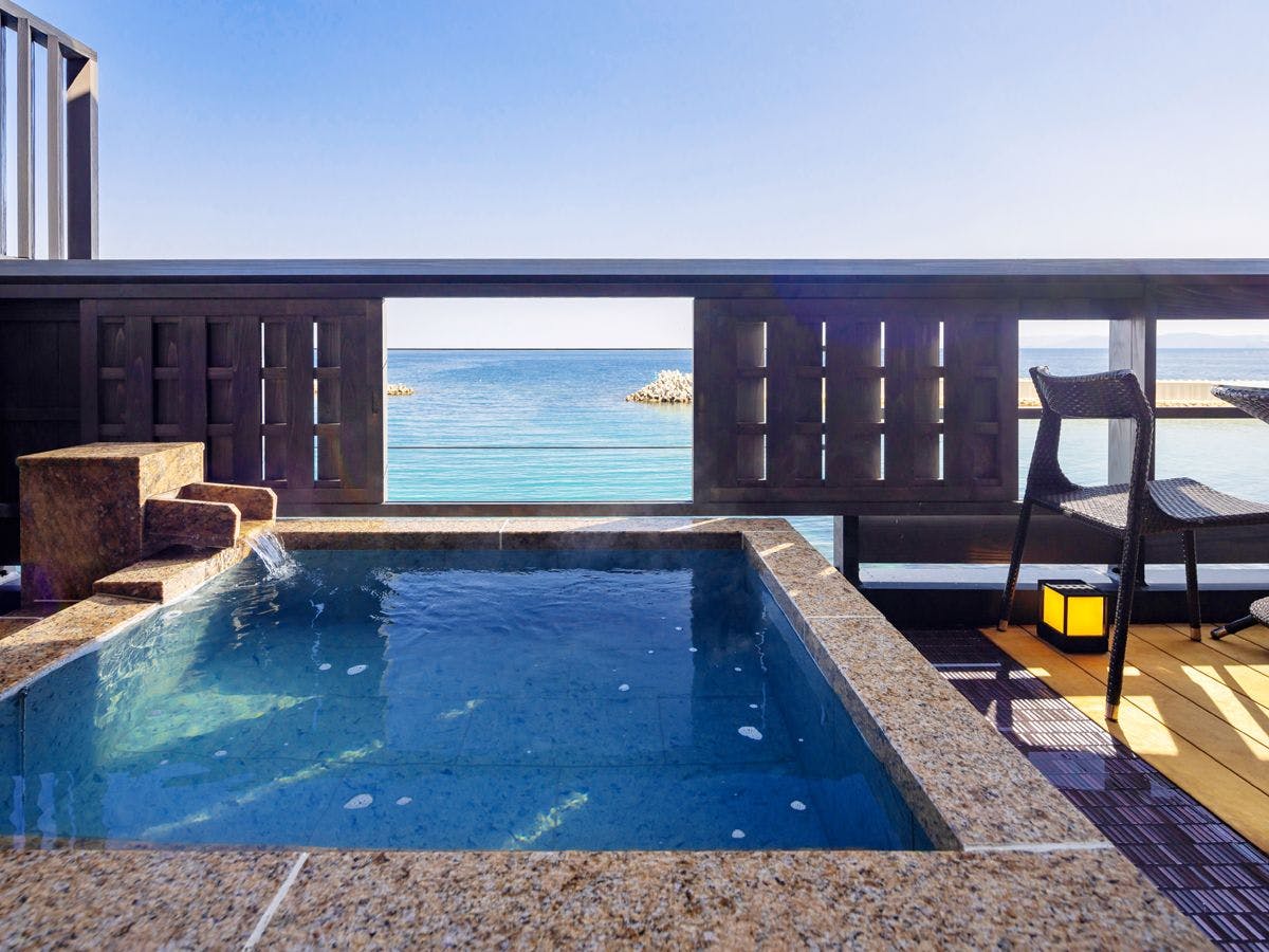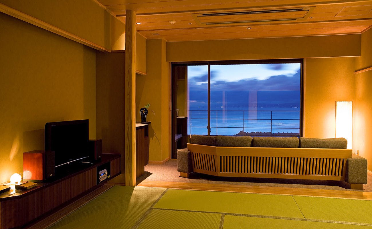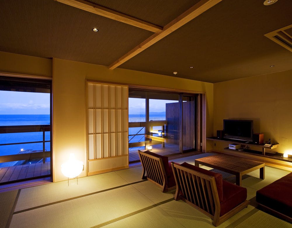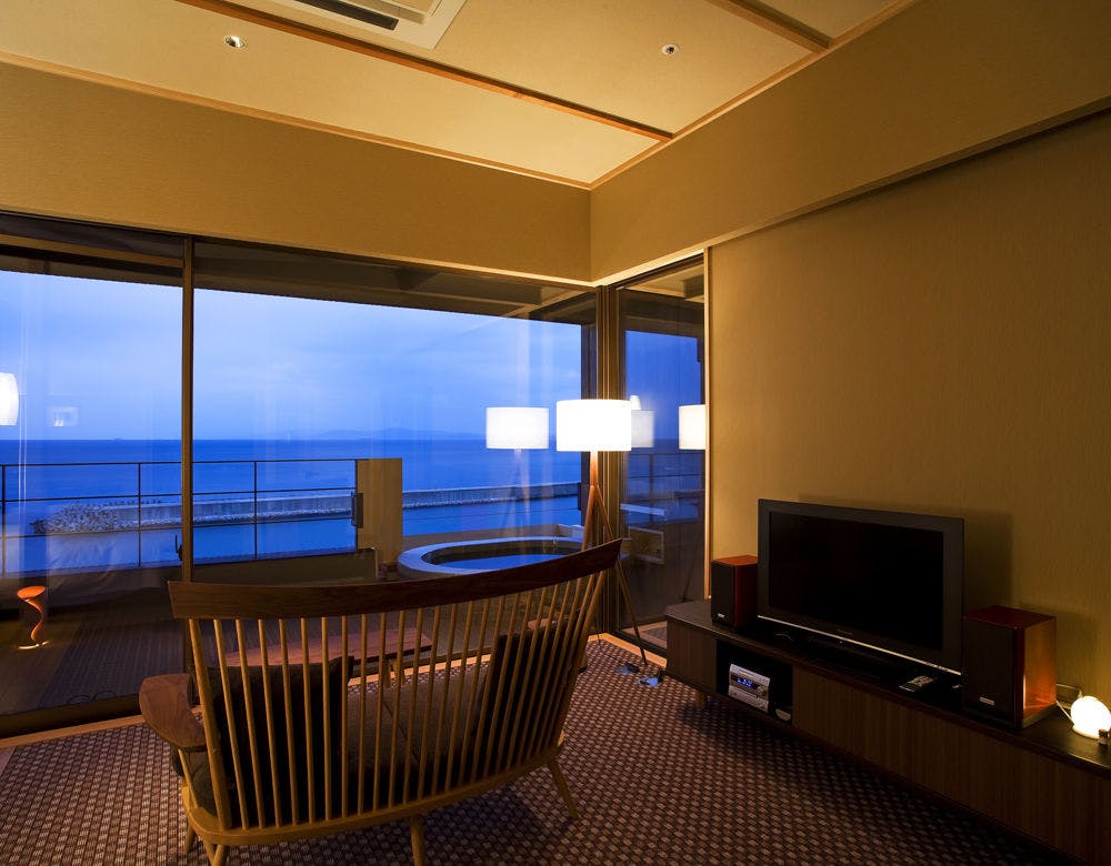 天原全18室の中で4室(内3室禁煙室)からなる和洋室タイプ。忙しい日常から離れ、すべてのものから開放される海辺の贅沢なひと時。ゆっくりと流れる自分だけの休日をお過し下さいませ。