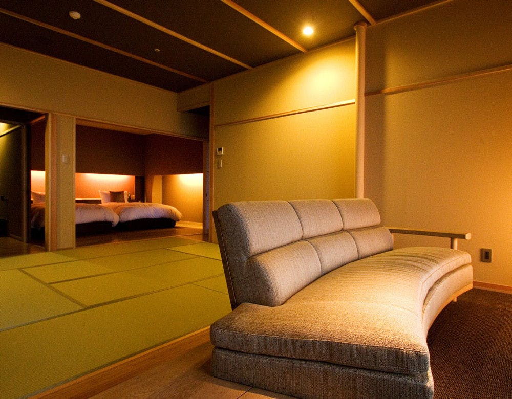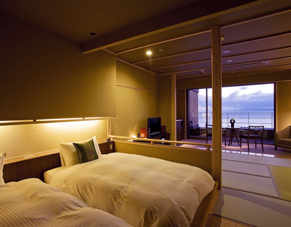 天原全18室の中で8室(内6部屋は禁煙室)からなるスイートルーム。ゆったりお寛ぎ頂ける和室10帖とツインのお部屋は仕切りがあり、家族3世代のご旅行におススメのお部屋タイプです。忙しい日常から離れ、すべてのものから開放される海辺の贅沢なひと時。ゆっくりと流れる自分だけの休日をお過し下さいませ。